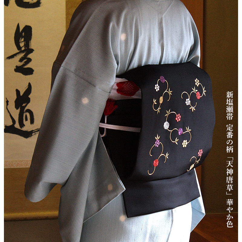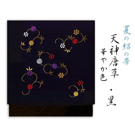 夏の新塩瀬帯「天神唐草・華やか色」 絽・黒地