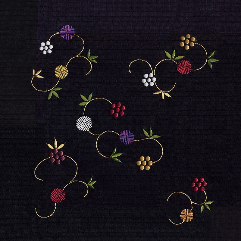 機械刺繍に配した優美な趣の金駒刺繍が、美しさを際立たせる名品。名物裂の意匠をくっきりと刺繍した、井澤屋の定番柄の夏帯です。