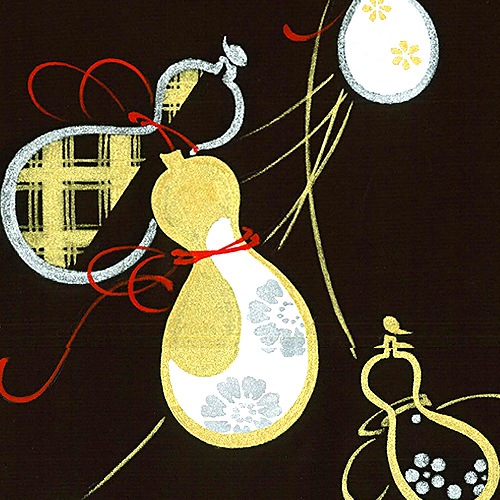 除災招福や魔除けとしても用いられる、瓢箪を手描きした吉祥柄の帯です。お太鼓の部分に描かれた6つの瓢箪は、無病(六瓢)息災のお守りになるとされる縁起物。正絹のような滑らかな黒地に、金銀の瓢箪が良く映えるシックなお品です。季節を問わず、おめでたい席や、普段のお出かけにもお使いいただけます。