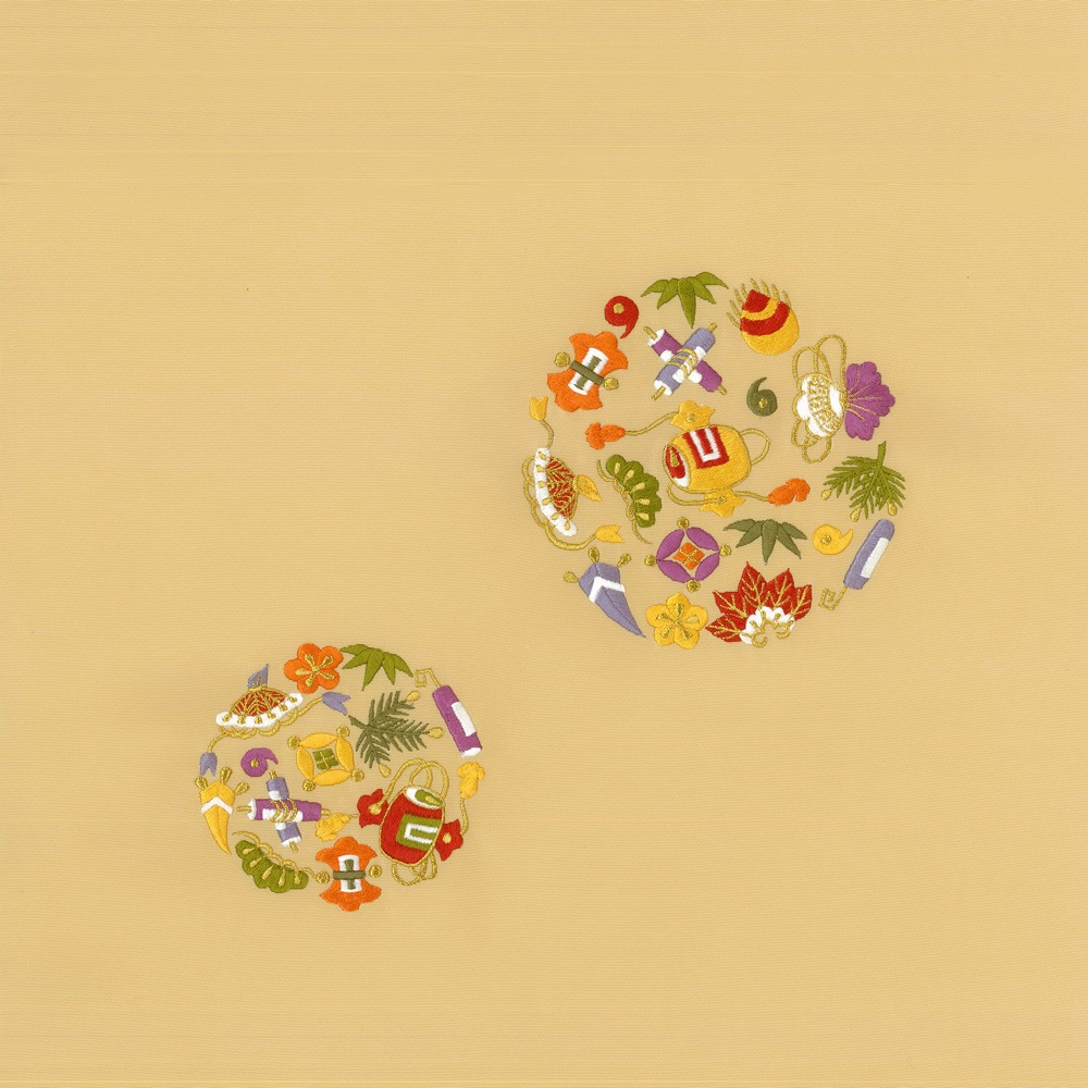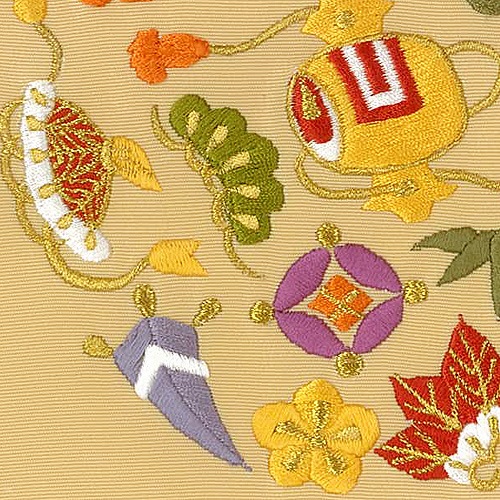 豊かな色どりでさまざまな縁起物を刺繍した、宝尽くしの塩瀬帯です。