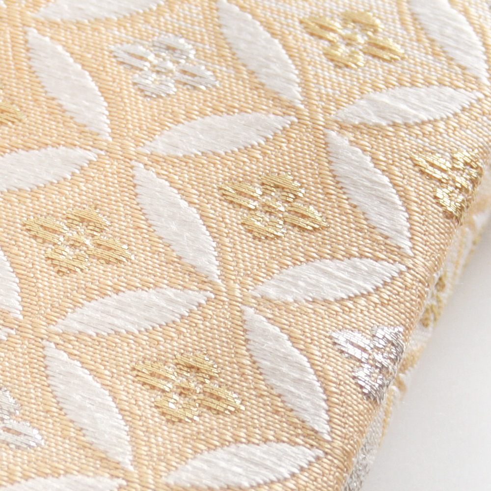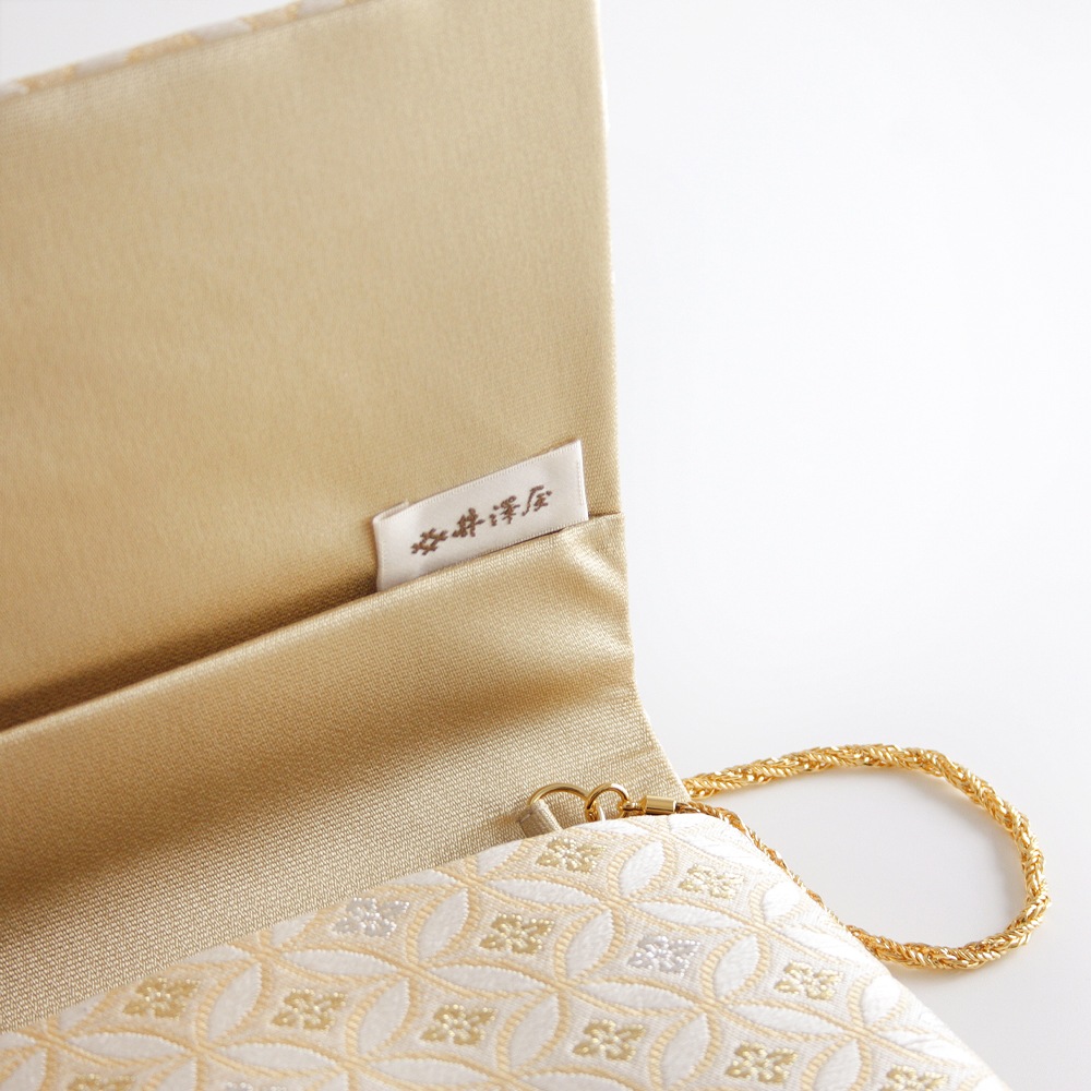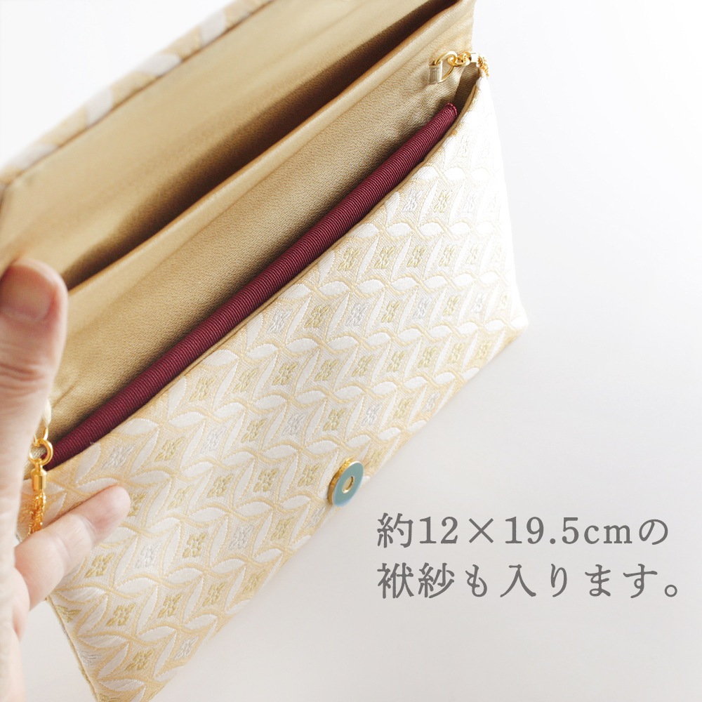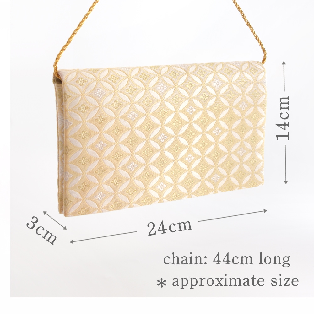 淡いオレンジベージュと白のグラデーションに、縁起の良い七宝文と控えめな金銀の花菱文の織柄が上品な、優しい印象のパーティーバッグです。チェーンを中に収納できるため、クラッチバッグ・チェーンバッグの2wayでお使いいただけます。