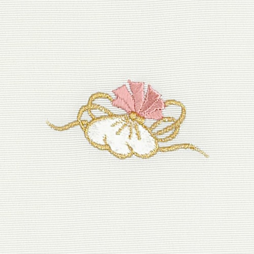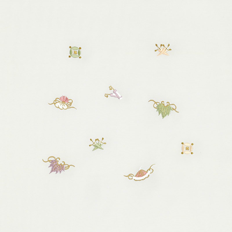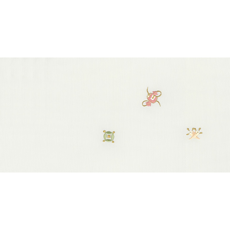 巻物や七宝、宝袋といった吉祥文様を刺繍した、宝尽くしの新塩瀬帯です。グレー地に淡いお色目の小ぶりの刺繍が可愛らしく、お着物と合わせますとすっきりと引き締まった印象になります。おめでたい柄ですので卒入学式などのフォーマルな場やお正月はもちろん、普段の装いにもぜひどうぞ。