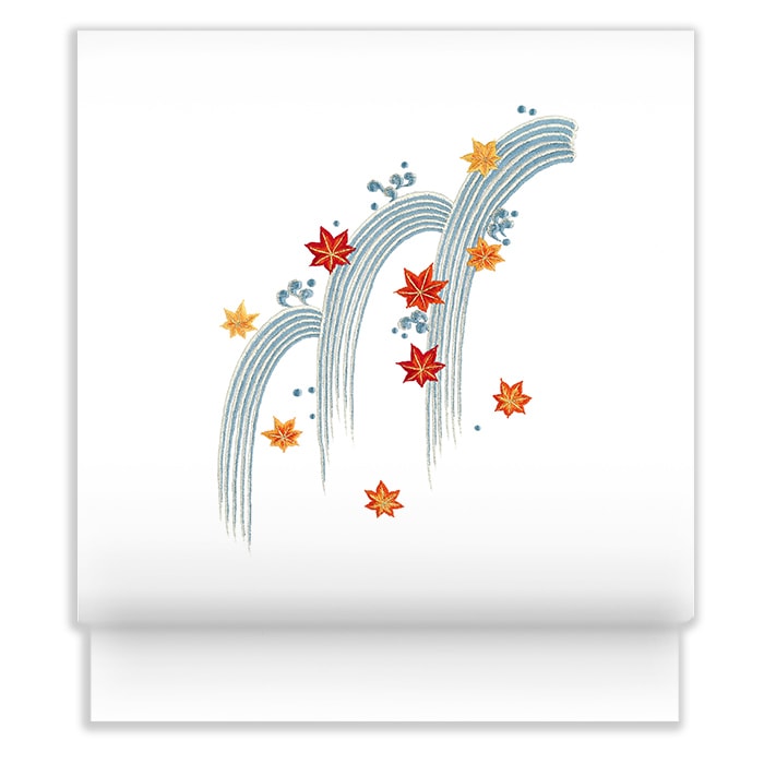 滝に流れる紅葉を刺繍で表現した新塩瀬帯です。すっきりとしたデザインですので、どんな柄のお着物にも合わせやすく、帯締めや帯揚げで幅広いコーディネートをお楽しみいただけます。