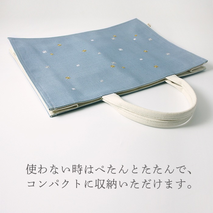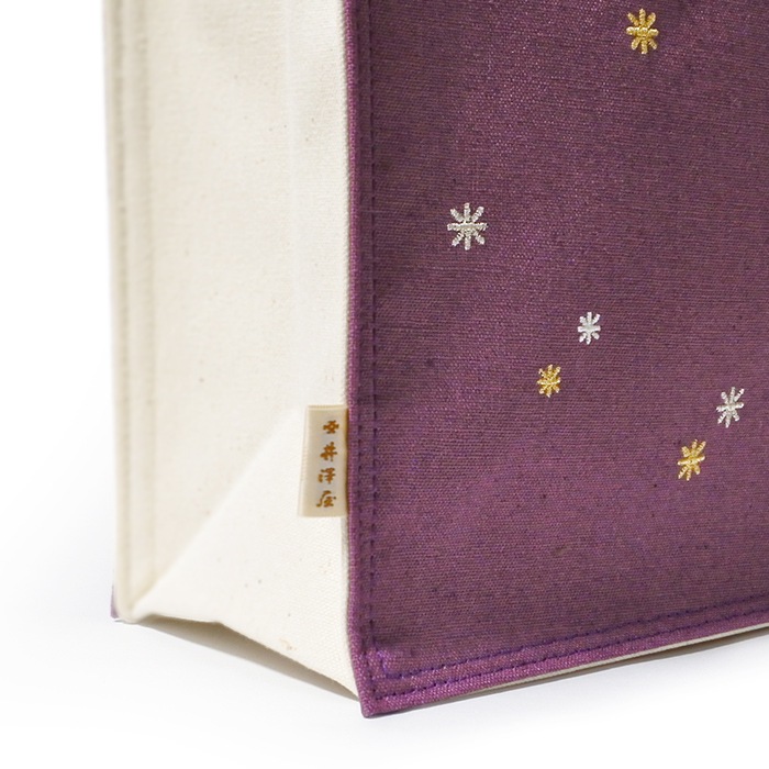 お稽古バッグやサブバッグとしてお使いいただける、A4サイズのトートバッグです。多彩なお色に星空をイメージした金銀の刺繍が華やかな雰囲気。持ち手とマチはしっかりとした丈夫な帆布、内側はナイロン系の生地を使用しており、3ヶ所ある内ポケットは、スマートフォンや貴重品の収納に便利です。A4サイズまでの書類やタブレット、折りたたみ傘なども入り、大きめの荷物のお持ち歩きにちょうど良い大きさです。お着物やお洋服と合わせてぜひどうぞ。