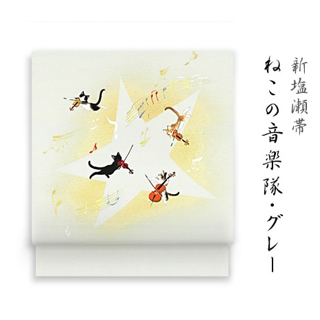 新塩瀬帯「ねこの音楽隊」 グレー地