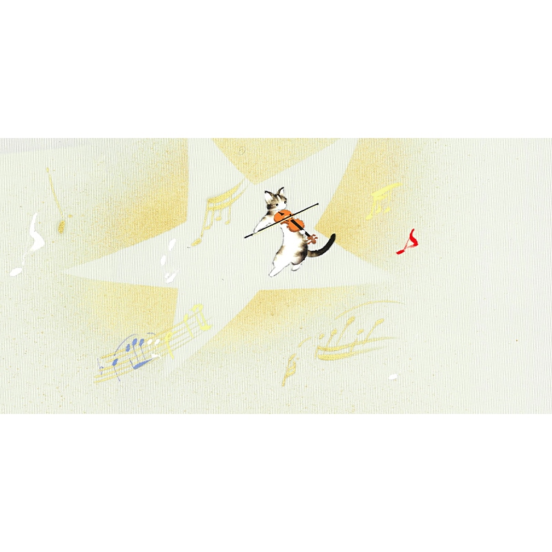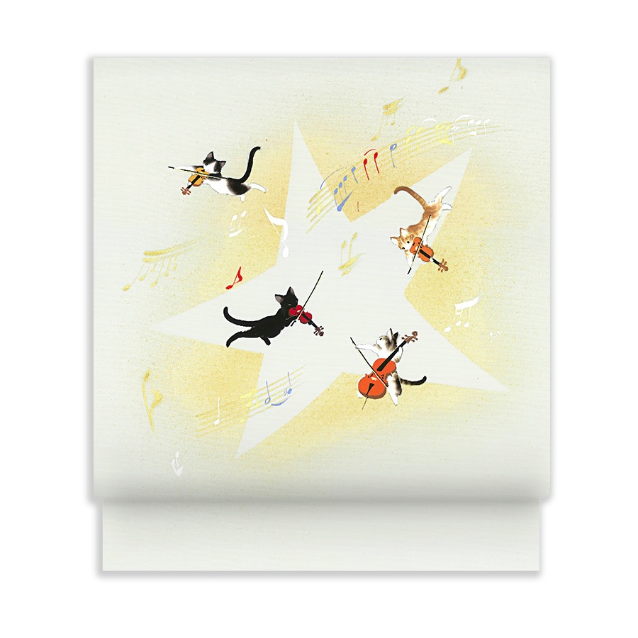 クロやトラ、ブチなどの愛らしい猫たちが楽器を奏でる、キュートなデザインの新塩瀬帯です。背景の星部分は、金彩を使用して華やかな印象。おしゃれ着や小紋などと合わせて洒落た着こなしをお楽しみください。