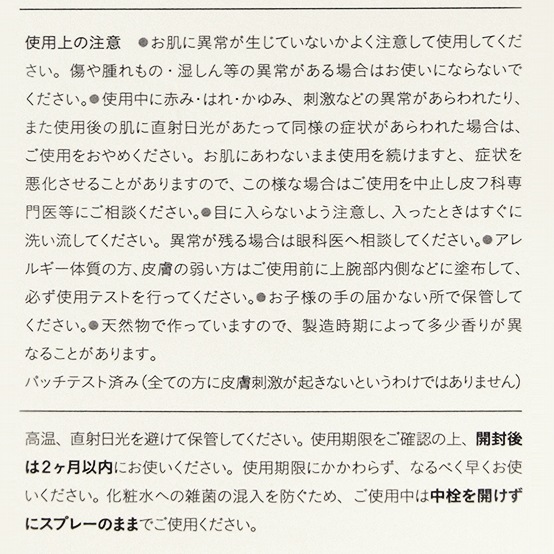 化粧水への雑菌の混入を防ぐため、ご使用中は中栓を明けずにお使いください。開封後の使用期限をご注意の上、お使いください。