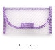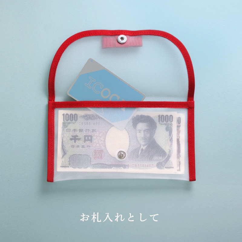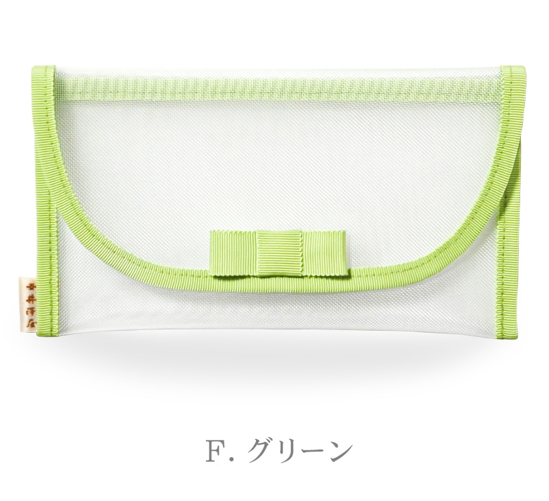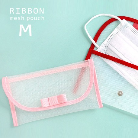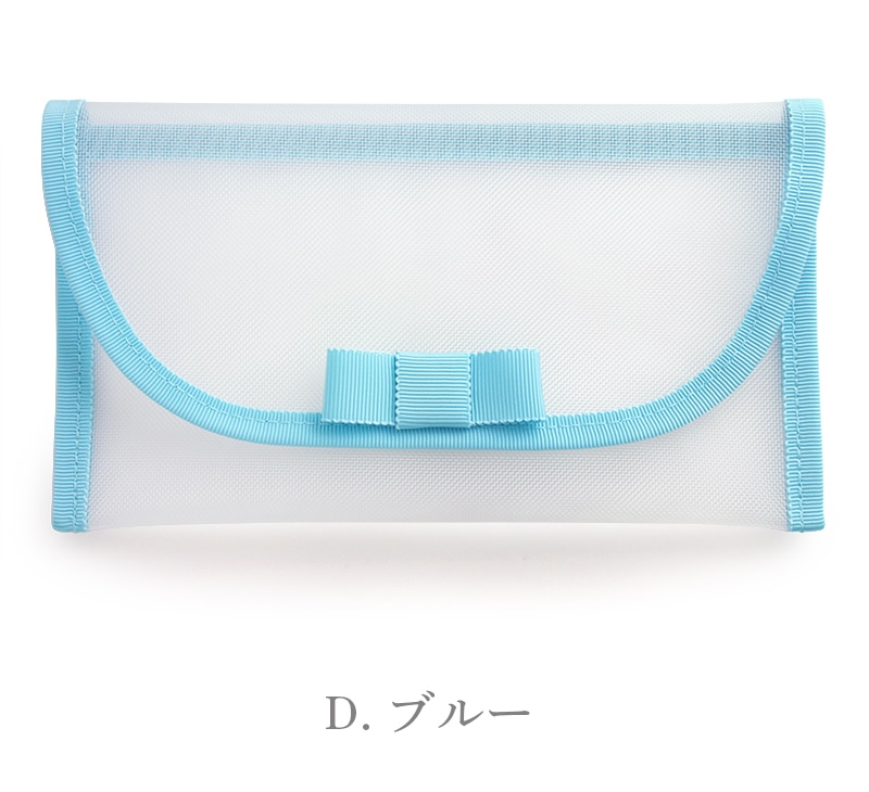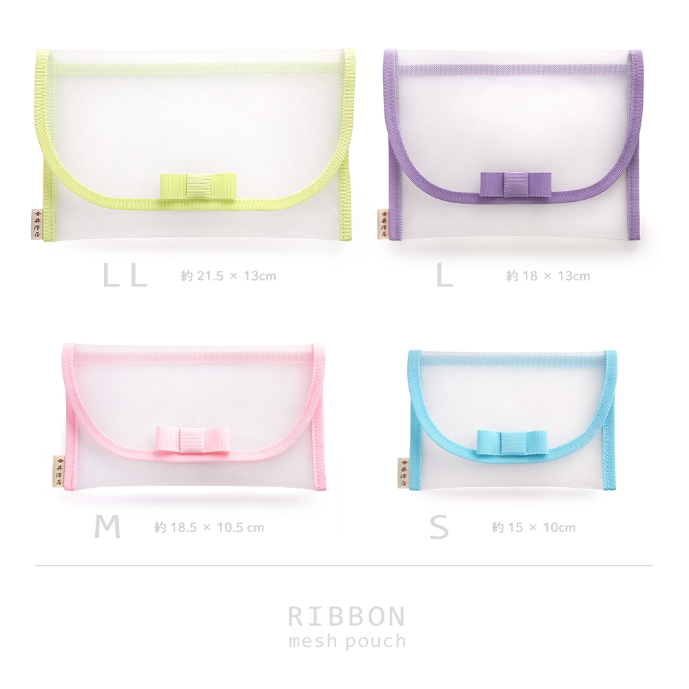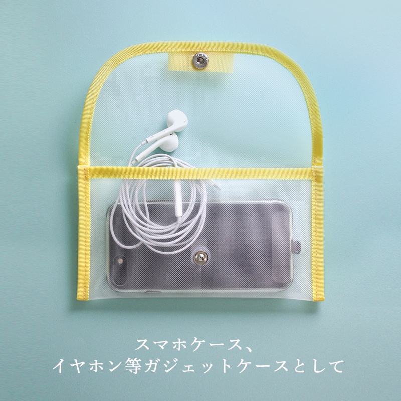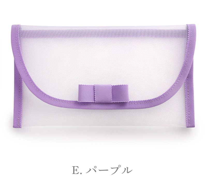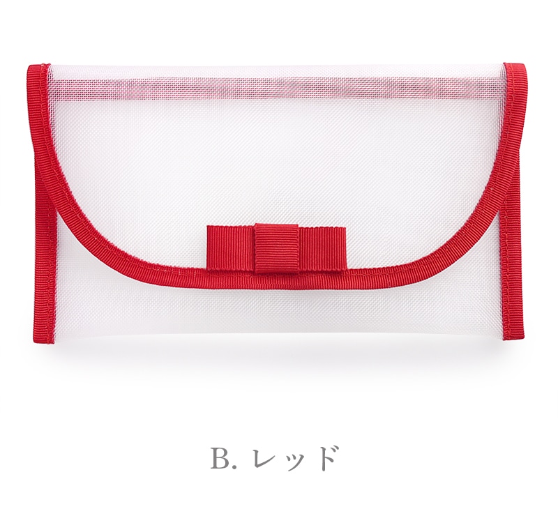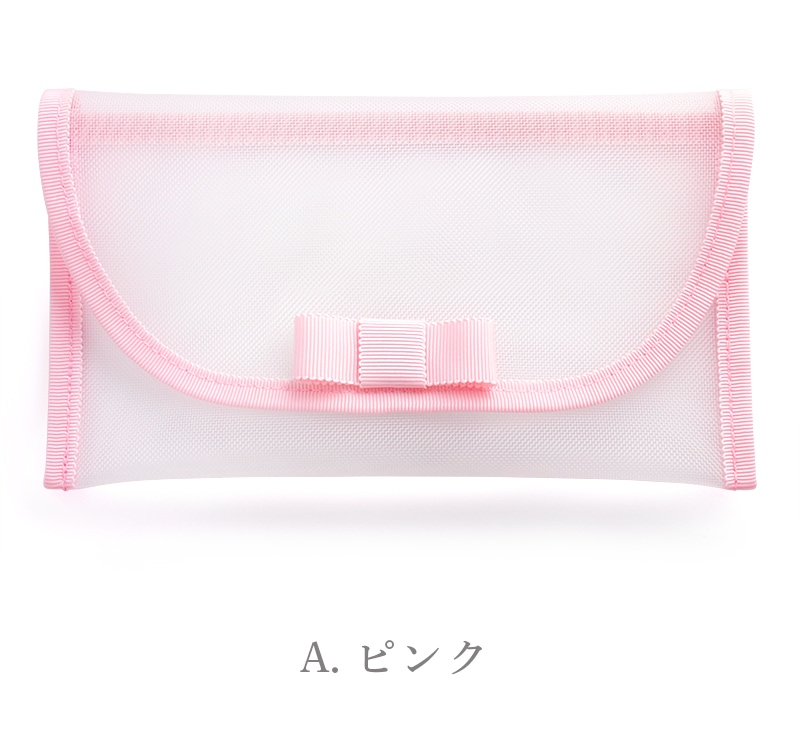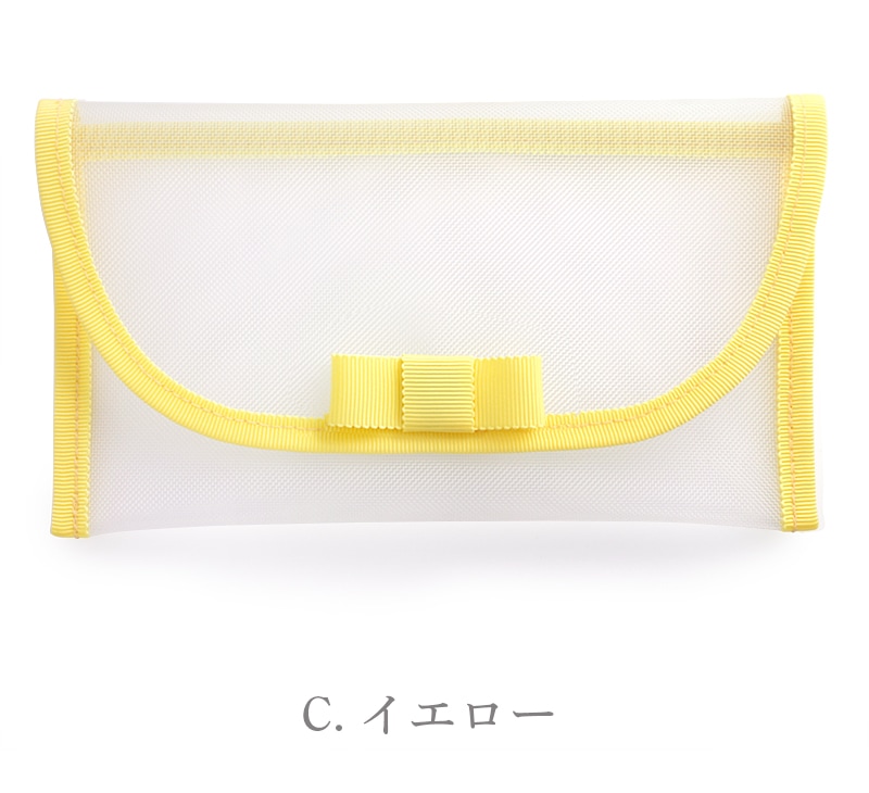 明るいビタミンカラーのリボンで縁取った、中身が見えるポーチですので、