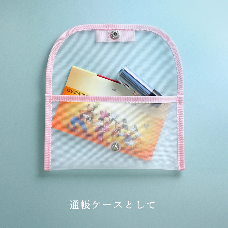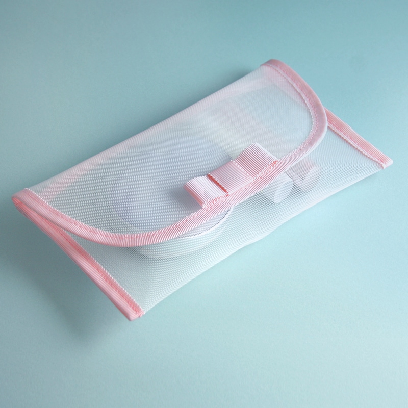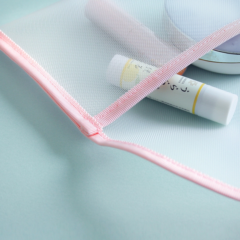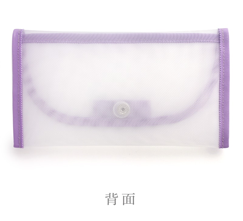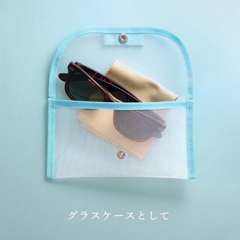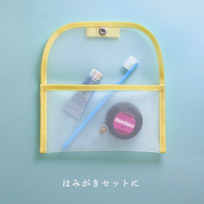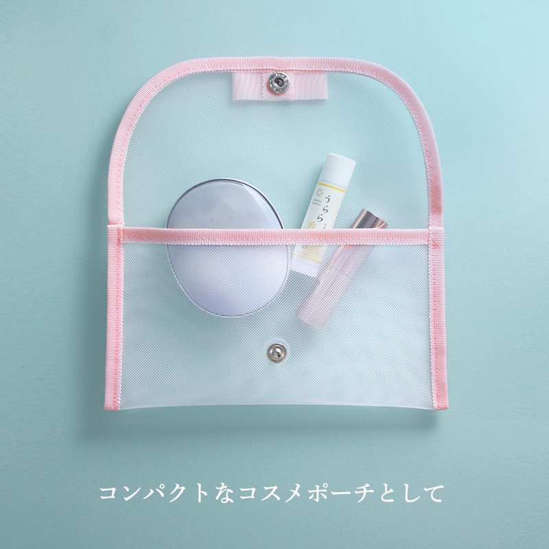 横長タイプの、ぺたんとしたデザインのフタ付きメッシュポーチです。