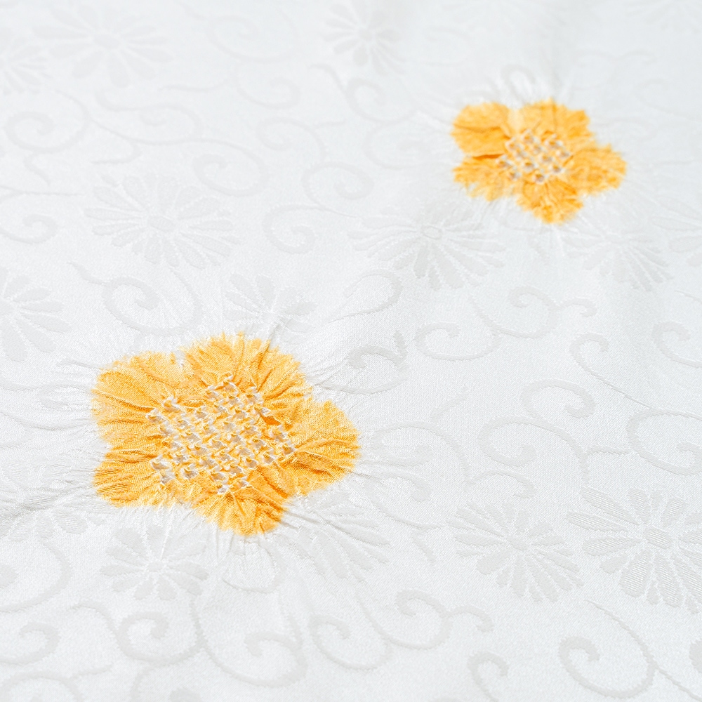 菊唐草の紋綸子の生地に、風雅な彩りの梅の絞りを大小に散らした、京都ならではの逸品です。帯からのぞく梅の意匠が粋な印象。お好みのままに、幅広い装いに合わせていただけます。