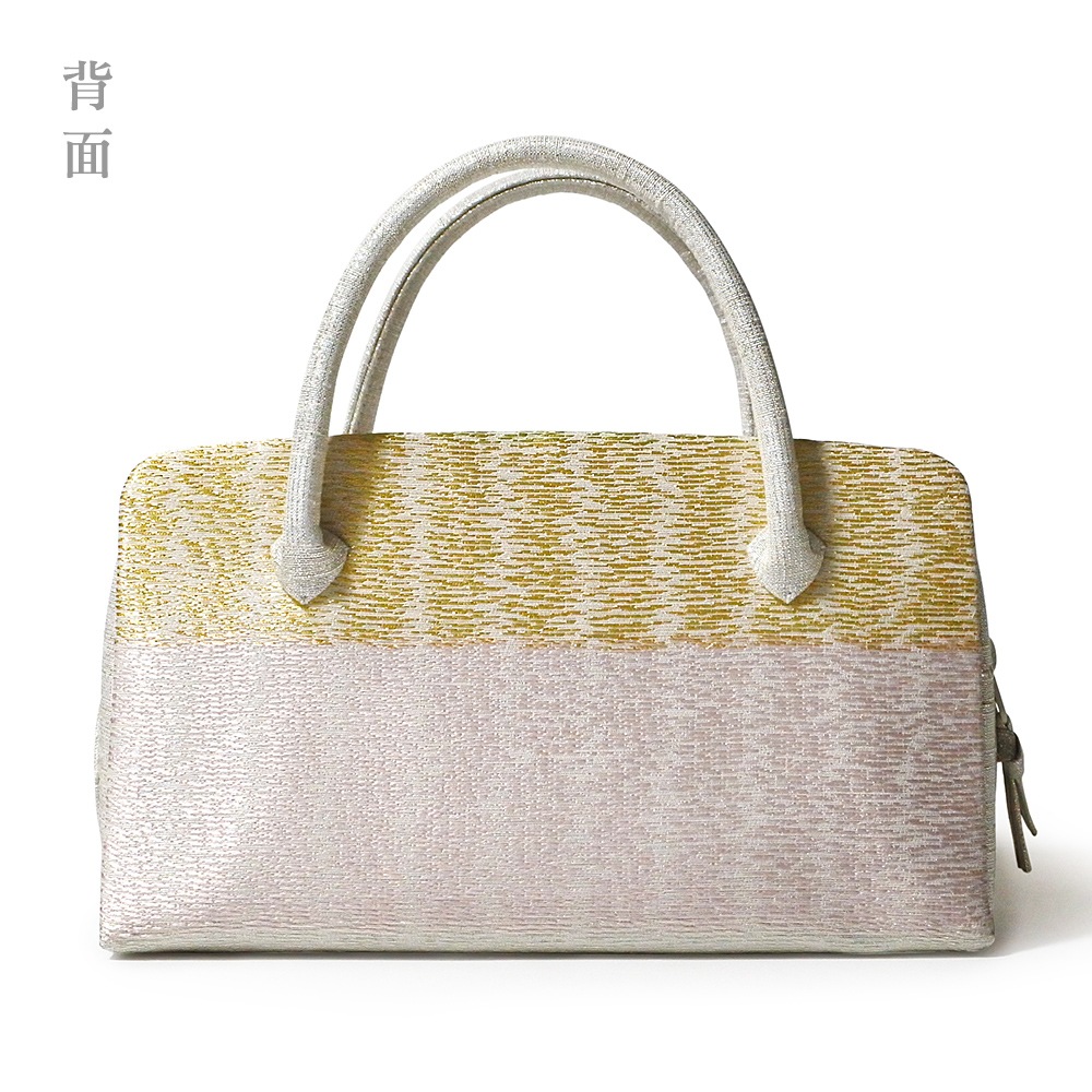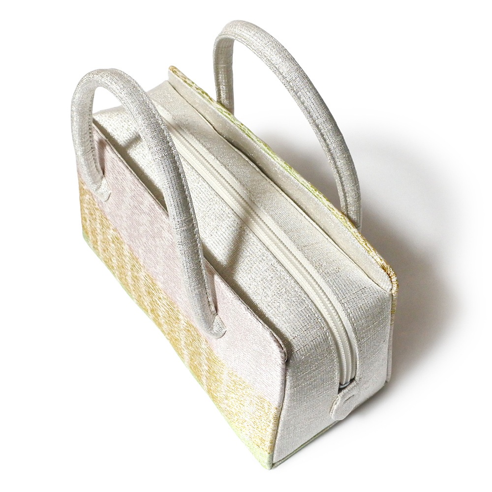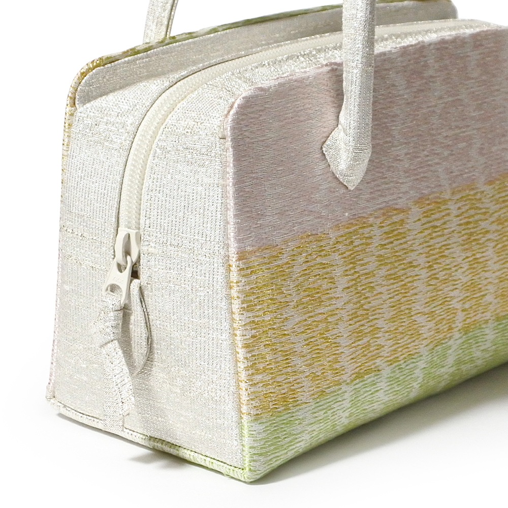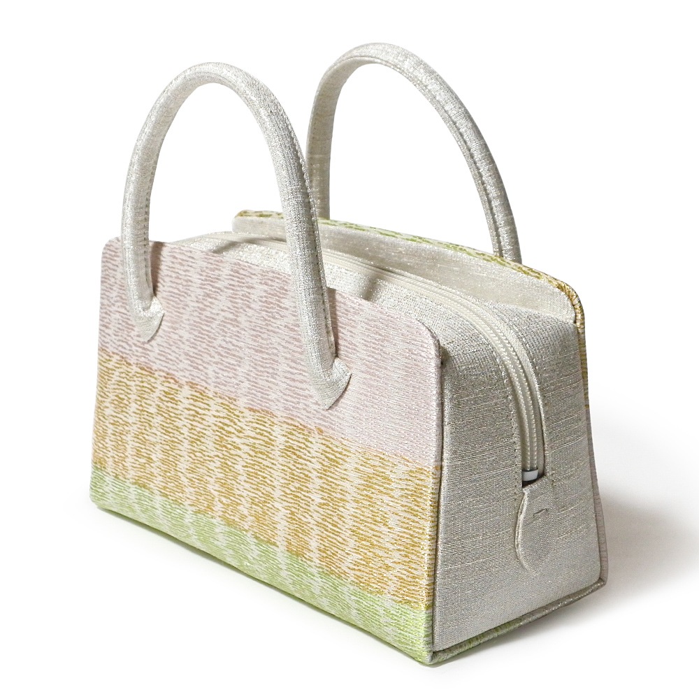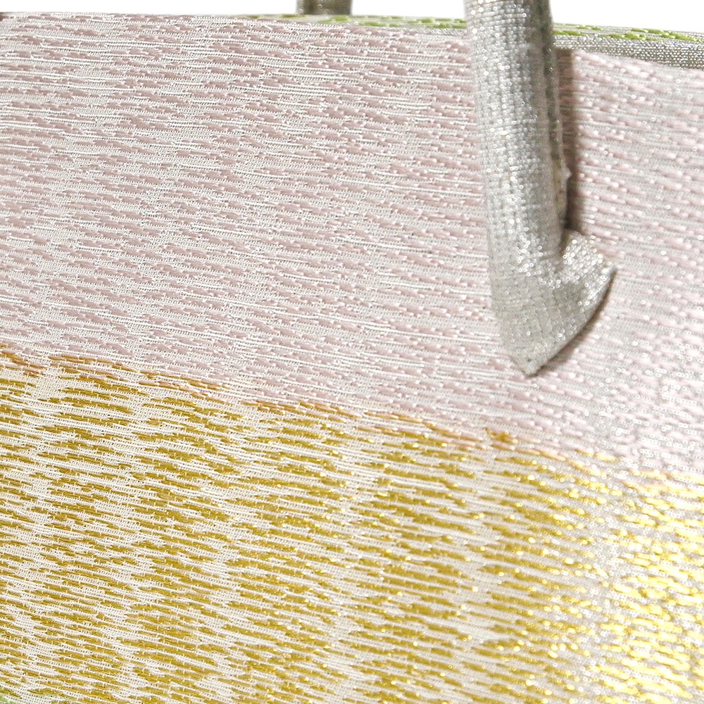 淡いグレー地に、光沢のある薄ピンクや薄グリーン、金糸の横段が織り込まれた、すっきりとしたデザインの和装バッグです。薄い色合いに金糸のアクセントが効いて、どこかモダンな印象。合わせやすさも魅力です。