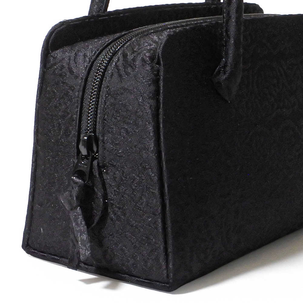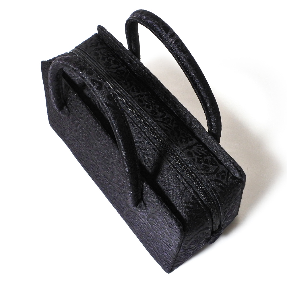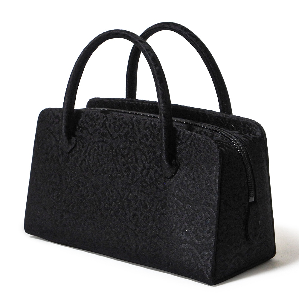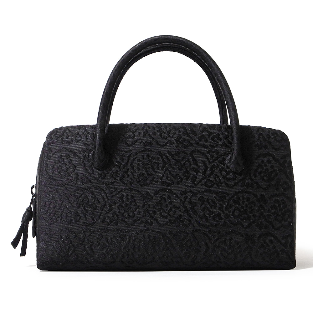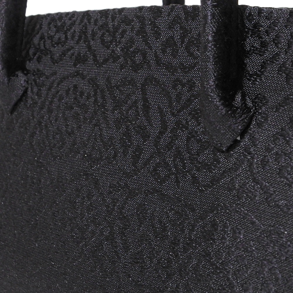 井澤屋の新定番柄で、ぶどうを思わせる大胆な唐草模様が横段で織り重なった柄の和装バッグです。黒地に黒の唐草模様が光の加減で現れるデザイン。弔事用としてお使いいただけます。