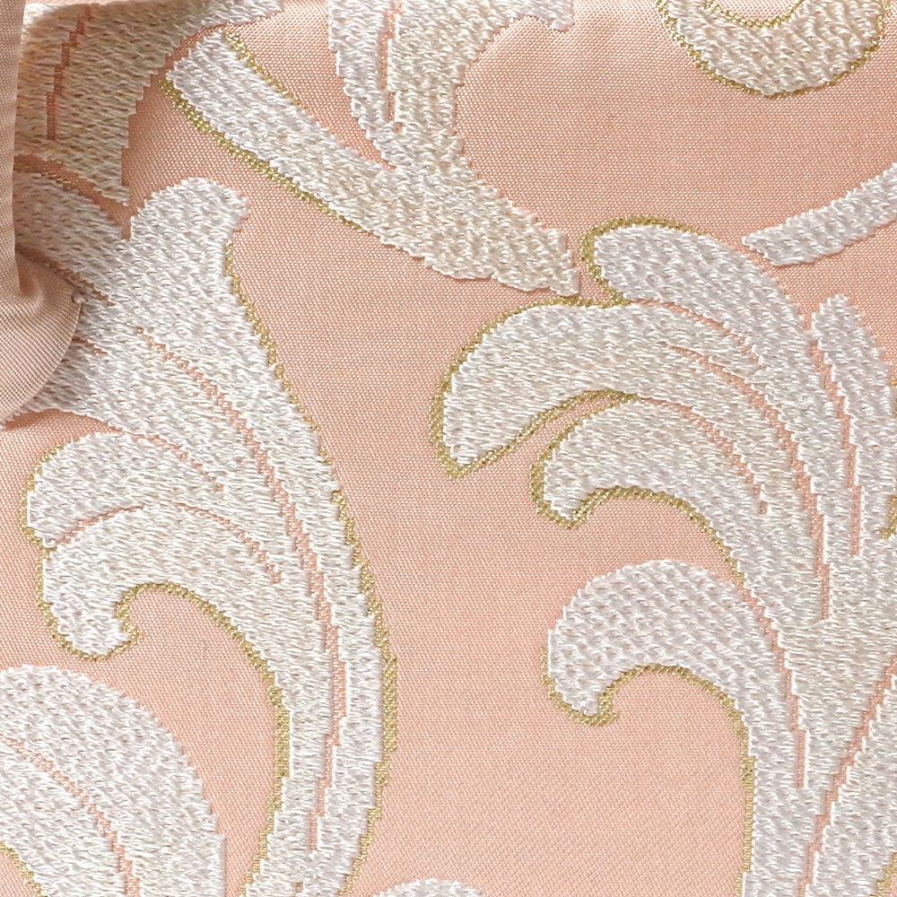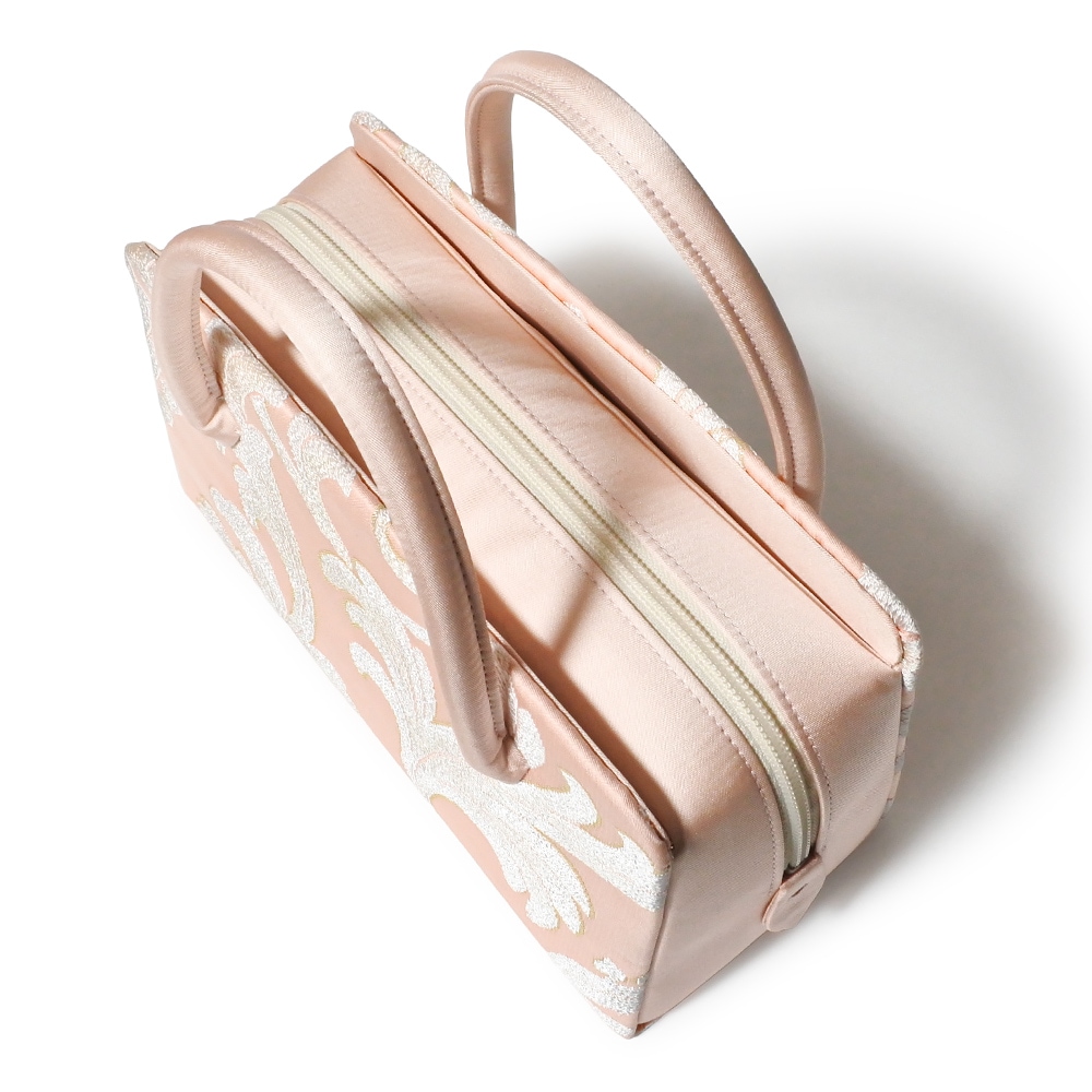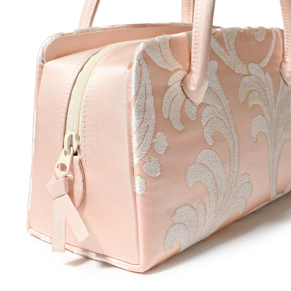 優しいお色目のピンク地に、白糸で大胆に織り込んだ唐草柄が華やかな印象の和装バッグです。唐草の縁取りには金糸を使用し、立体感のある柄行に仕上げました。夏以外の季節にお持ちいただけますが、春先やお花見のシーズンは特におすすめです。
