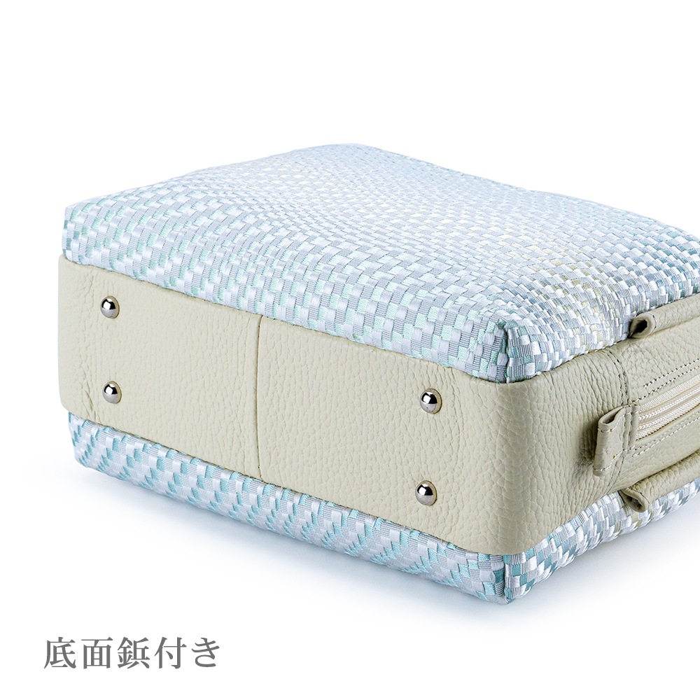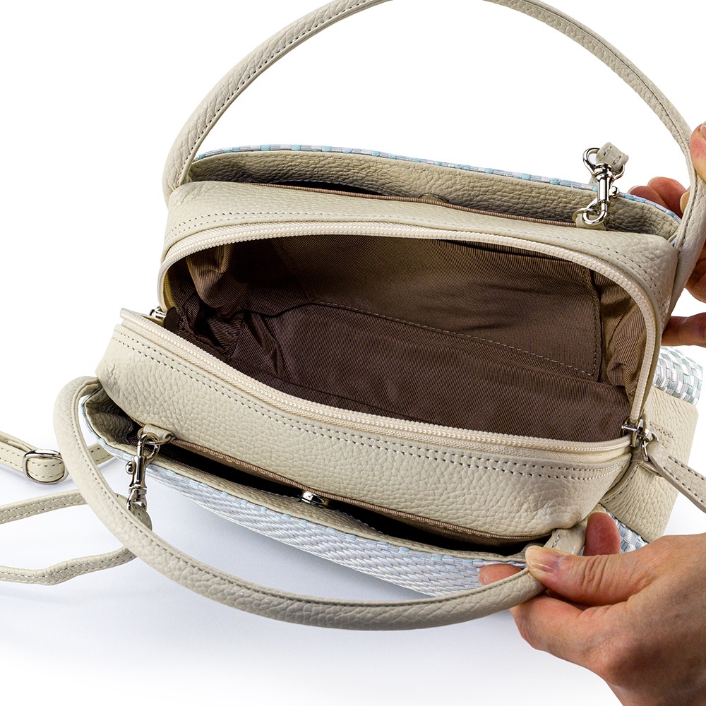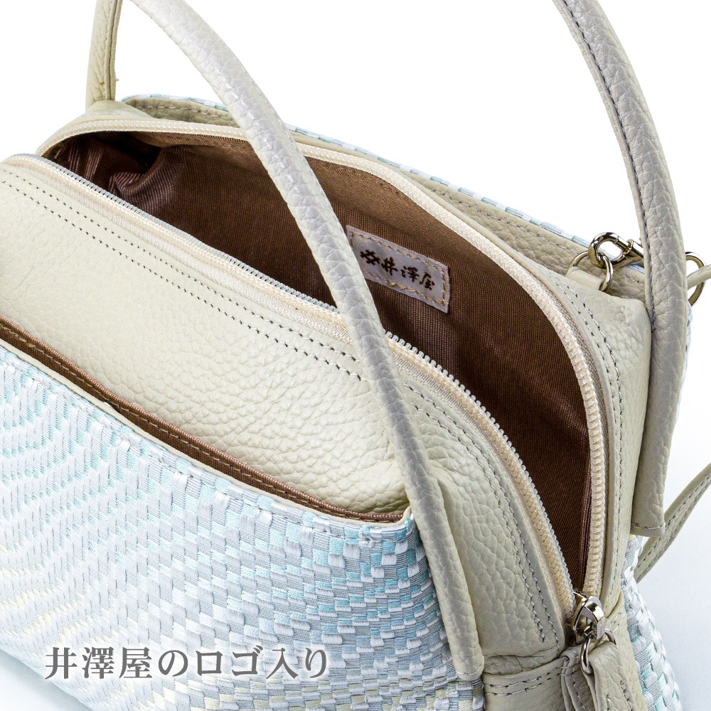 スマートフォンやミニウォレット、化粧ポーチなど、最小限の手回り品を持ち歩くのにちょうど良いサイズのショルダーバッグです。華やかな西陣織と丈夫な牛革の異なる素材を組み合わせた、バイマテリアルの個性的なデザイン。ショルダーの紐は取り外しが可能ですので、ハンドバッグとしてもご使用いただける2way仕様です。洋装の際はショルダーに、お着物の際はハンドバッグとして柔軟にお使いいただけます。
