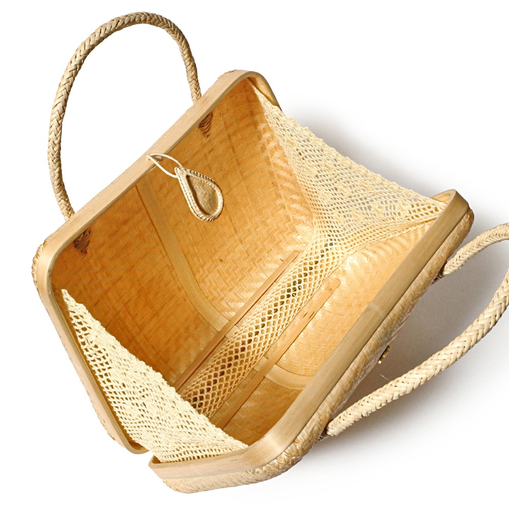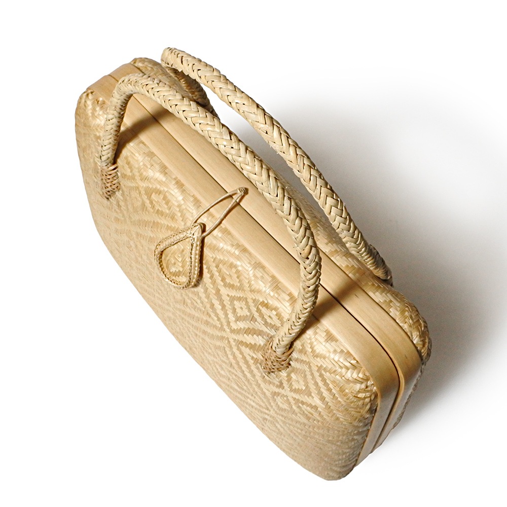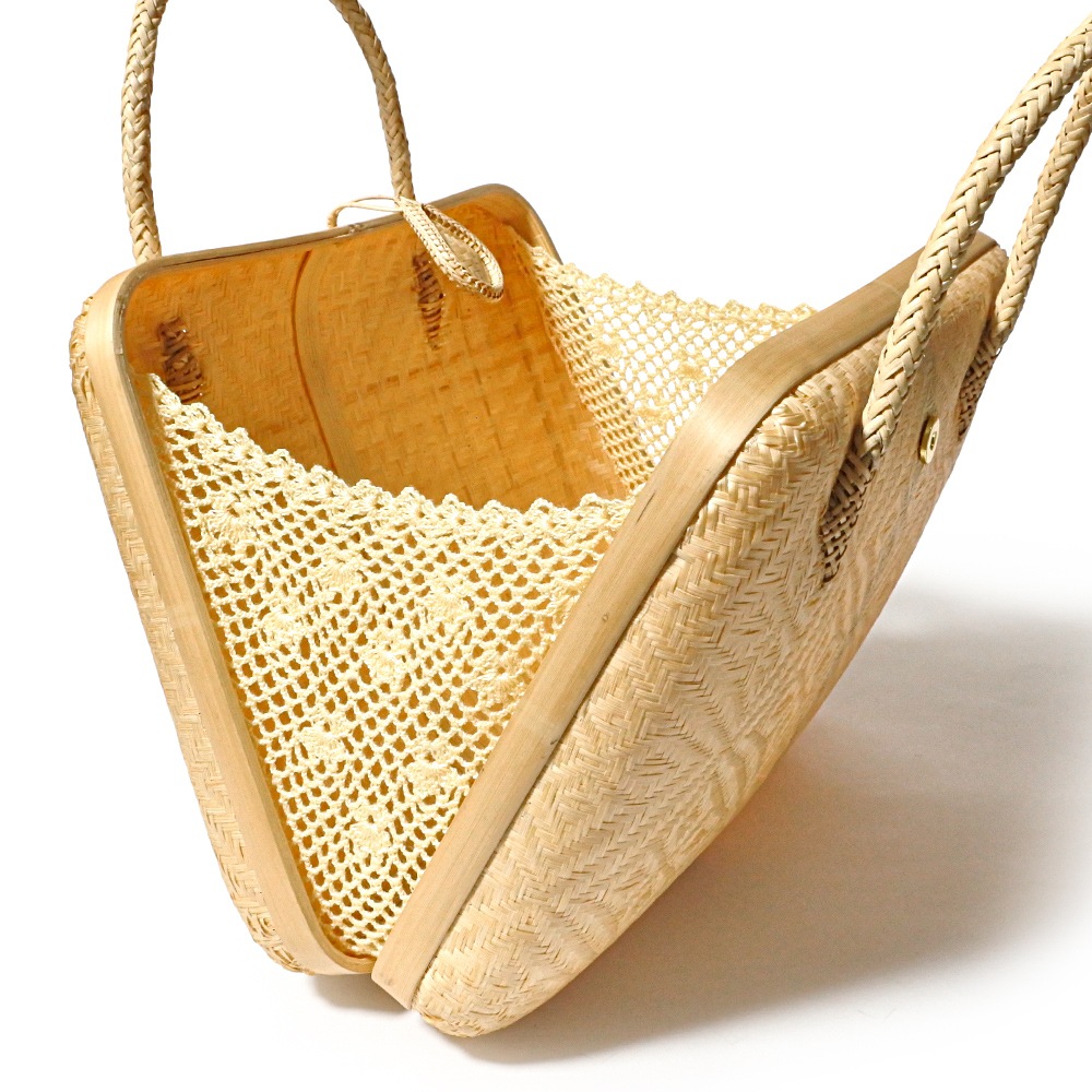 タイの伝統工芸である竹細工のなかでも、繊細で高い技術を誇るタイ王室御用達の「KOMKRIT工房」で生産されているハンドメイドの竹細工バッグです。手仕事ながら大変均整の取れた美しい立体感と、糸のように細くした竹を丁寧に編み込んで仕上げた澱みのない均一な模様が特長。A5の冊子が入る少し大きめのサイズです。開閉は中身が取り出しやすい蛇腹式で、口を開けた側面の蛇腹部分には、清楚なレースがのぞきます。