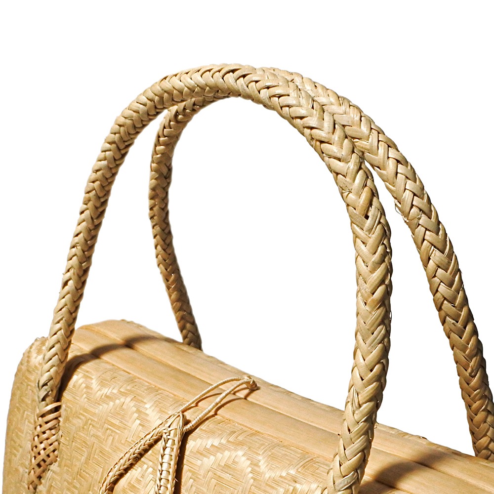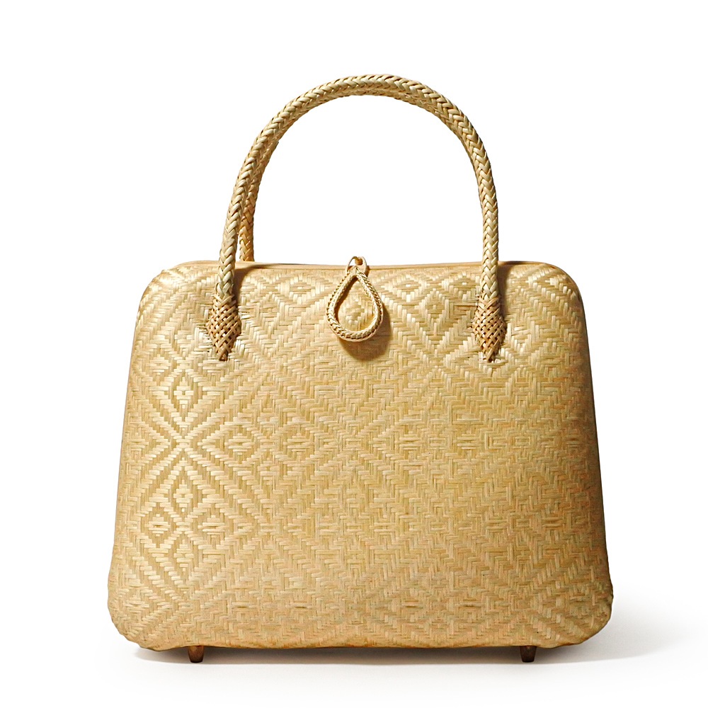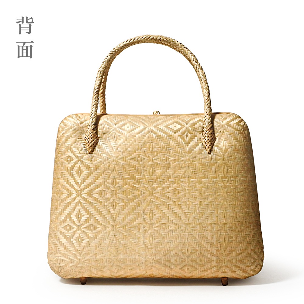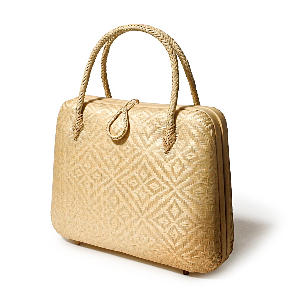 タイの伝統工芸である竹細工のなかでも、繊細で高い技術を誇るタイ王室御用達の「KOMKRIT工房」で生産されているハンドメイドの竹細工バッグです。手仕事ながら大変均整の取れた美しい立体感と、糸のように細くした竹を丁寧に編み込んで仕上げた澱みのない均一な模様が特長。A5の冊子が入る少し大きめのサイズです。開閉は中身が取り出しやすい蛇腹式で、口を開けた側面の蛇腹部分には、清楚なレースがのぞきます。