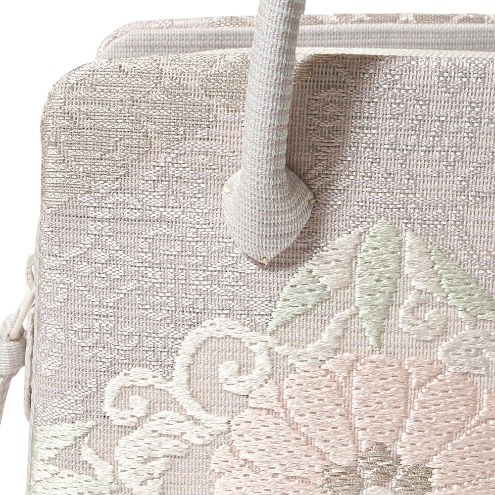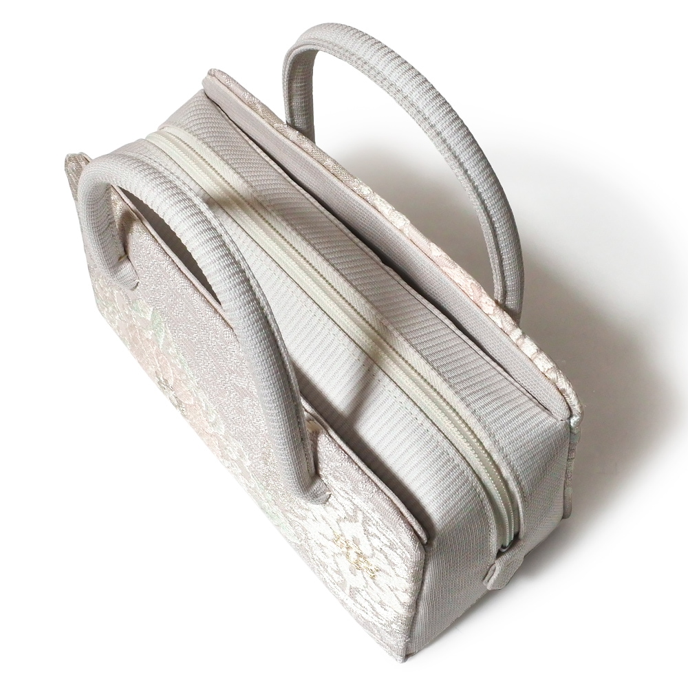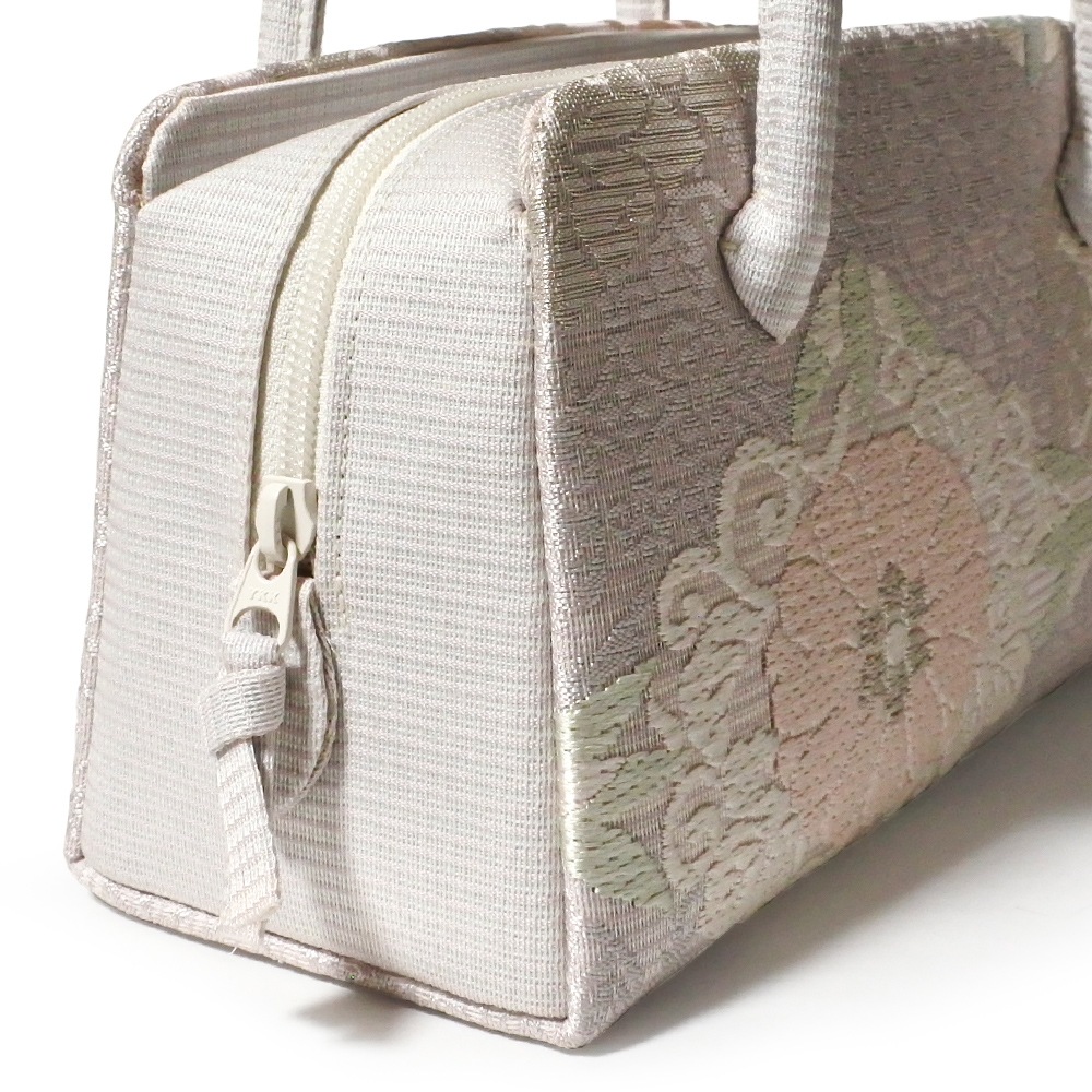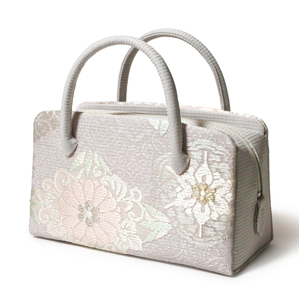薄い藤色の絽織に、菊や菱花などの華文を大胆に織り込んだ、夏の和装バッグです。柄の要所で金糸や銀糸をたくみに使用し、華やかながら落ち着いた色合いが上品な印象。夏の訪問着から礼装まで合わせていただけます。