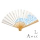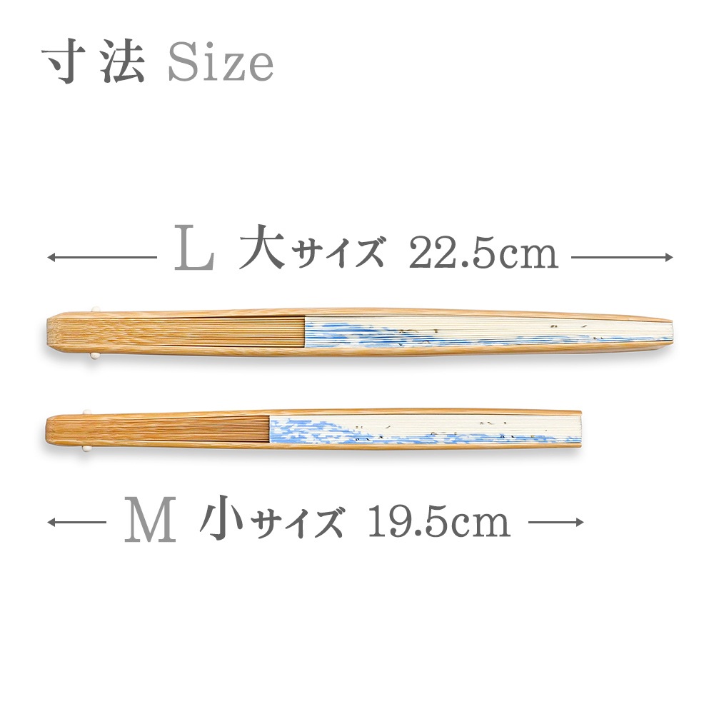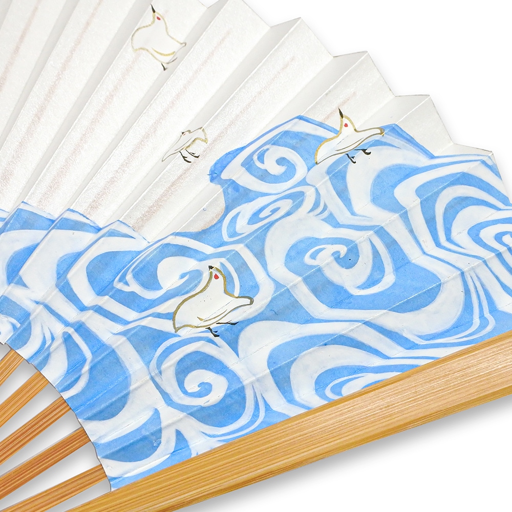華のあるパール系の扇面に、手描きの絵柄が新鮮な印象のオリジナル柄の扇子です。右端から流れ出るブルー地の爽やかな流水柄に、金彩の縁取りで描かれた千鳥が優雅に羽ばたく、すっきりとしたデザイン。男女問わずお持ちいただけるお色柄で、大サイズと小サイズの2サイズをご用意いたしました。老若男女問わず幅広くお持ちいただけます。