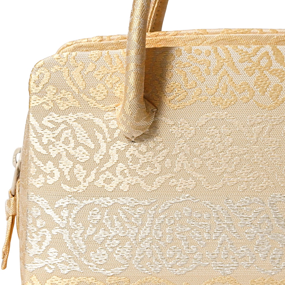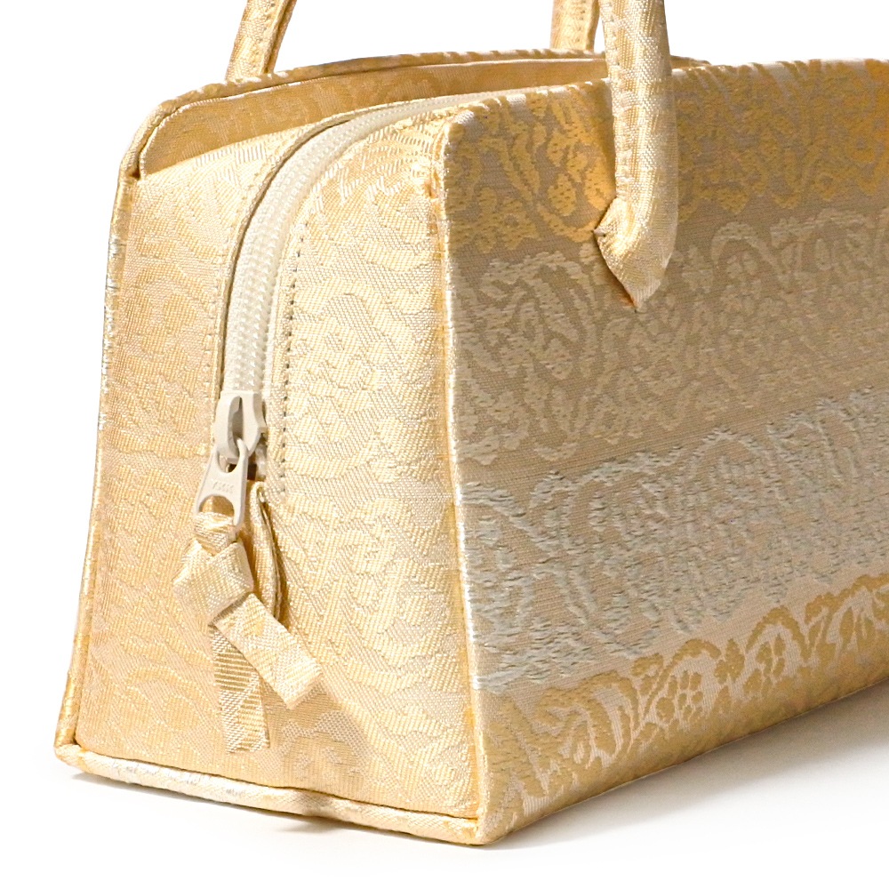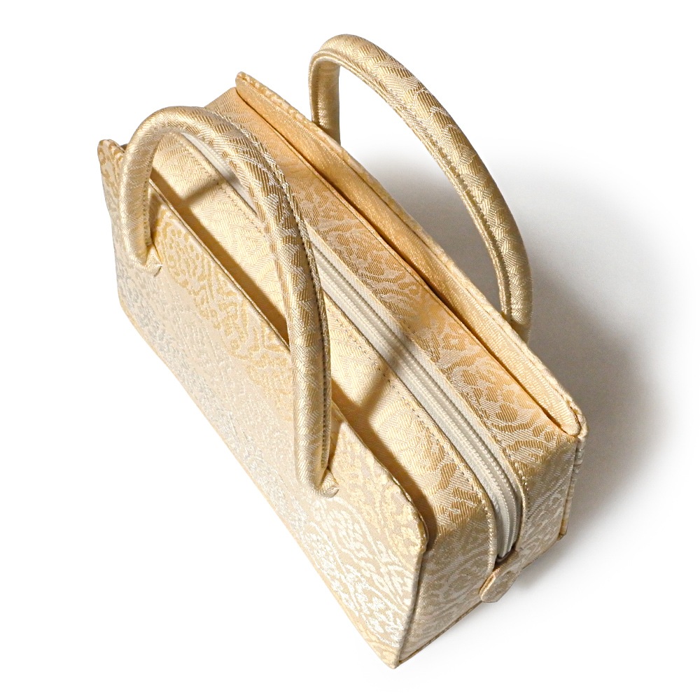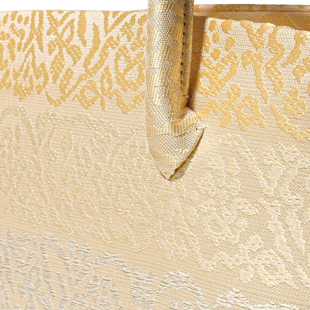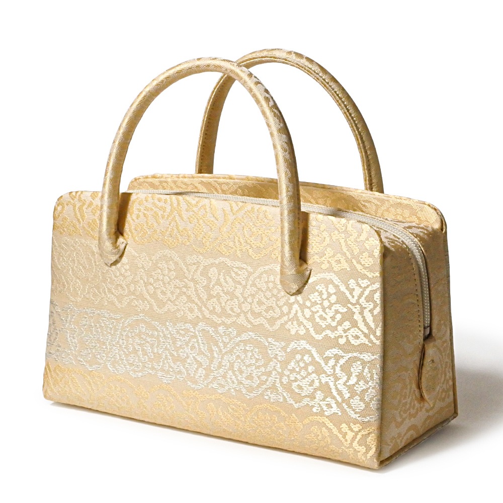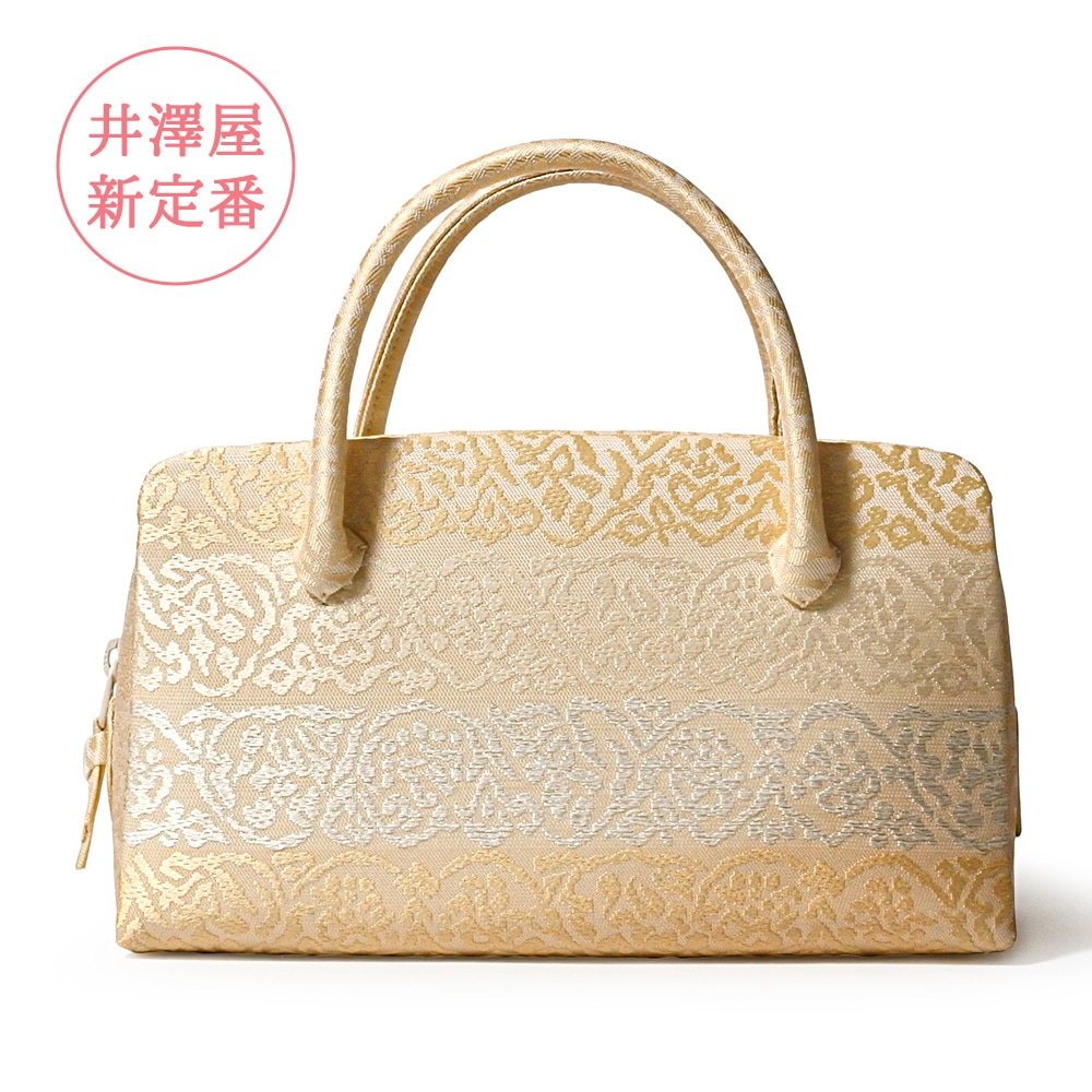 井澤屋の新定番柄で、ぶどうを思わせる大胆な唐草模様が横段で織り重なったデザインの和装バッグです。ベージュ地に、濃淡のクリームや白糸をグラデーションに織りなした明るいお色柄で、暖かみのある淡い色合いは女性的な印象。お着物のお色柄を選ばず、一年を通して大変重宝していただけます。
