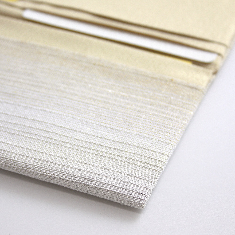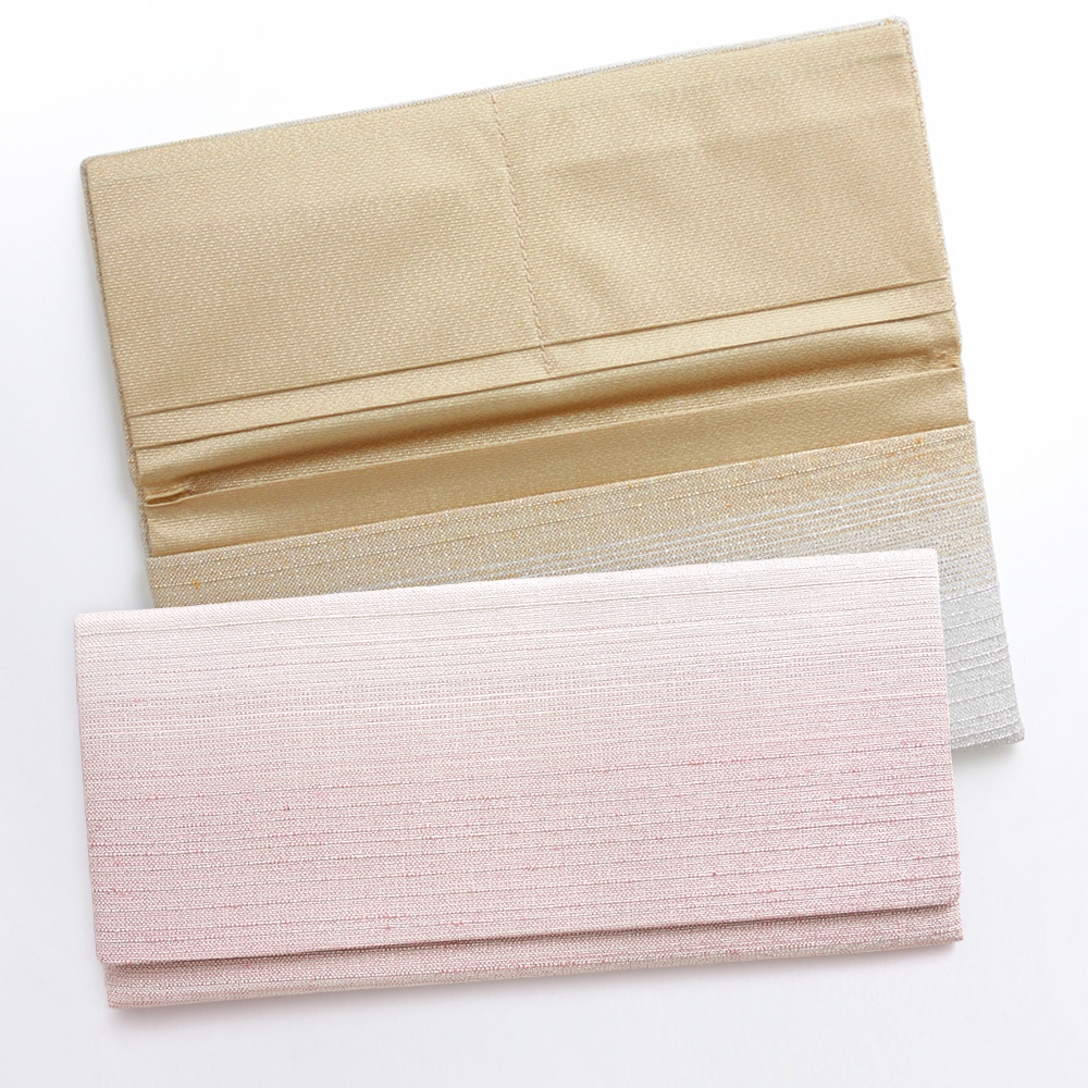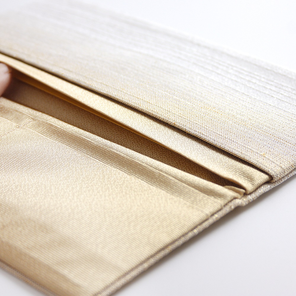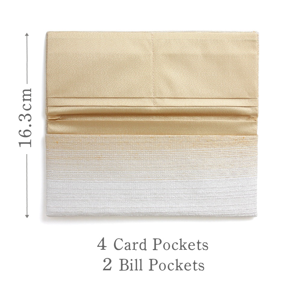 白地にグラデーションになるように色糸を織り込んだ、上品な印象の札入れです。角度により銀糸がきらめき、お手元に華やかさを添える効果も。クラッチバッグや小さめのバッグにもかさばらずにお使いいただける薄手でスリムなサイズ感も魅力です。