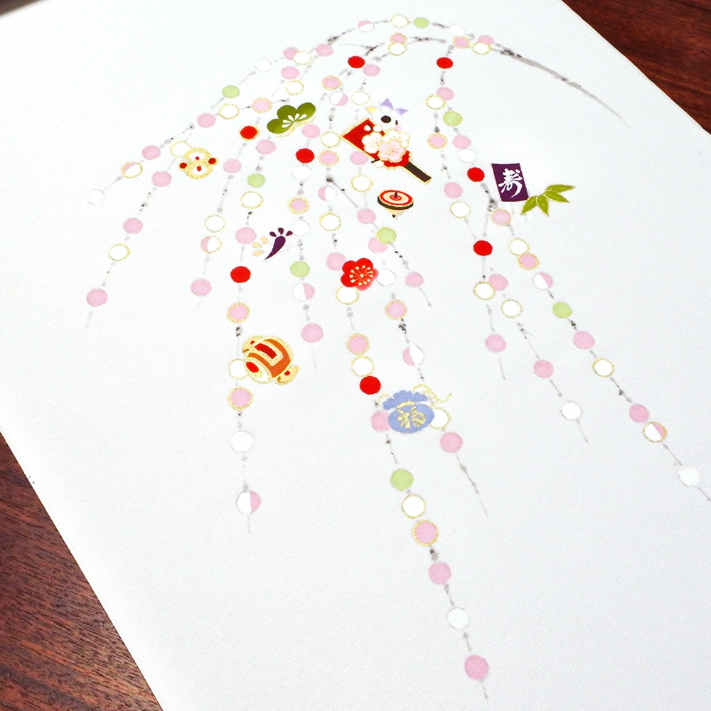 垂れ下がる様が美しい餅花に、羽子板やコマなどのお正月飾りや、縁起の良い打ち出の小槌など新春らしい意匠の数々が描かれた手描きの帯です。要所に金彩を使用しており、光の加減で華やぐ表情の変化をお楽しみいただけます。