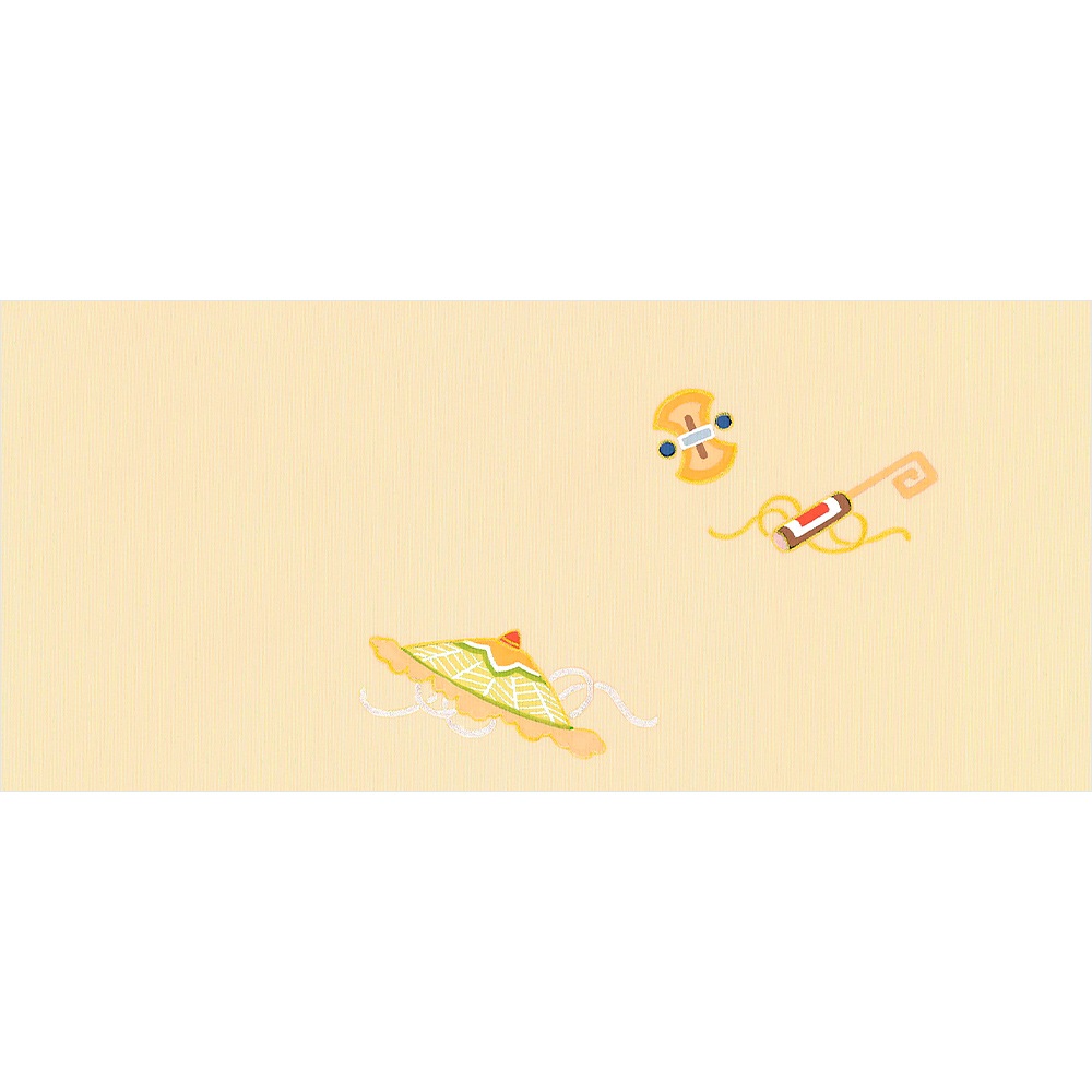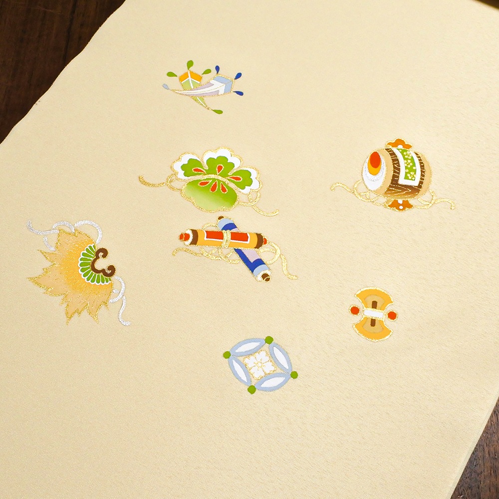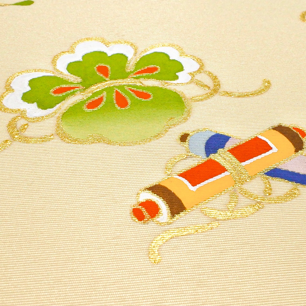 新塩瀬帯 吉祥柄「宝尽くし 手描き」 クリーム地