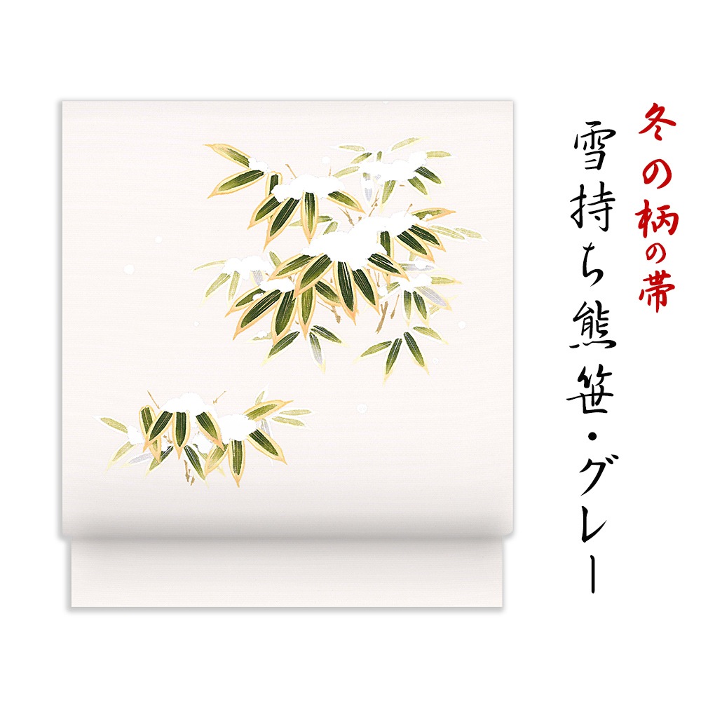 冬の柄の新塩瀬帯「雪持ち熊笹」 グレー地