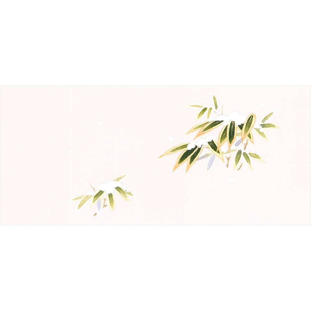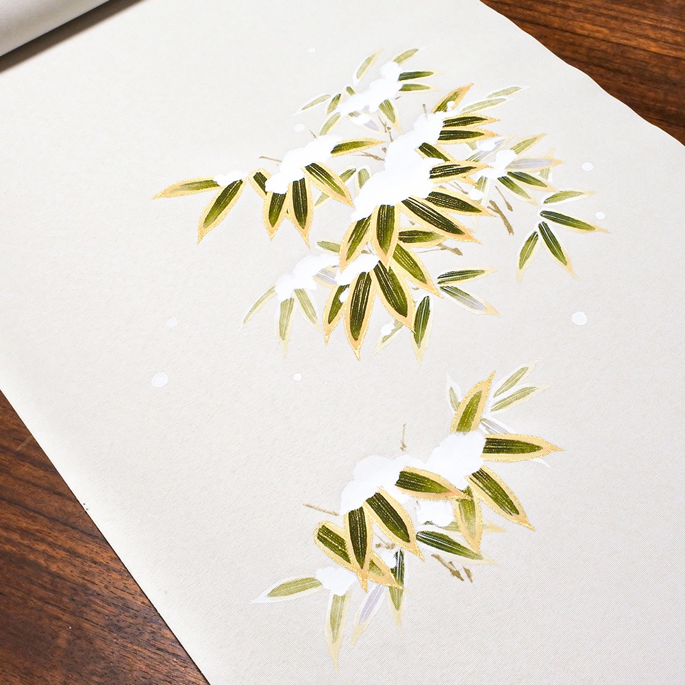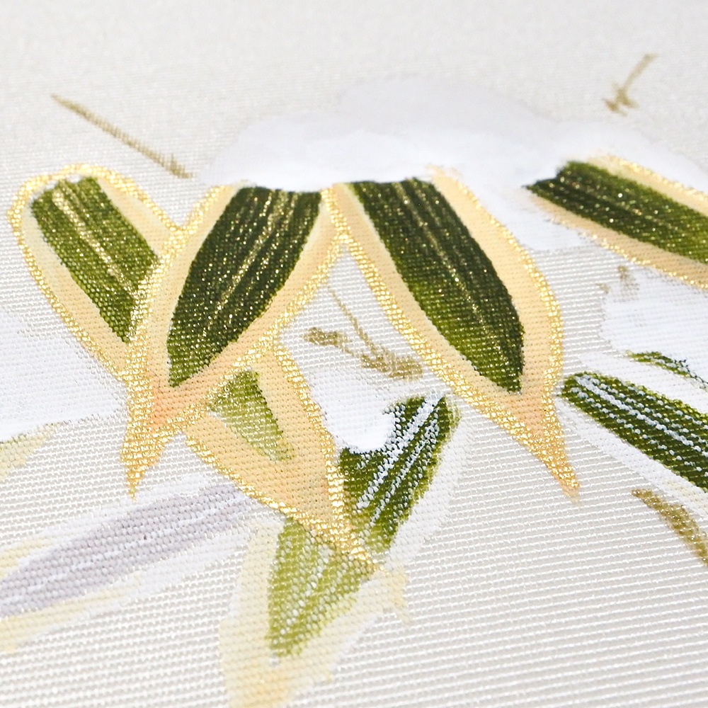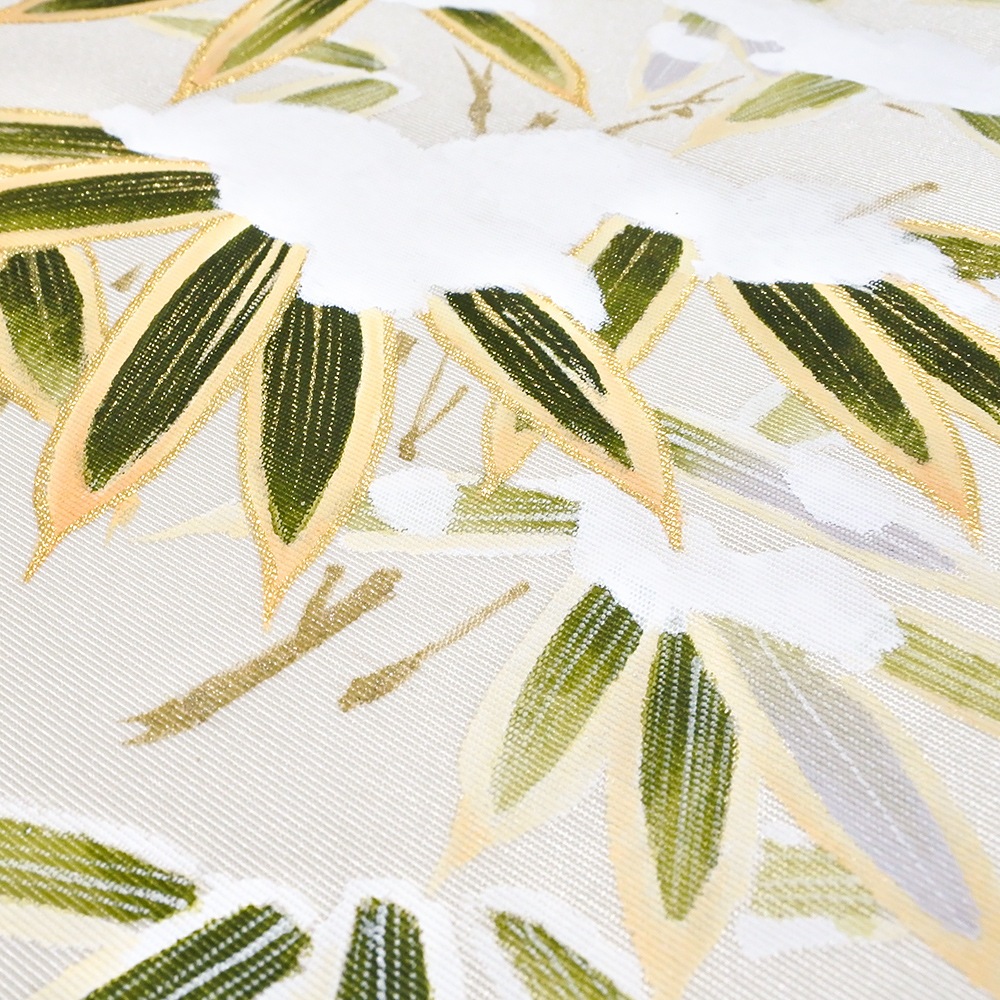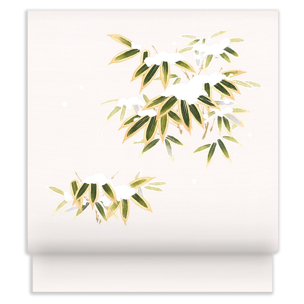 写実的な笹の葉に積もる雪の様子を描いた、雪持ち笹の新塩瀬帯です。日本画のような、落ち着いた風情あるタッチはシックなお色柄のお着物と特に好相性。冬場の装いに重宝する、使いやすいデザインの帯です。