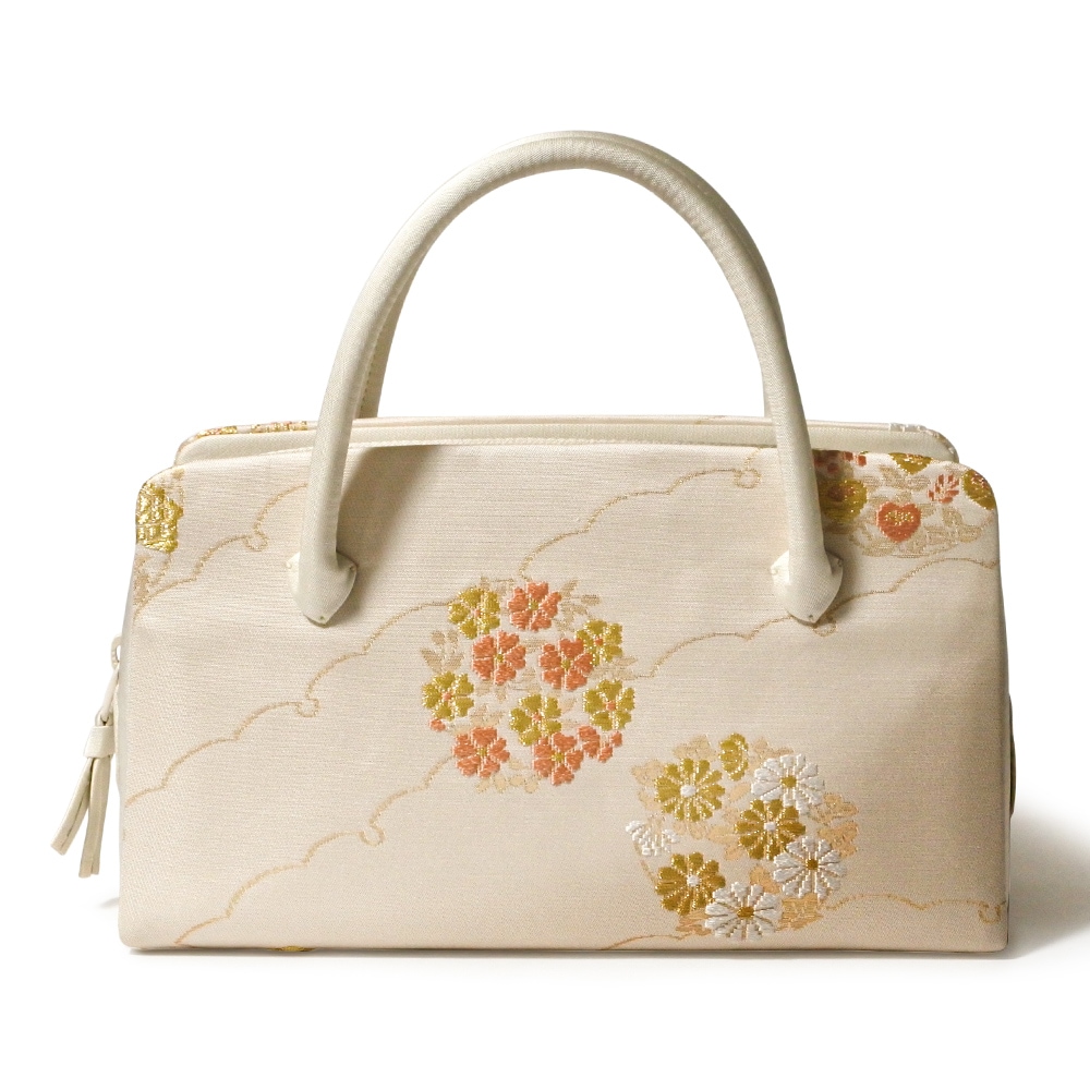ベージュ地に花丸文をリズムよく織り込んだ、すっきりとしたデザインの和装バッグです。菊や橘、牡丹などの花丸文には、アクセントで金糸を使用。色彩を抑えた中に華やかさを添えました。お着物を選ばず合わせやすいです。