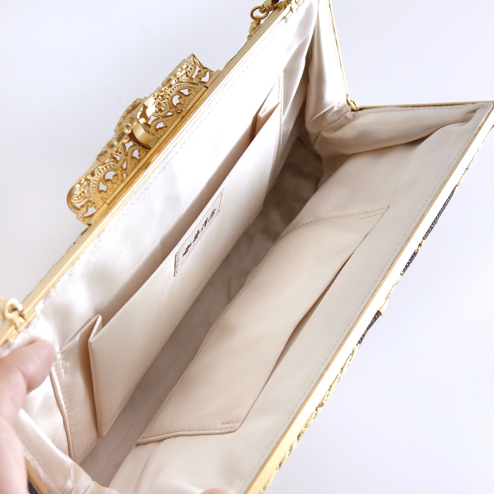 エキゾチックな葡萄唐草文様が大胆にデザインされた、西陣織 ねん金綴れ織のパーティーバッグです。大振りな柄行きに金糸の煌めきがゴージャスな印象。天然石が埋め込まれた華やかな留め具はクラッチとしてお持ちの際に指を掛けることができ、ご祝儀袋のおさまる実用的なサイズ感も魅力です。