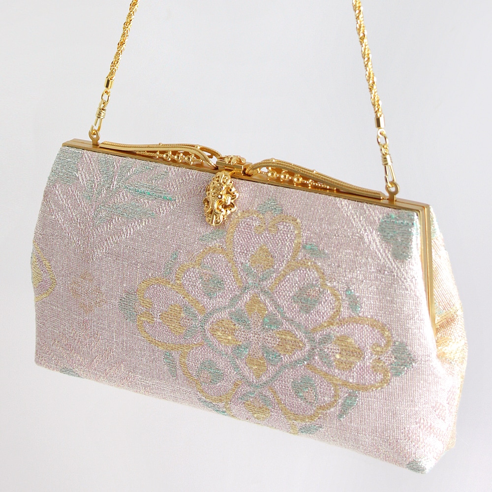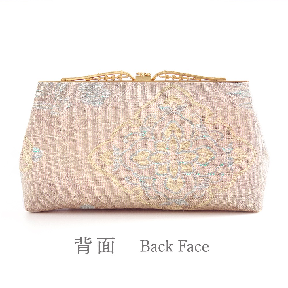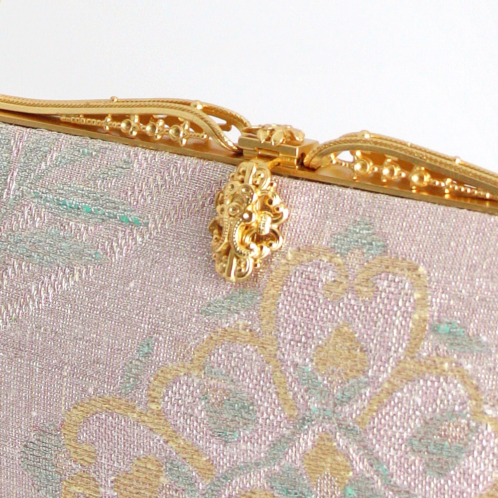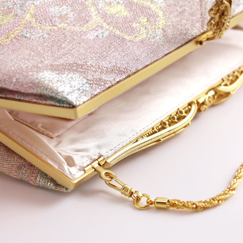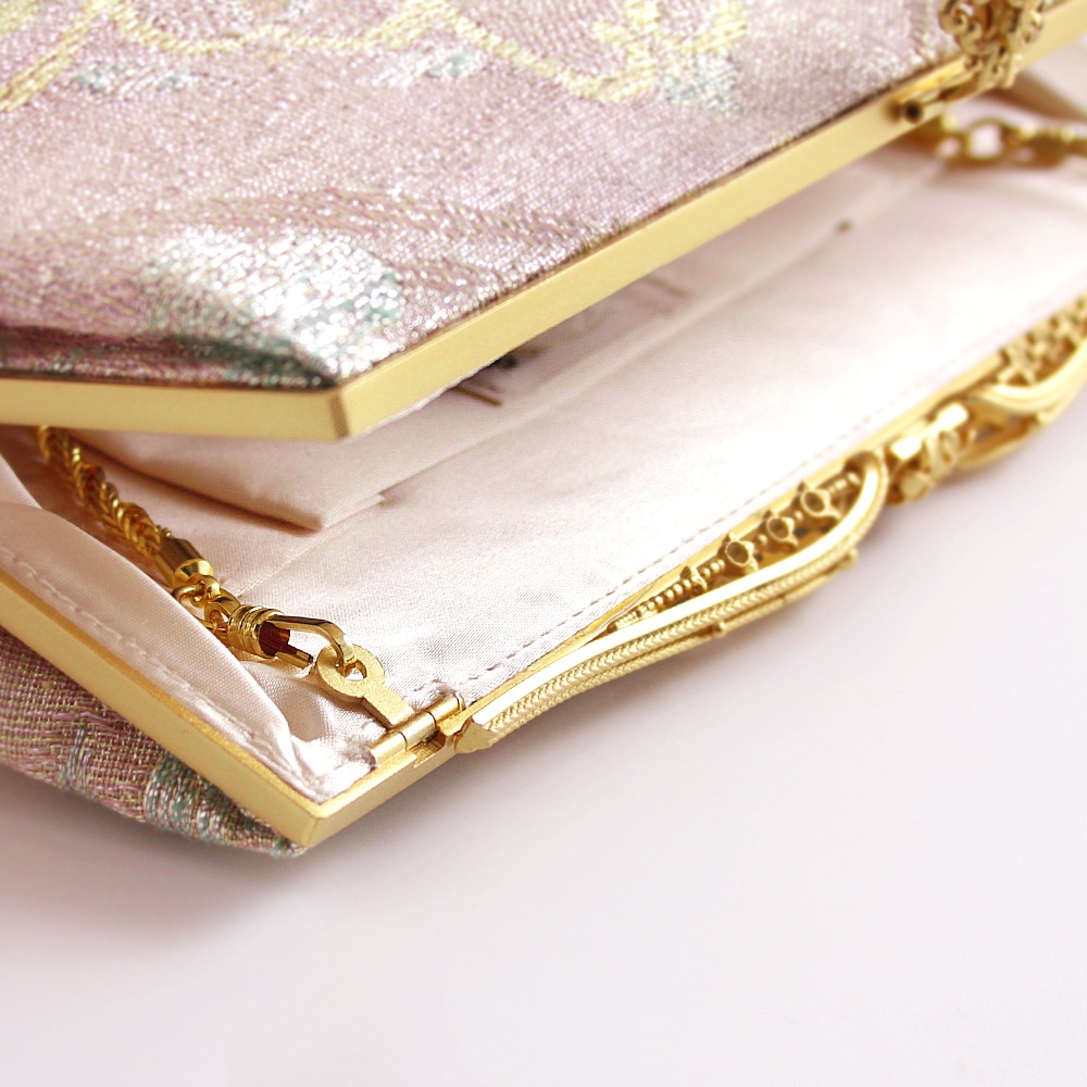 煌びやかな金銀糸で伝統的な花菱文様を表現した西陣織に、装飾的な口金がアクセントのパーティーバッグです。前面と背面でピンクのお色味が異なる凝った印象で、柔らかな色合いときらめきが女性らしく、落ち着きのある華やかさ。