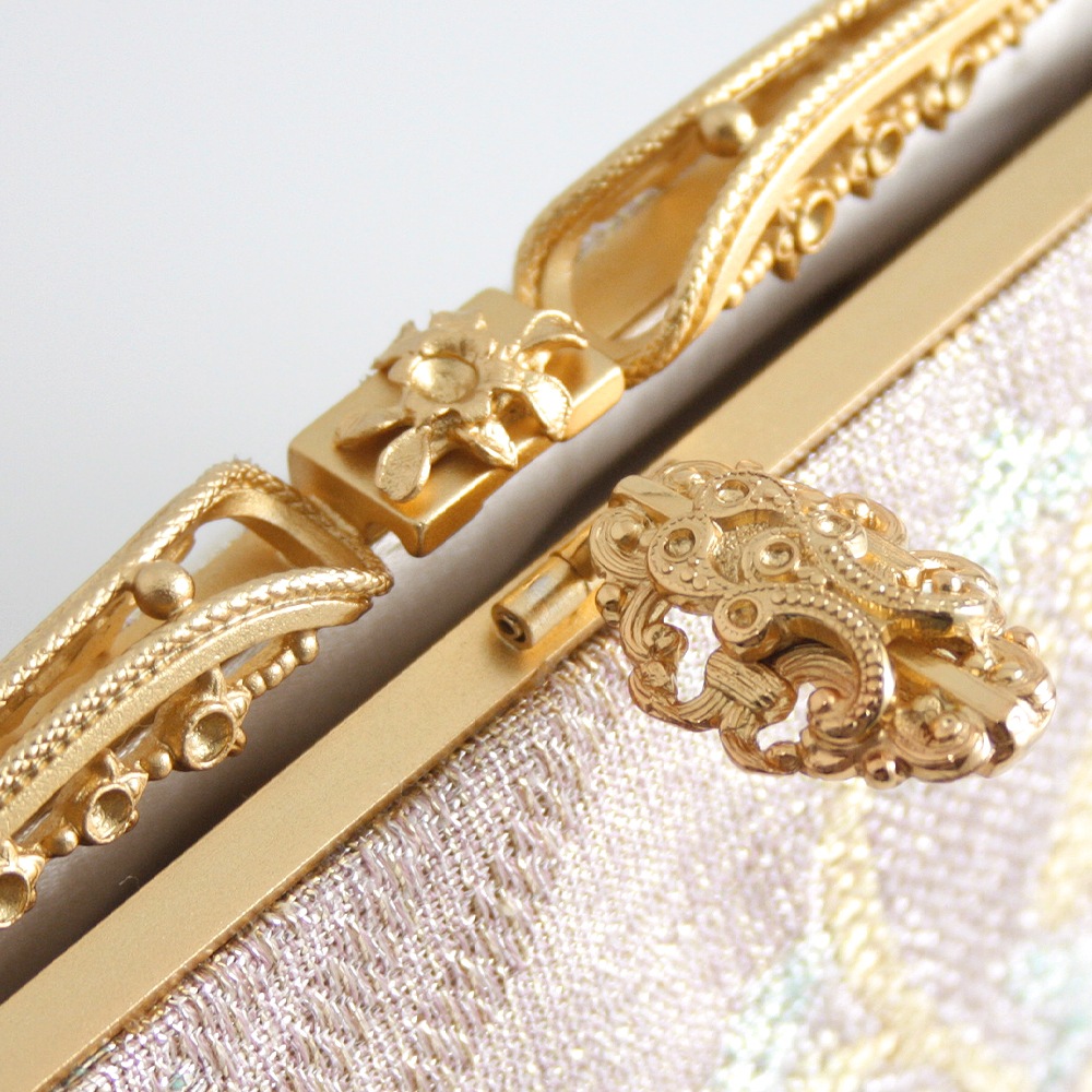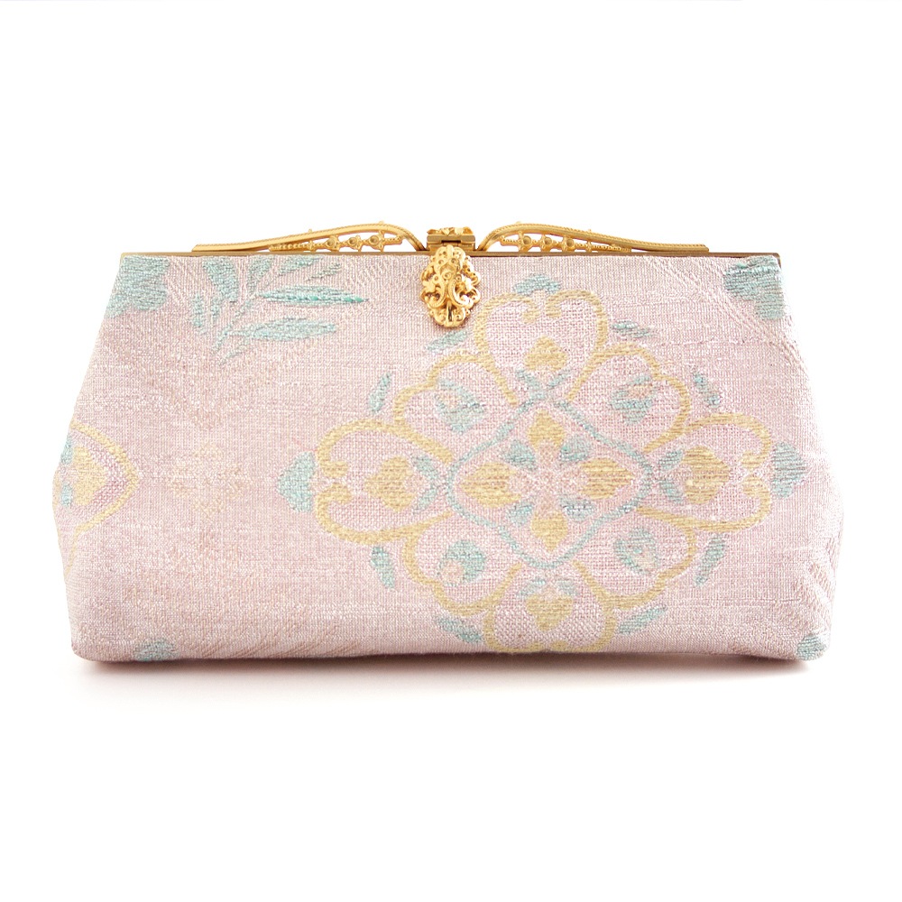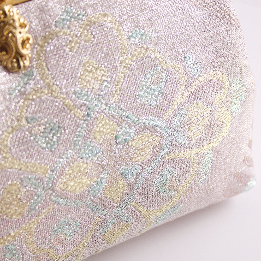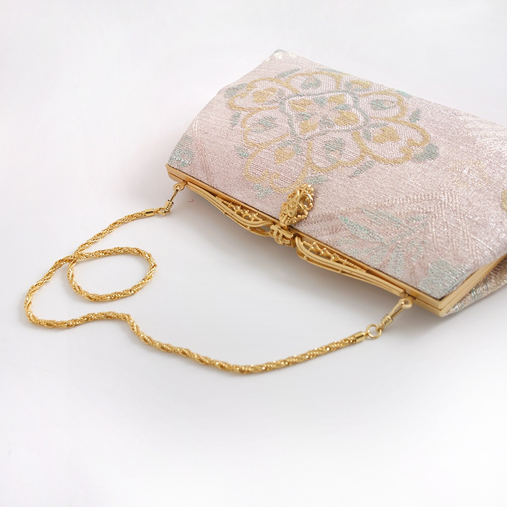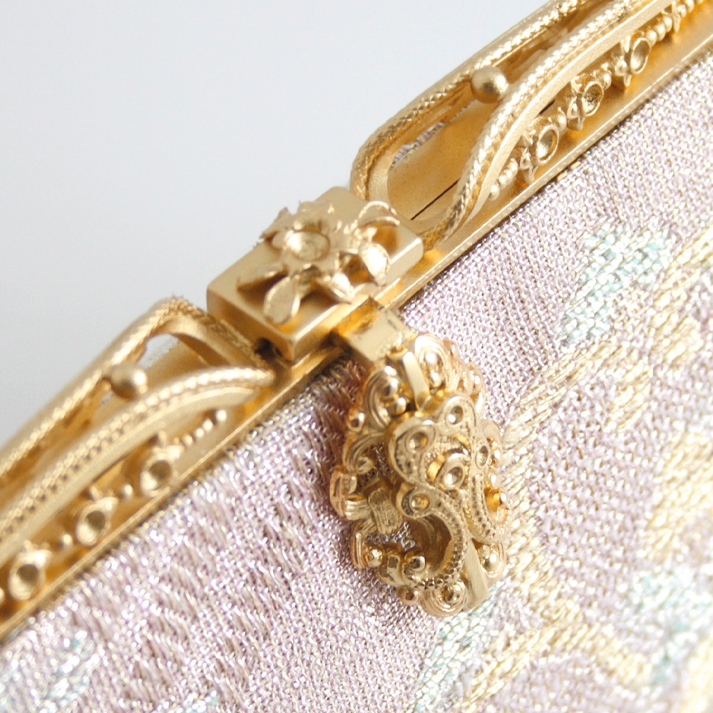 煌びやかな金銀糸で伝統的な花菱文様を表現した西陣織に、装飾的な口金がアクセントのパーティーバッグです。前面と背面でピンクのお色味が異なる凝った印象で、柔らかな色合いときらめきが女性らしく、落ち着きのある華やかさ。