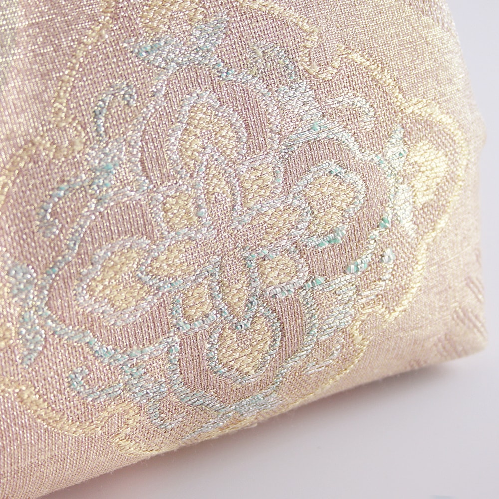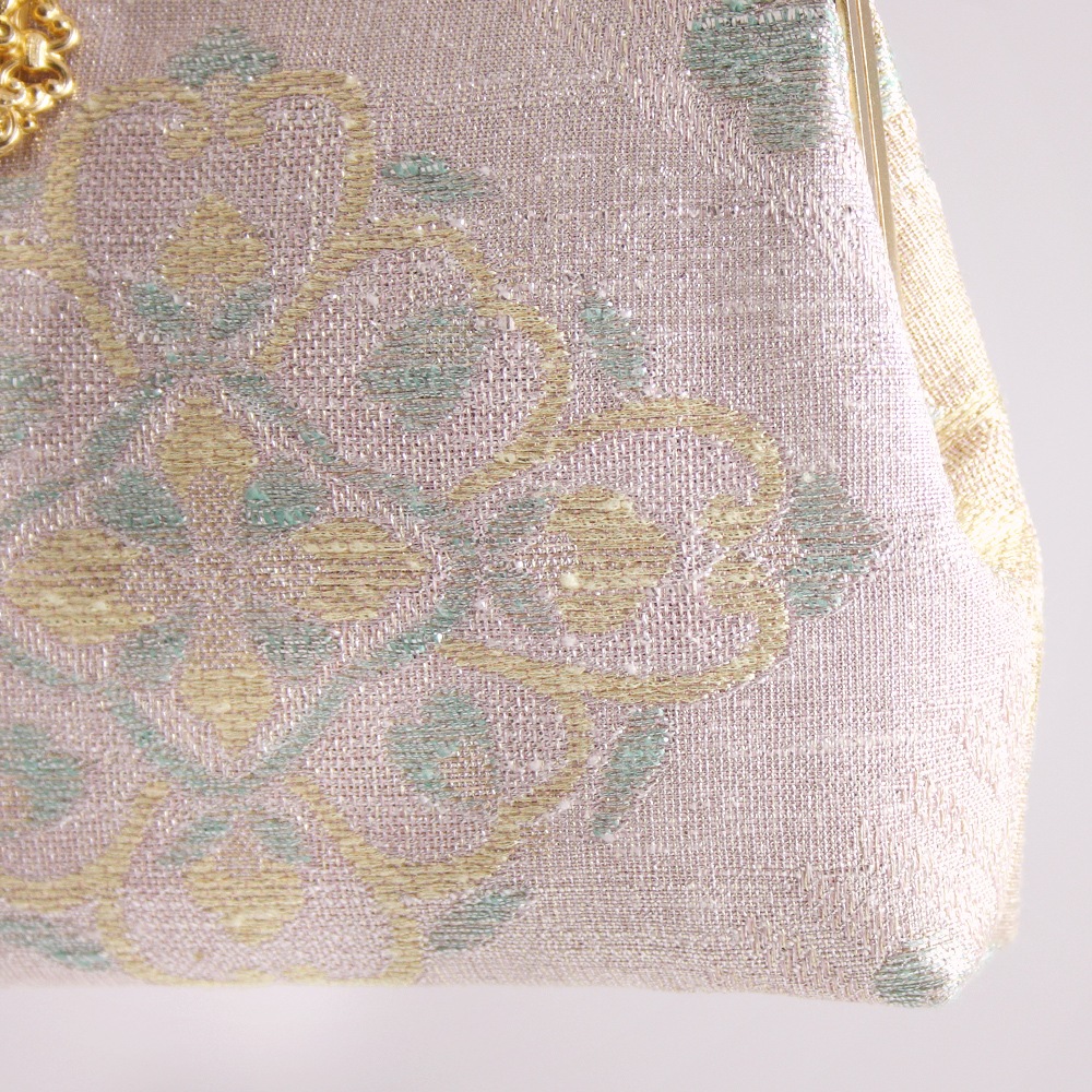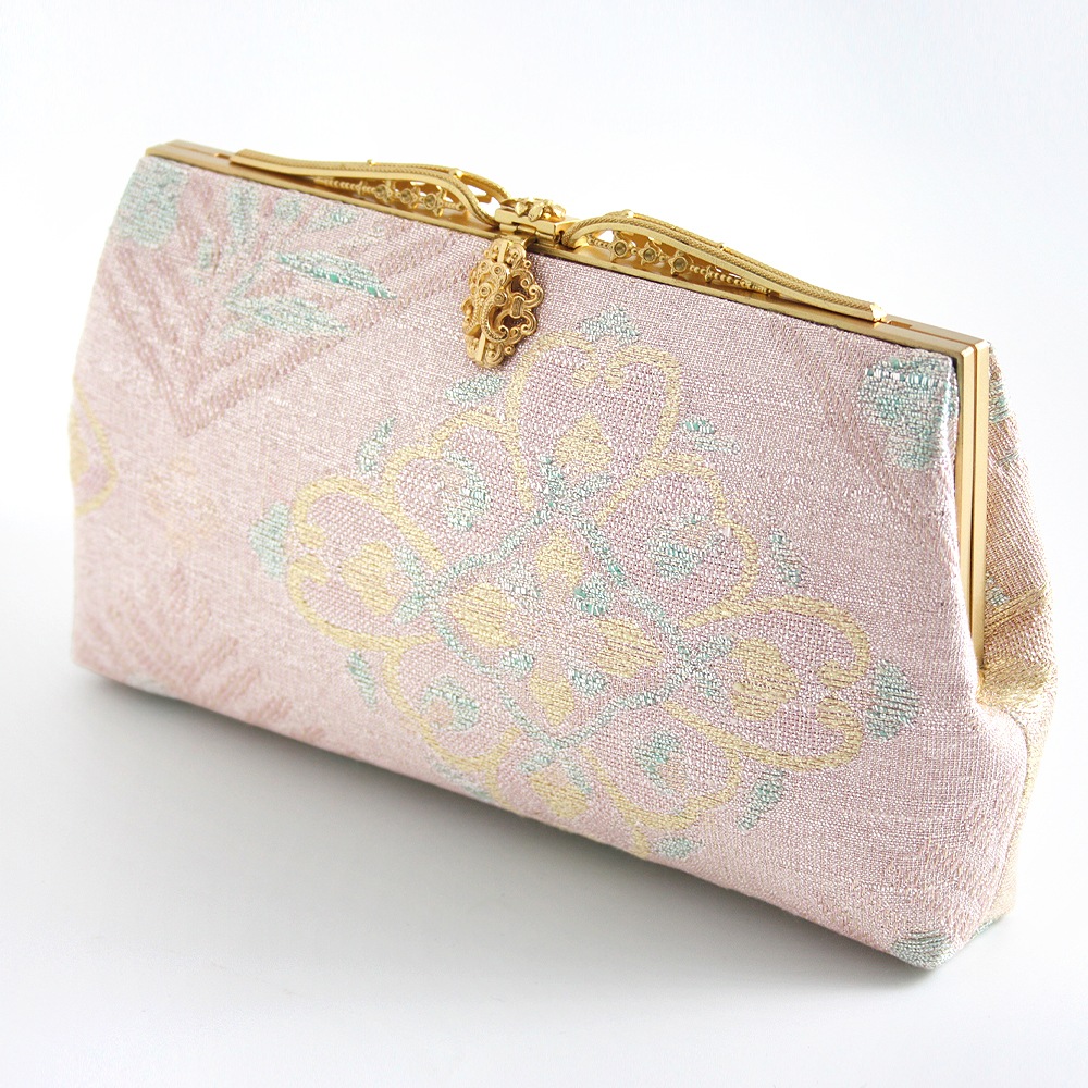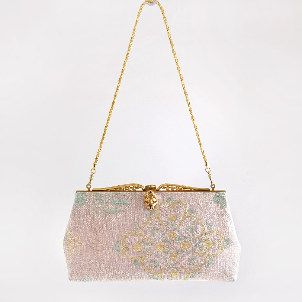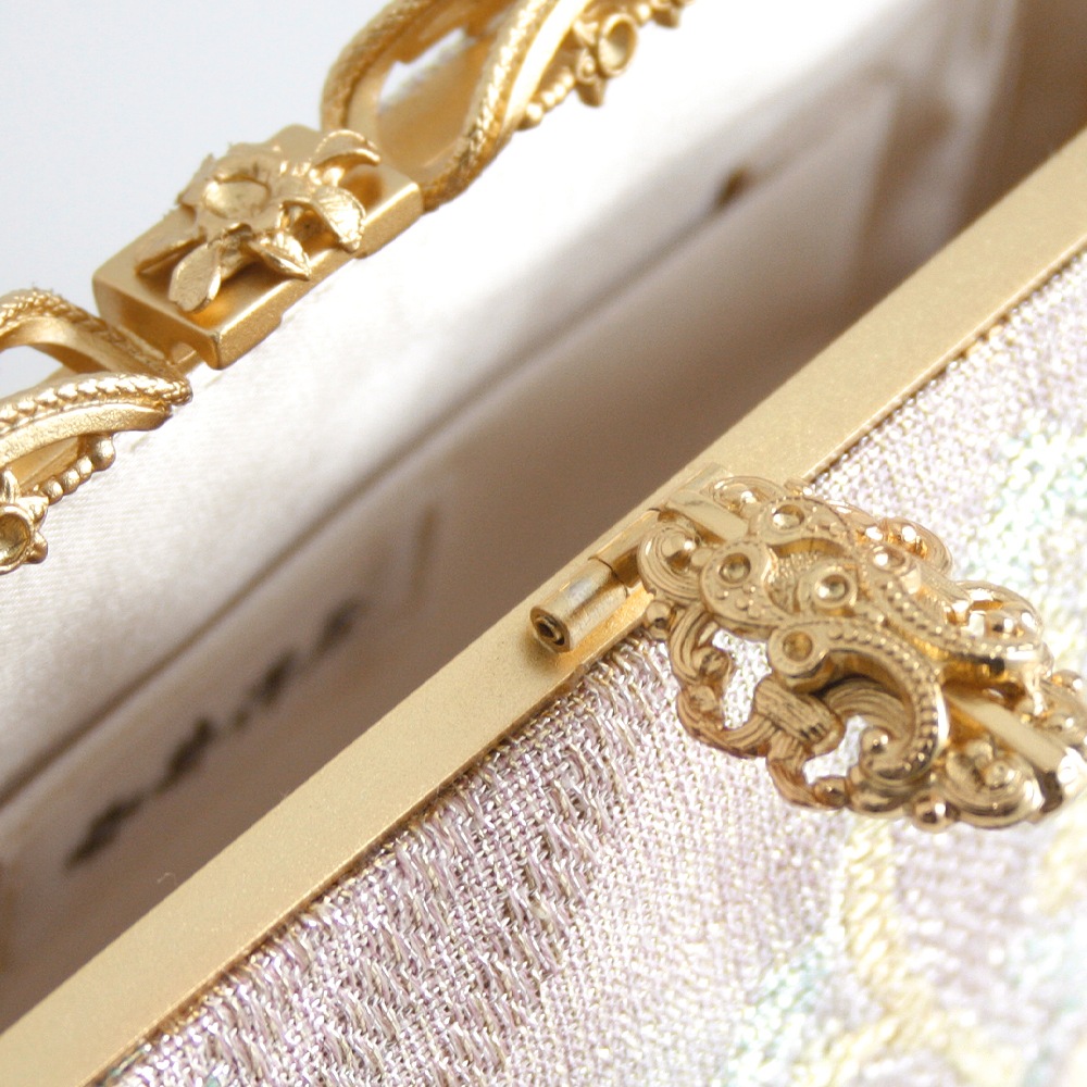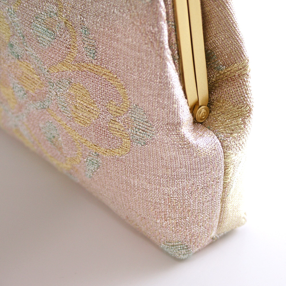 煌びやかな金銀糸で伝統的な花菱文様を表現した西陣織に、装飾的な口金がアクセントのパーティーバッグです。前面と背面でピンクのお色味が異なる凝った印象で、柔らかな色合いときらめきが女性らしく、落ち着きのある華やかさ。