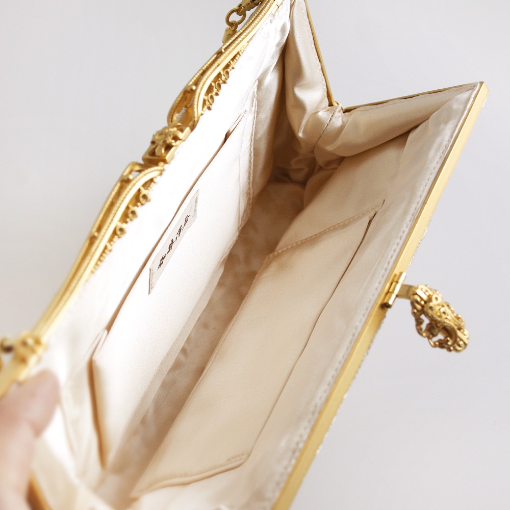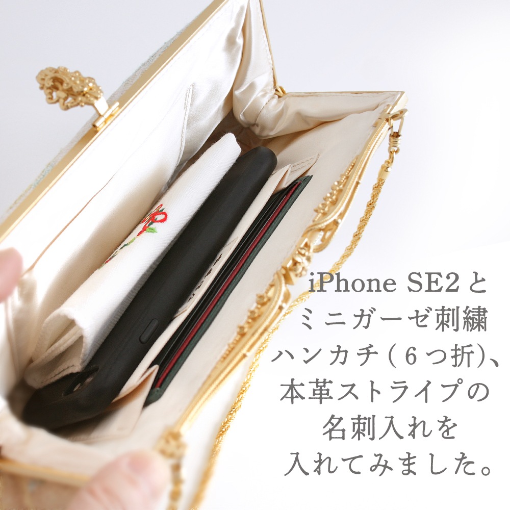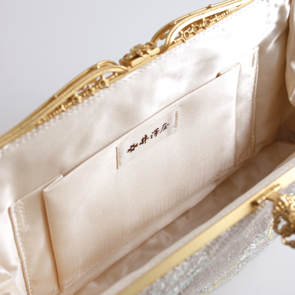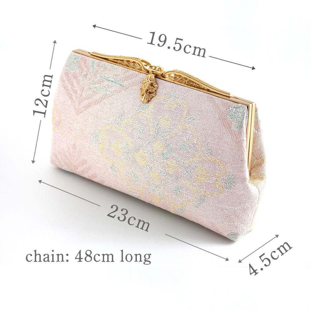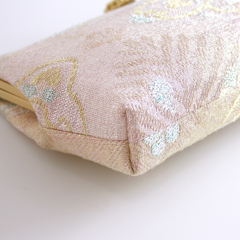 煌びやかな金銀糸で伝統的な花菱文様を表現した西陣織に、装飾的な口金がアクセントのパーティーバッグです。前面と背面でピンクのお色味が異なる凝った印象で、柔らかな色合いときらめきが女性らしく、落ち着きのある華やかさ。