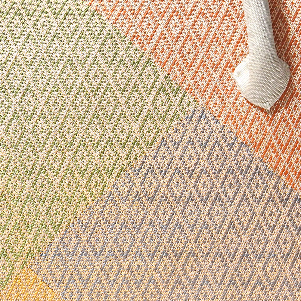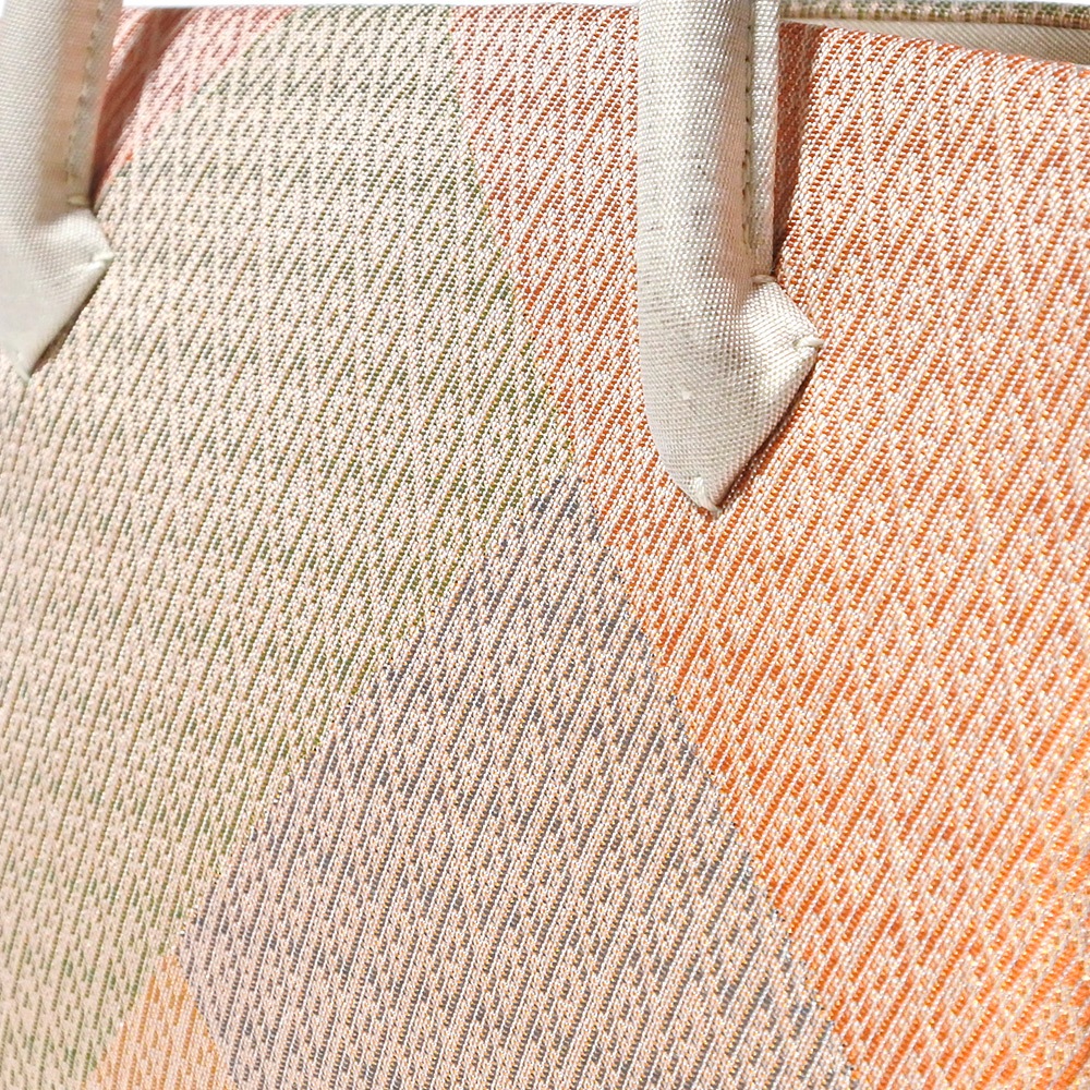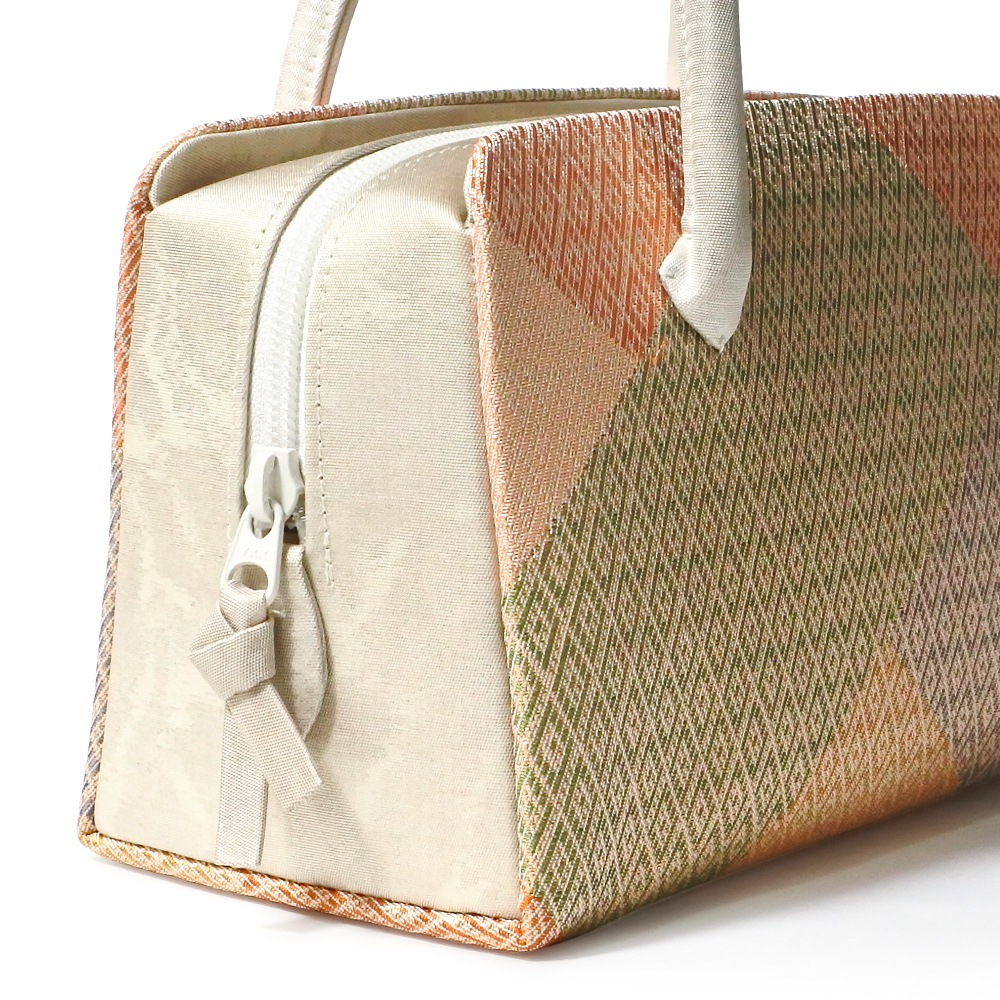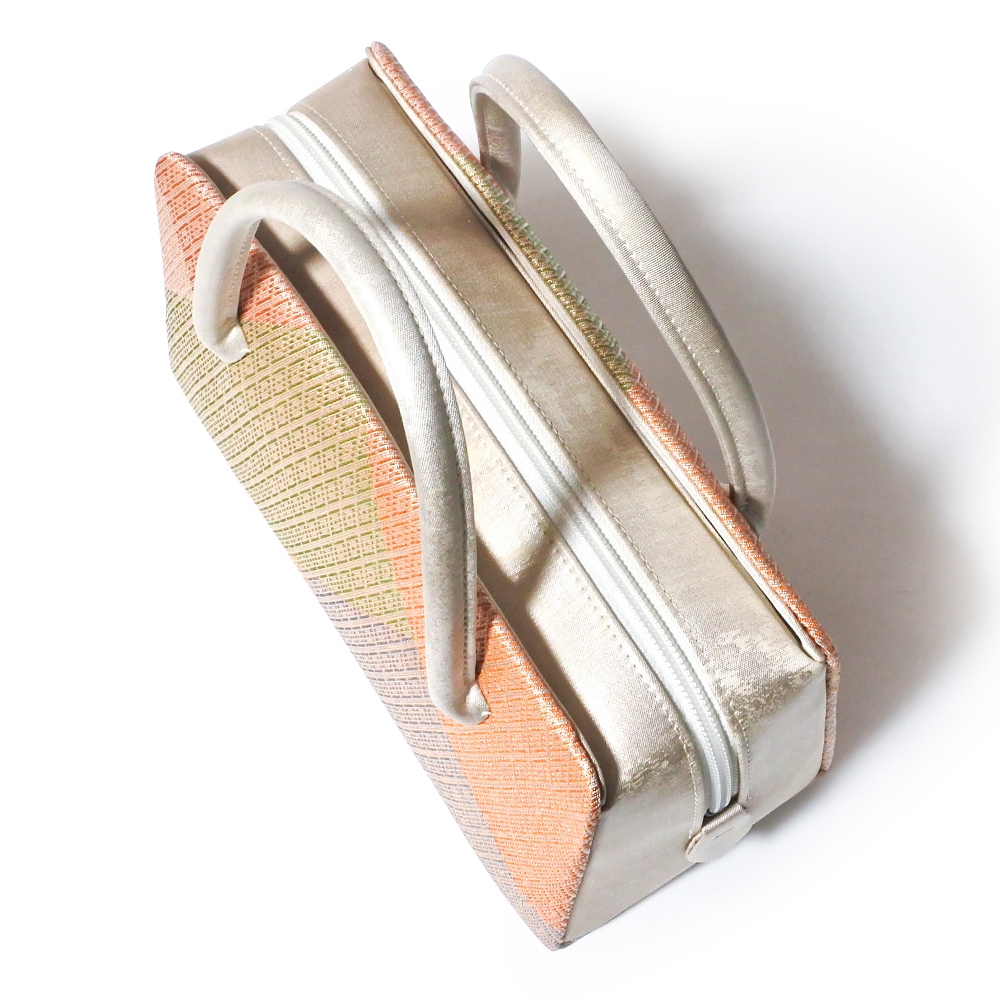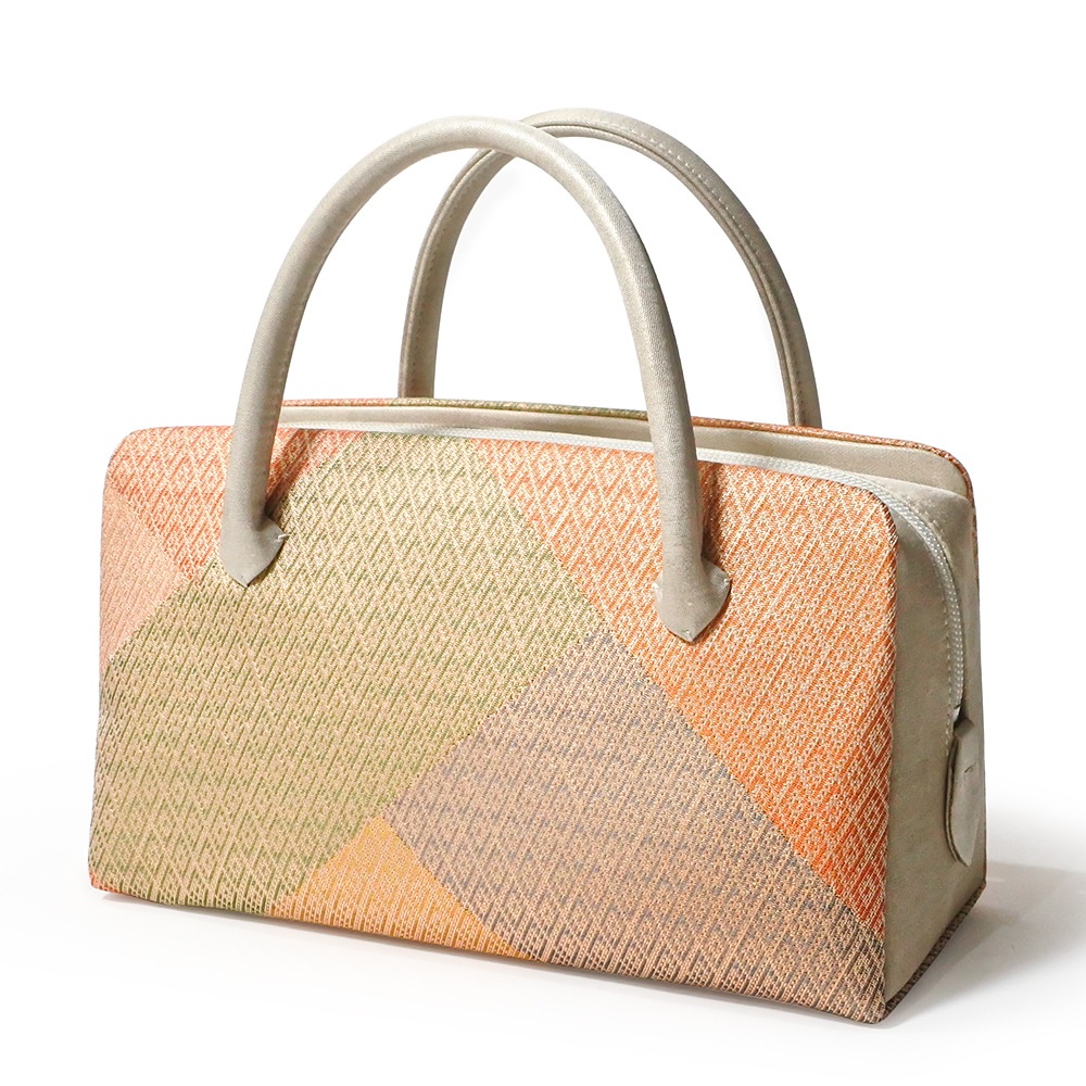 鮮やかなお色で、モダンアートのような幾何学構成柄がお洒落なデザインの和装バッグです。柄の上から金属糸で縦型の細かな菱文が織り込まれており、光の具合で美しい光沢が生まれます。主に付け下げや訪問着と合わせていただけるほか、洋装とも相性の良いお色柄です。