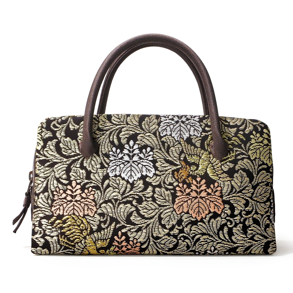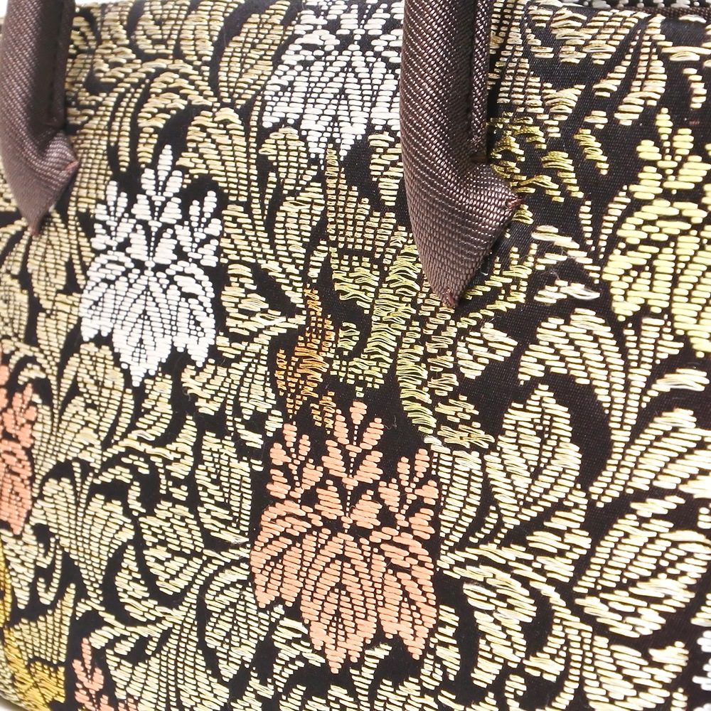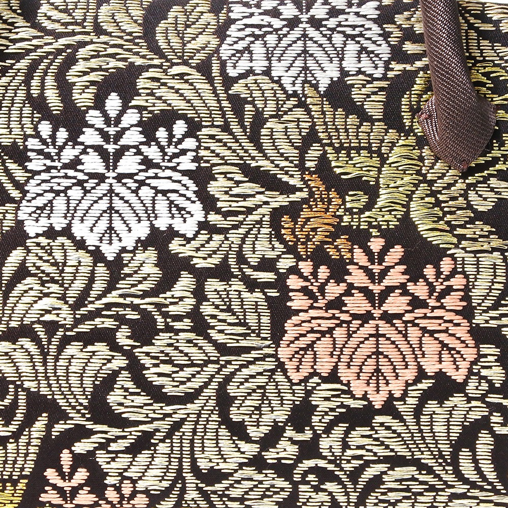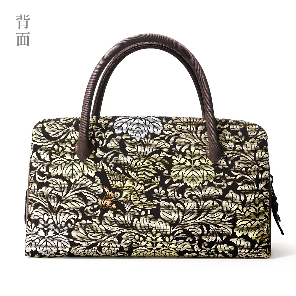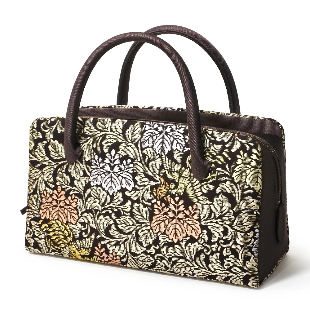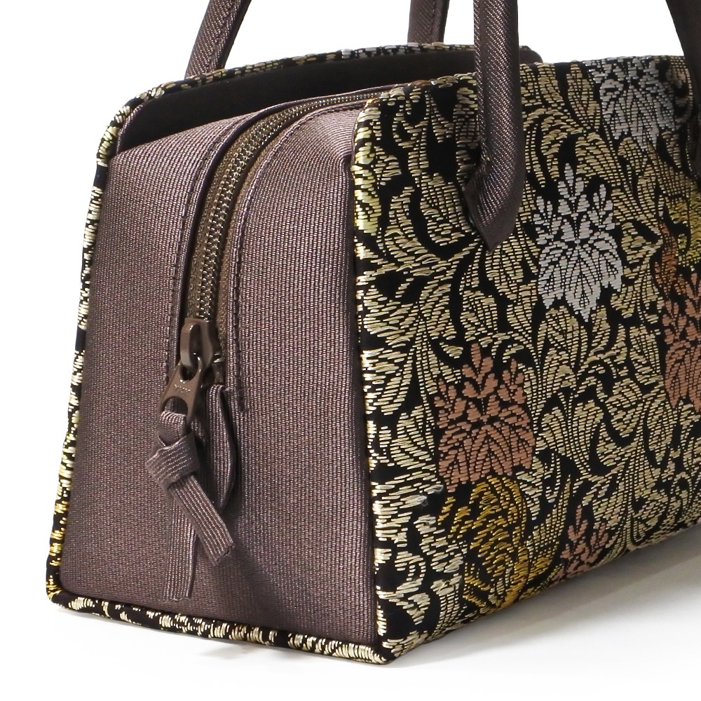 こげ茶の背景に、唐草や鳳凰の淡い金糸がはっきりとしたコントラストを描く、クラシックな印象の和装バッグです。スモーキーピンクやグレーの桐文様を差し色に添えて緩急を加えたデザイン。落ち着いたシックなお色の小紋や付け下げ、訪問着などと相性のいいお色柄です。