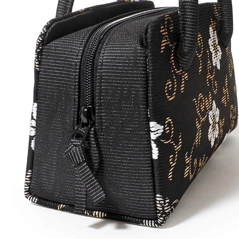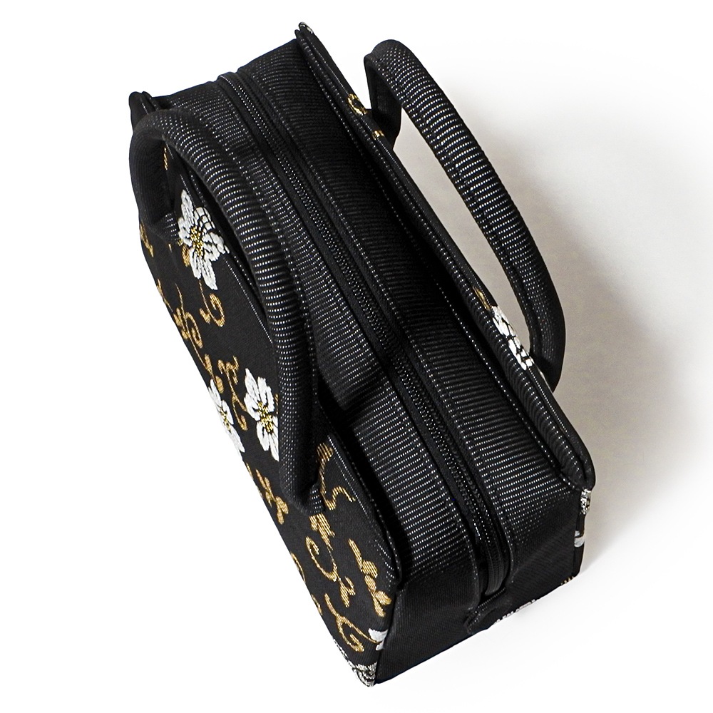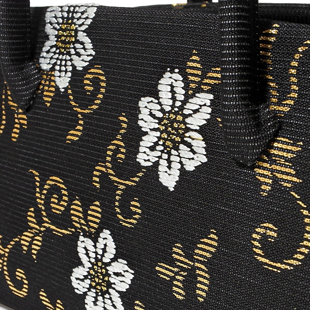 黒の絽の地に、落ち着いたお色の金糸と白糸で植物の鉄線を織り込んだ、夏の和装バッグです。鉄線の蔓に金糸を、花を白糸で表現し、銀糸で蝶を配した柄行き。配色を抑えたシンプルなデザインで、洋装にもお持ちいただけます。おしゃれ着から訪問着まで幅広く合わせられる、使いやすいバッグです。
