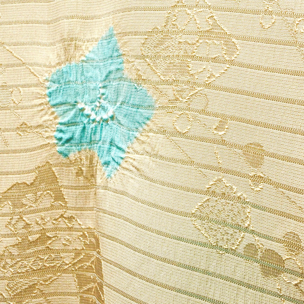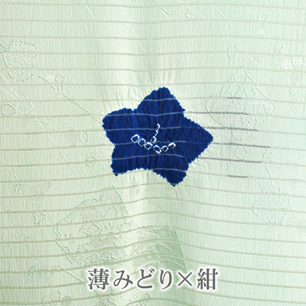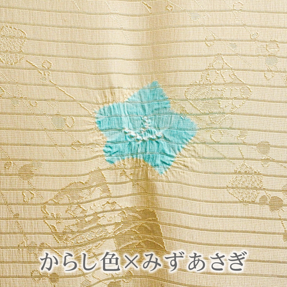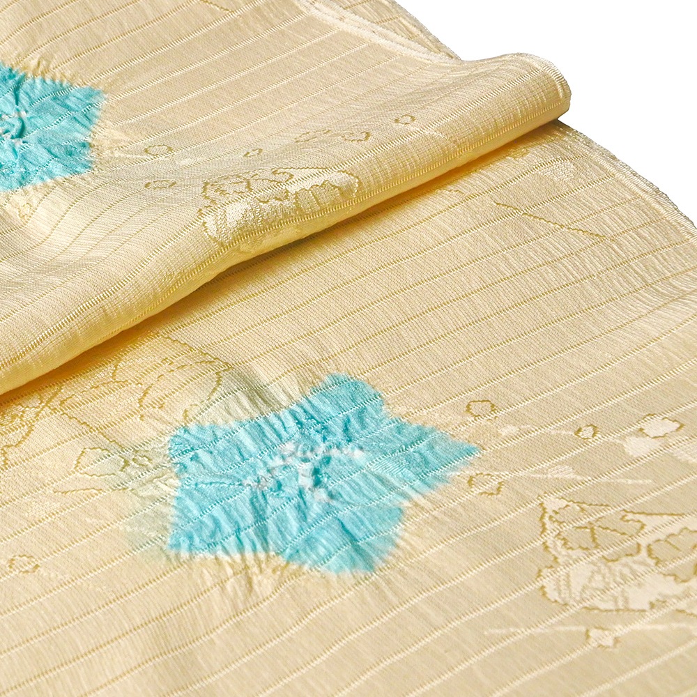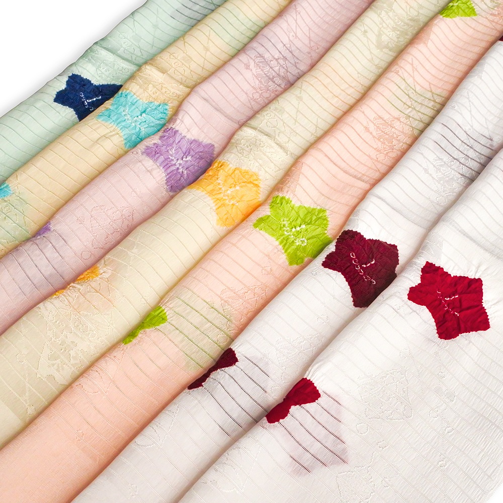 地紋が浮かぶ白地の絽に、大きめの水仙の絞り柄を施した夏用の帯揚げです。柔らかいパステル調の地色に、はっきりとしたお色がアクセントになった輪出が帯から覗きます。6月~9月の装いに合わせて、幅広く合わせていただけます。