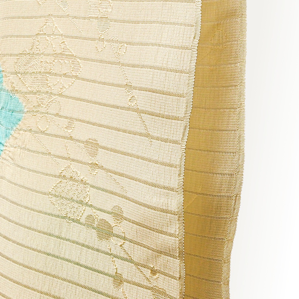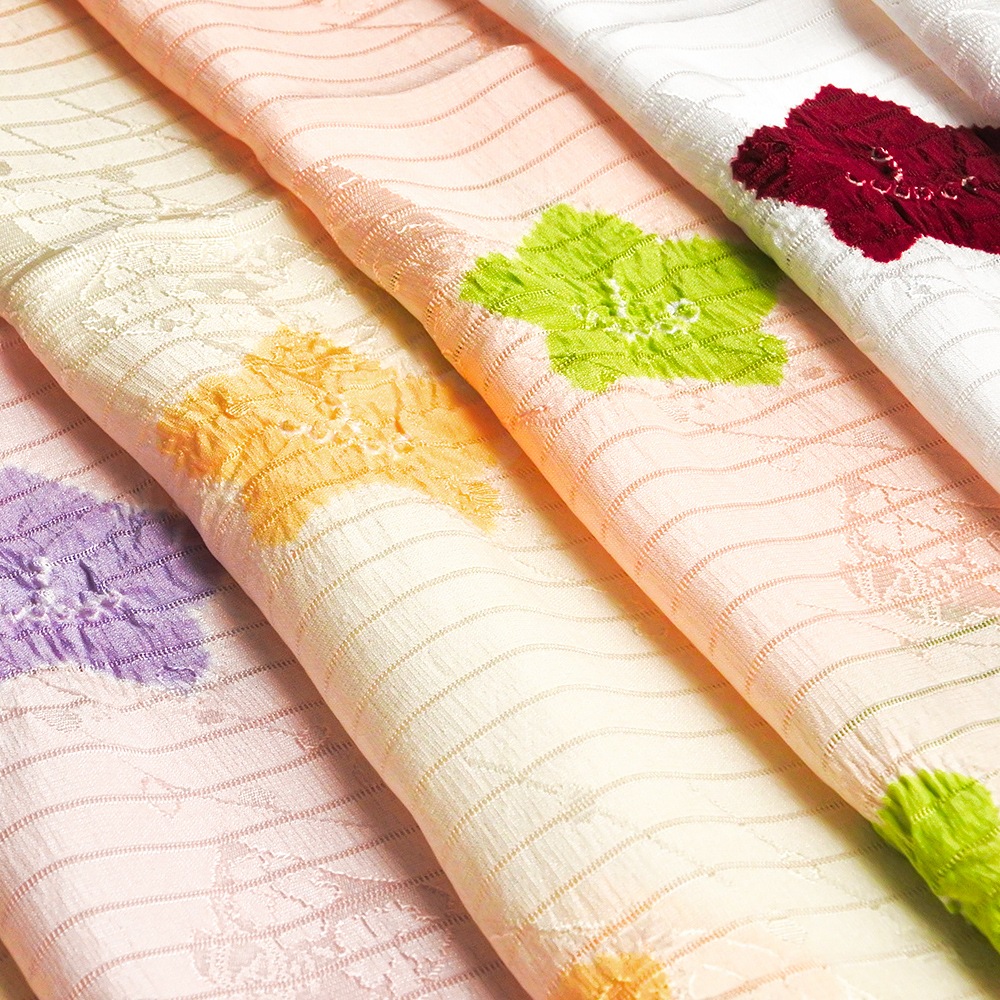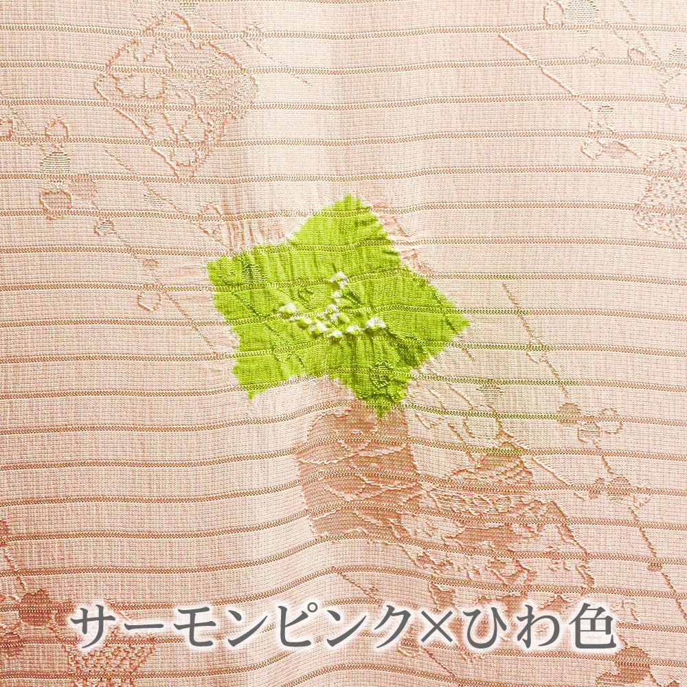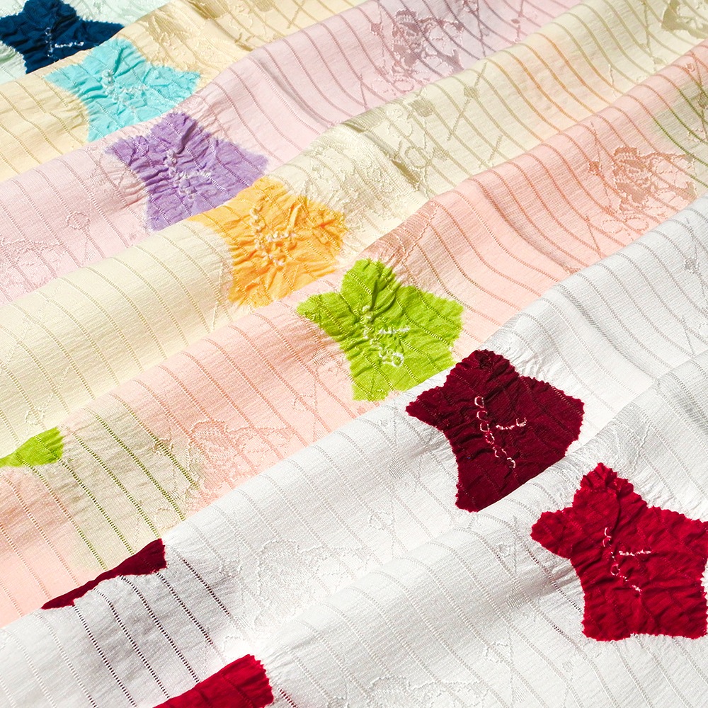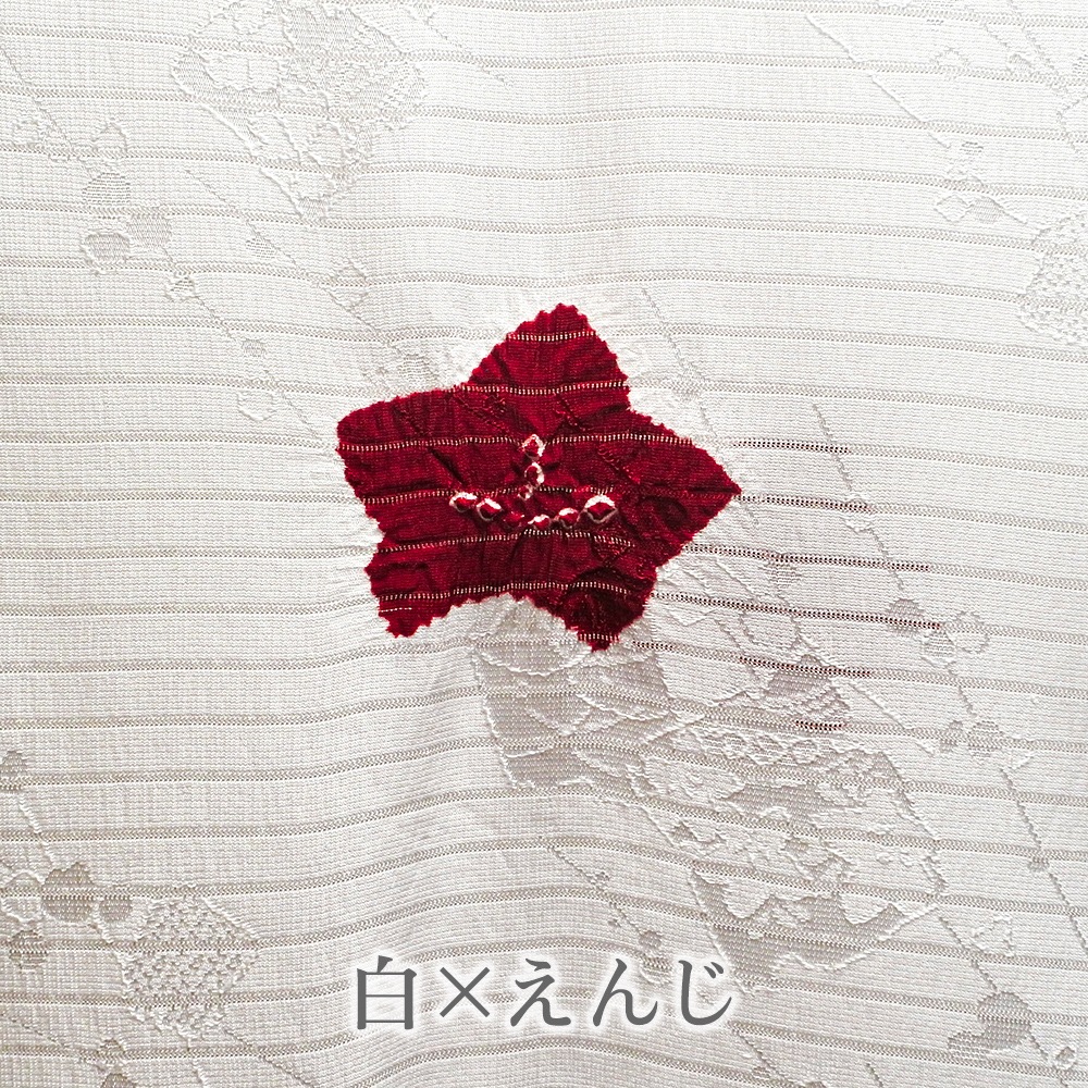 地紋が浮かぶ白地の絽に、大きめの水仙の絞り柄を施した夏用の帯揚げです。柔らかいパステル調の地色に、はっきりとしたお色がアクセントになった輪出が帯から覗きます。6月~9月の装いに合わせて、幅広く合わせていただけます。