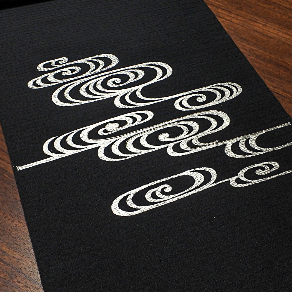 銀彩のみで美しく描いた流水文様の絽の新塩瀬帯です。あらたまったお席にもお使いいただけます。同柄の金彩仕様と比べて、カジュアルな装いとのコーディネイトにも取り入れていただける、すっきりとした合わせやすいお色柄です。