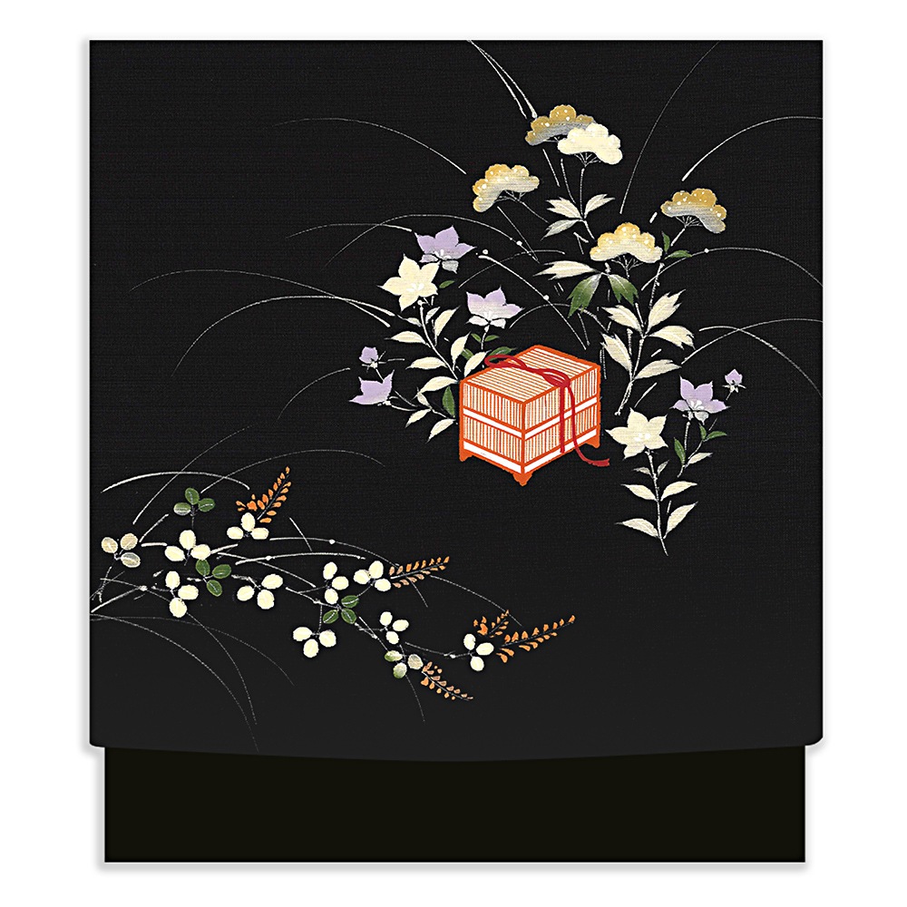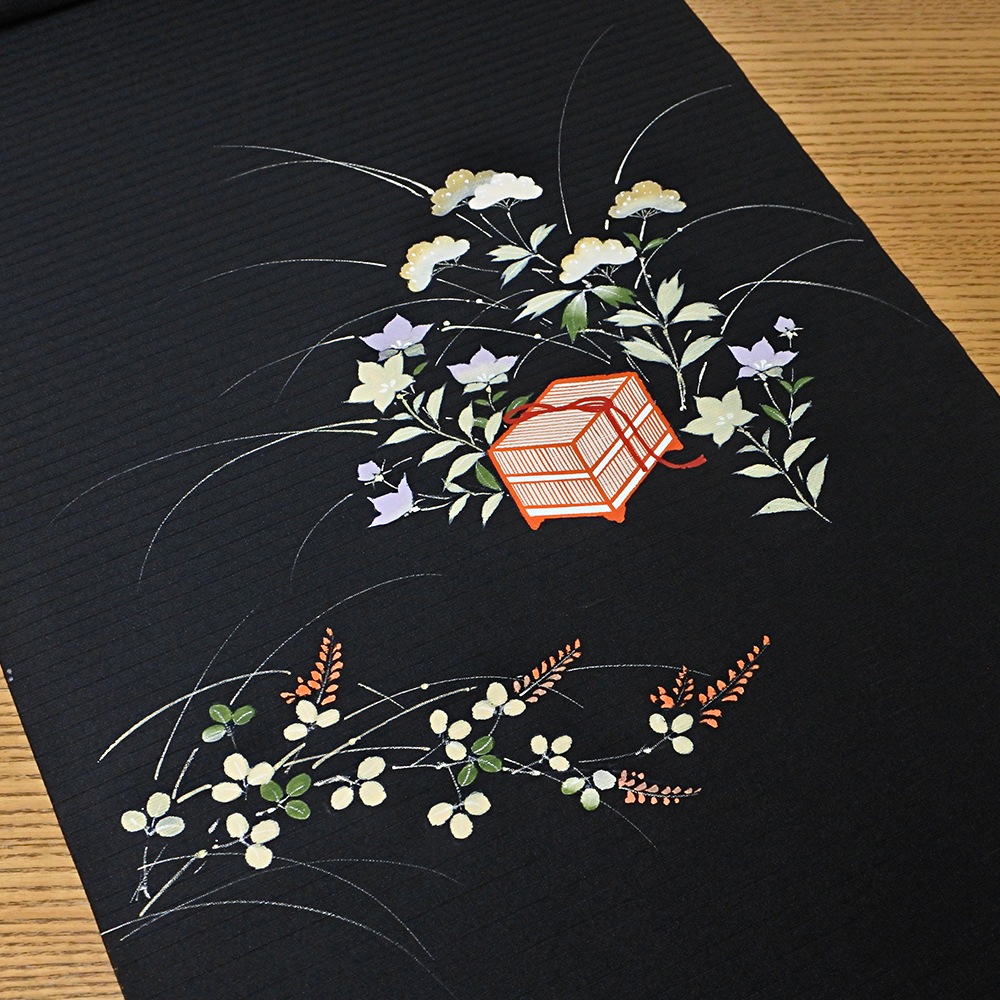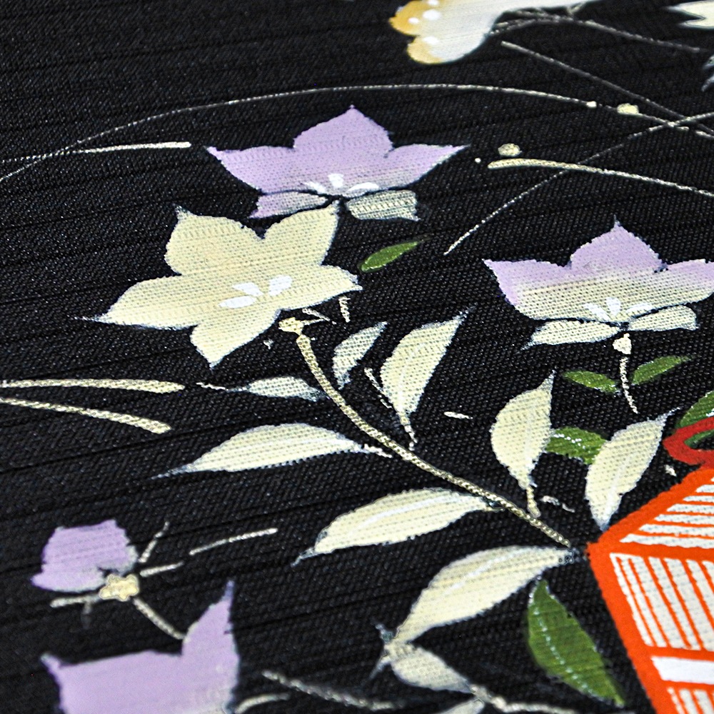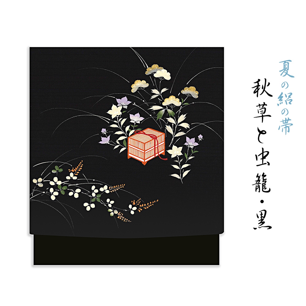 夏の新塩瀬帯「秋草と虫籠」 絽・黒地