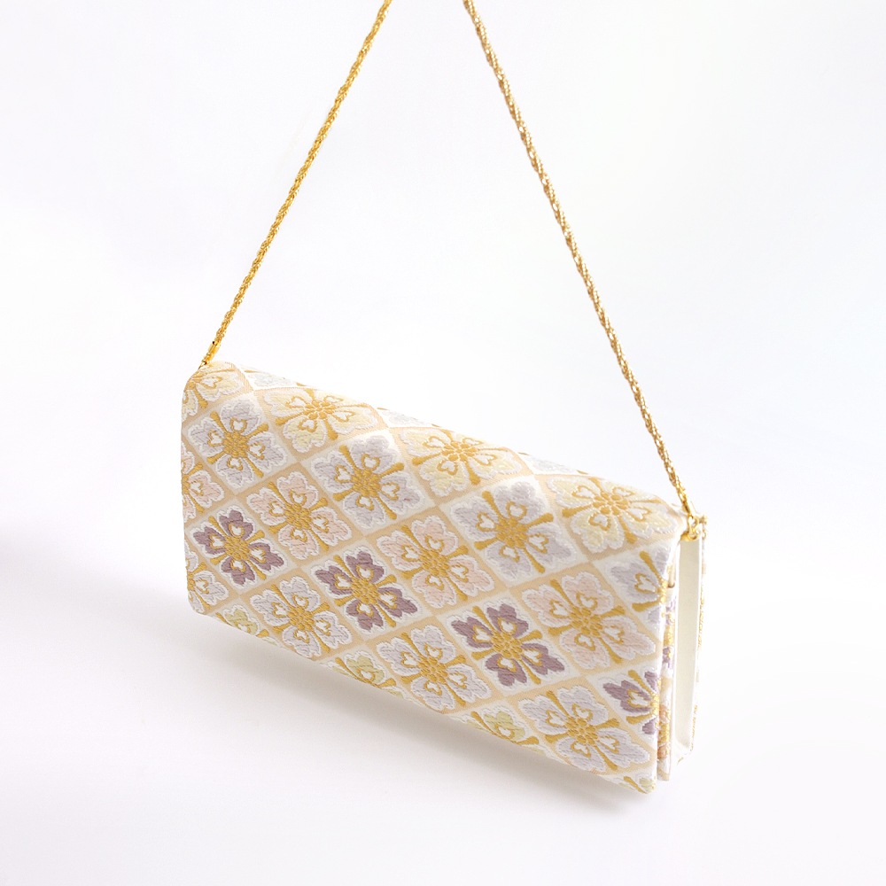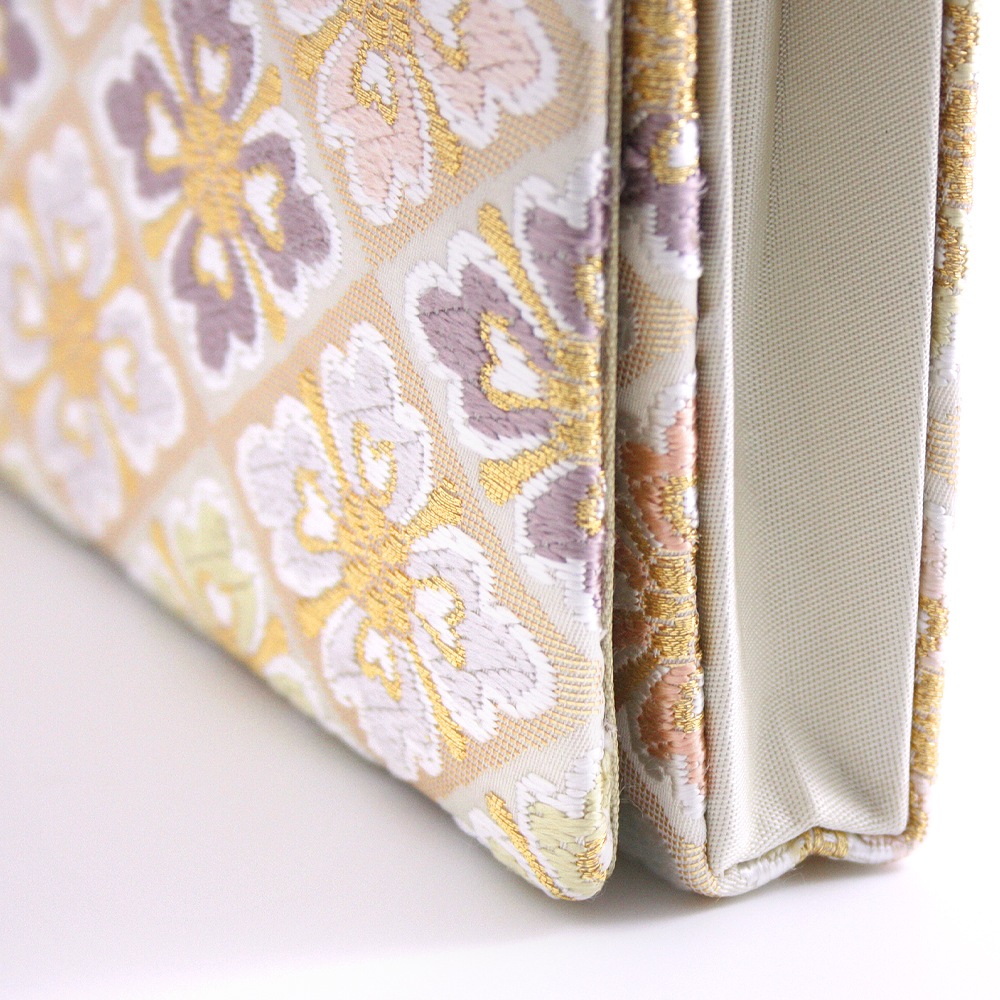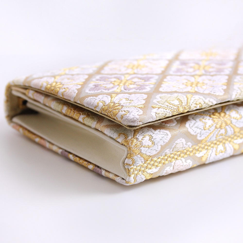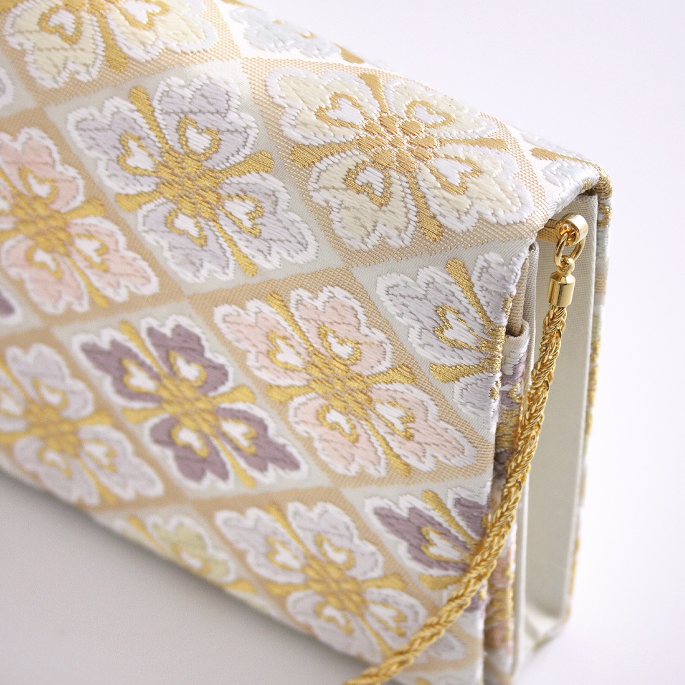 淡いベージュ地にパステルカラーの花菱文、可愛らしく上品な印象のパーティーバッグです。唐織のふっくらと立体的な花文様と金糸を織り込んだ菱形の地色の濃淡が光の角度により入れ替わる西陣織ならではの陰影の面白さも魅力です。