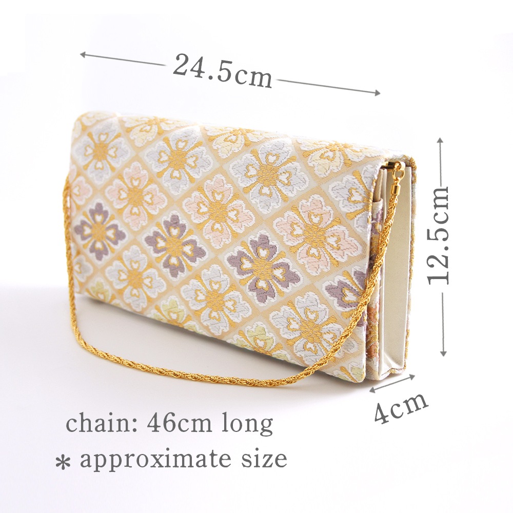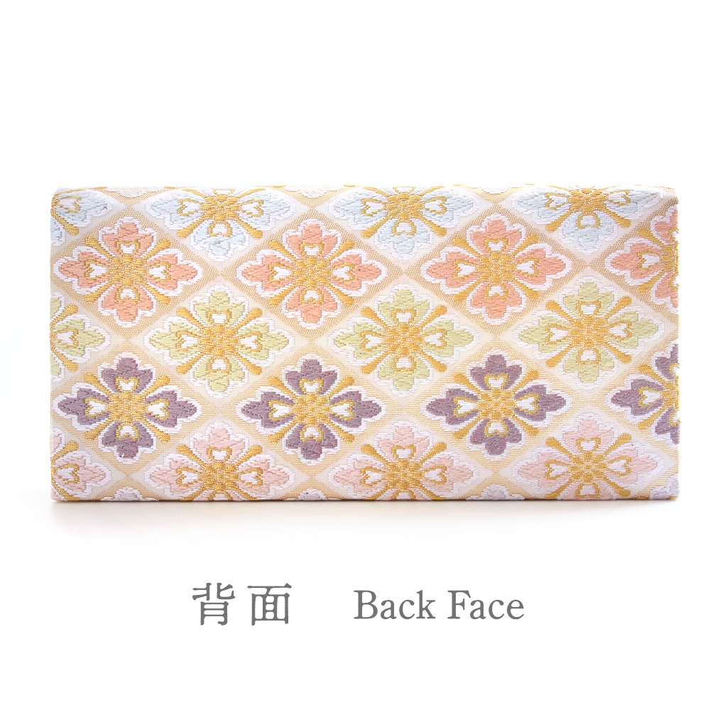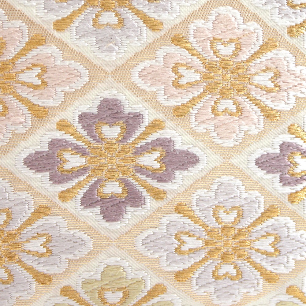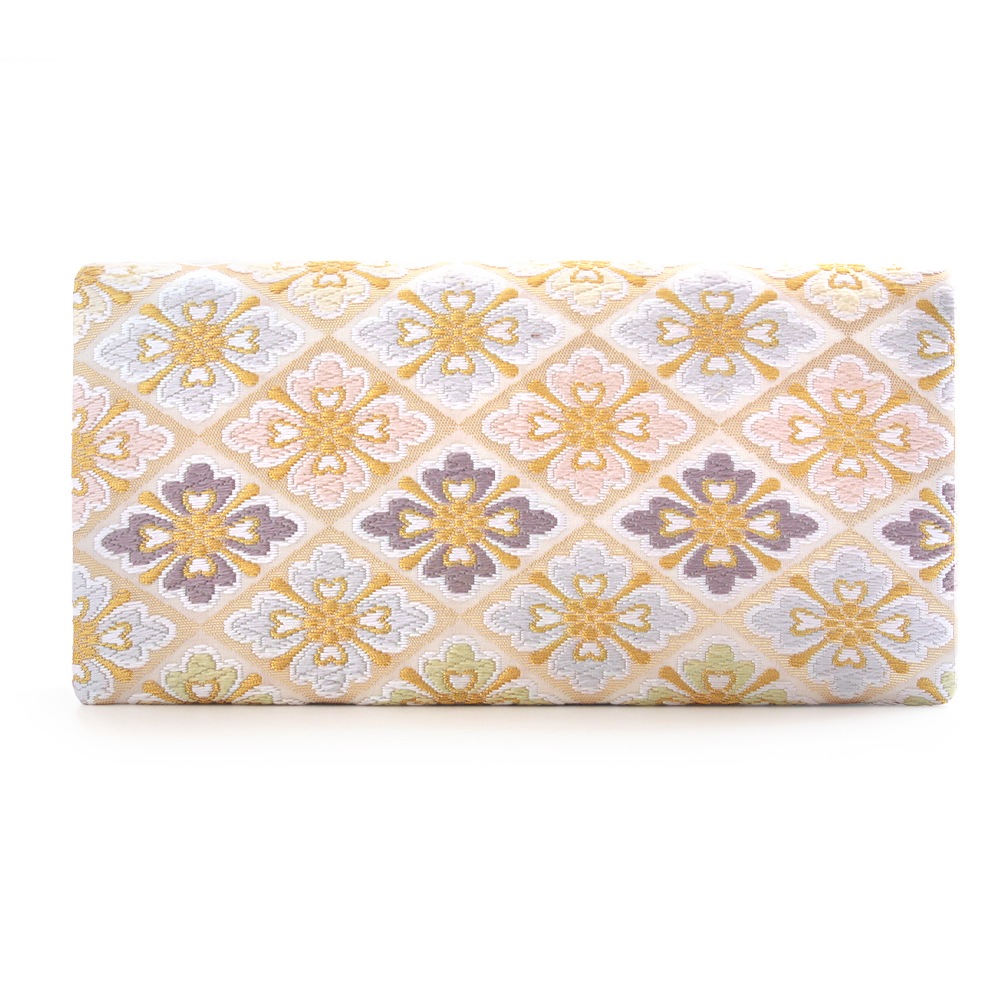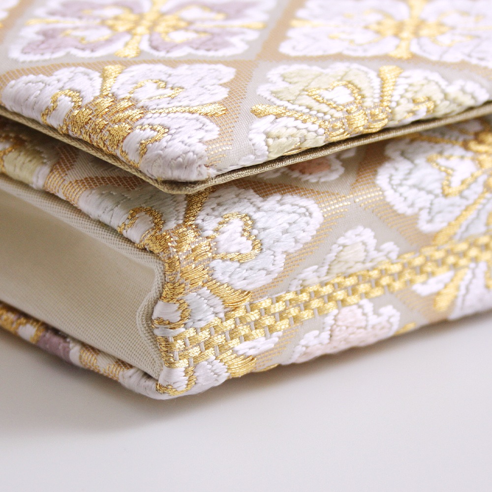 淡いベージュ地にパステルカラーの花菱文、可愛らしく上品な印象のパーティーバッグです。唐織のふっくらと立体的な花文様と金糸を織り込んだ菱形の地色の濃淡が光の角度により入れ替わる西陣織ならではの陰影の面白さも魅力です。