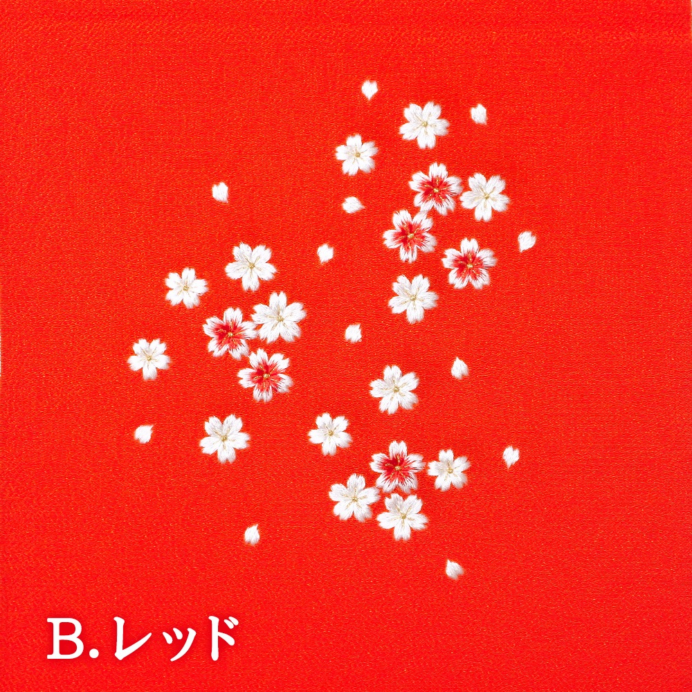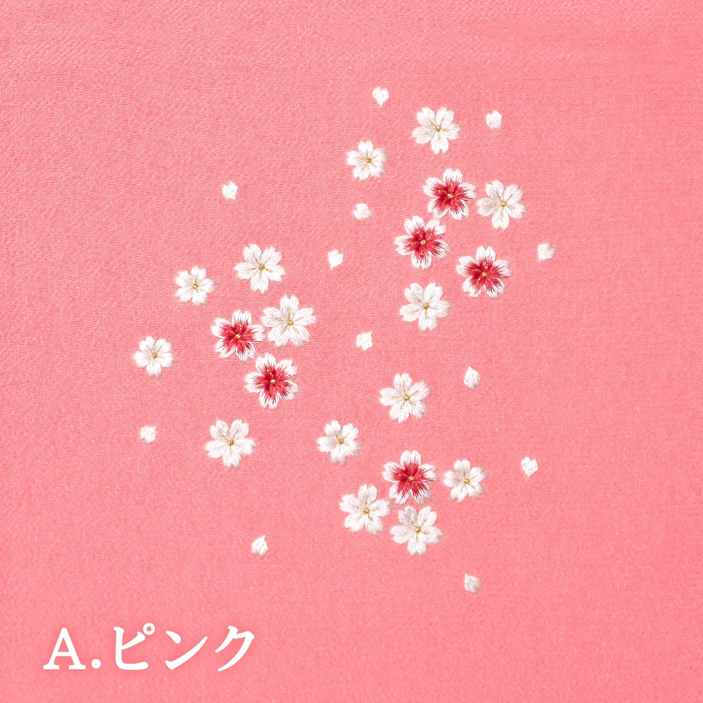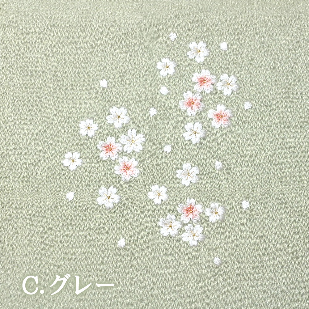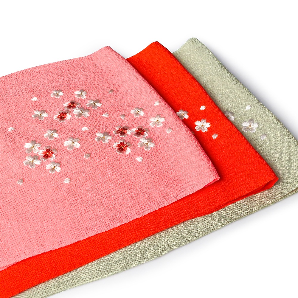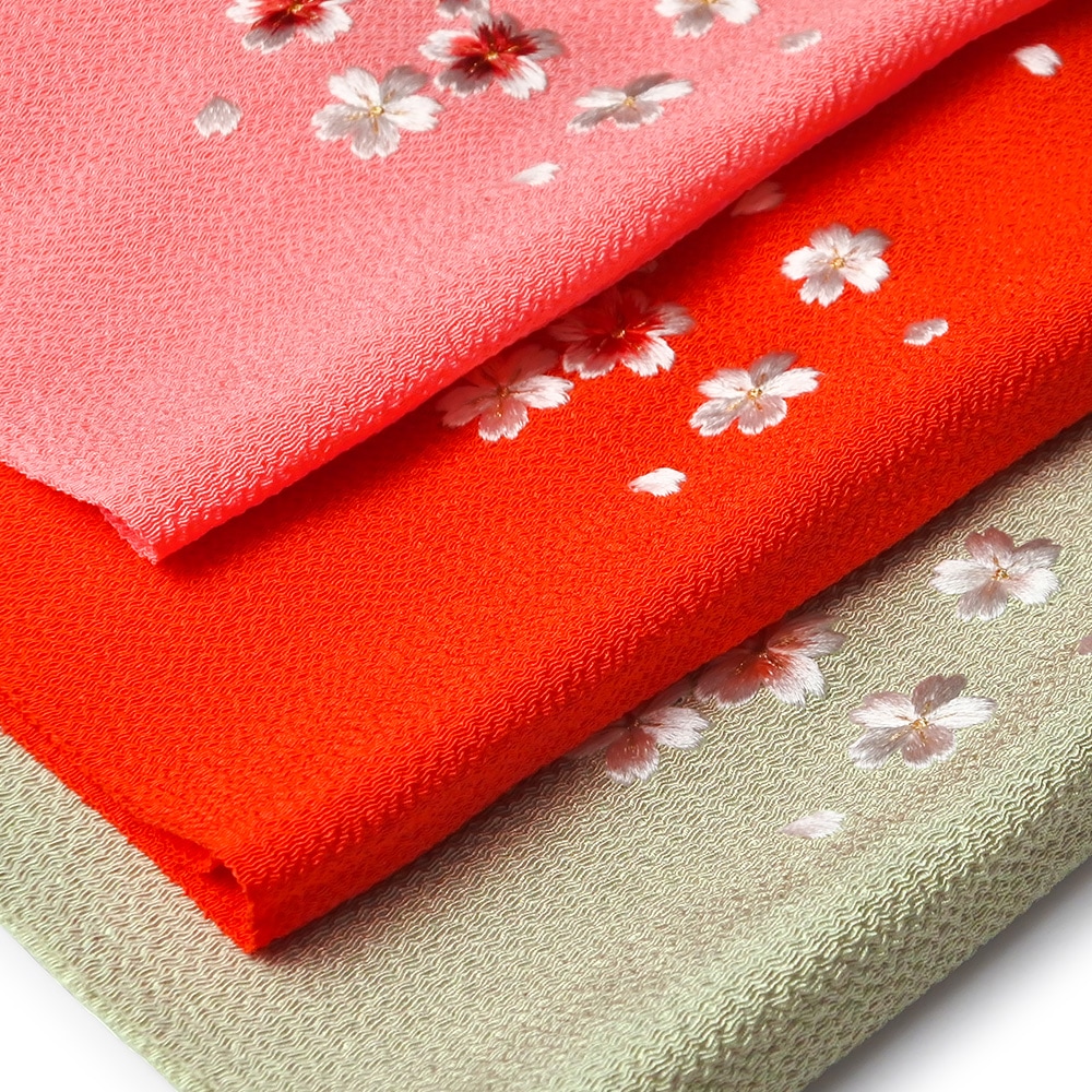 しぼの強いちりめん地に、細やかな桜の刺繍を施した可愛らしい印象の帯揚げです。特に振袖と合わせて、成人式や結婚式などの慶事の場にぴったり。当店のセミオーダー商品「かご付き巾着/尺籠」にもおすすめです。