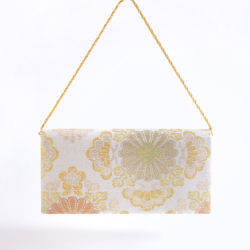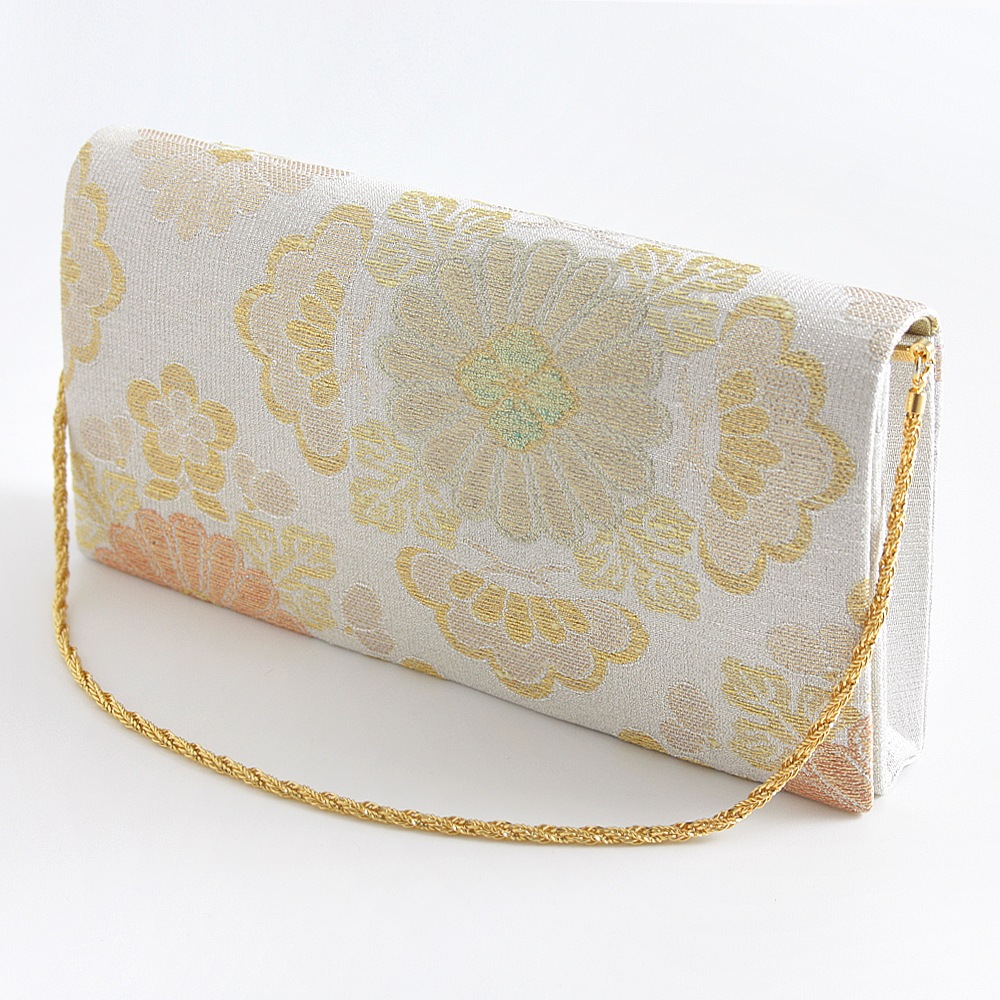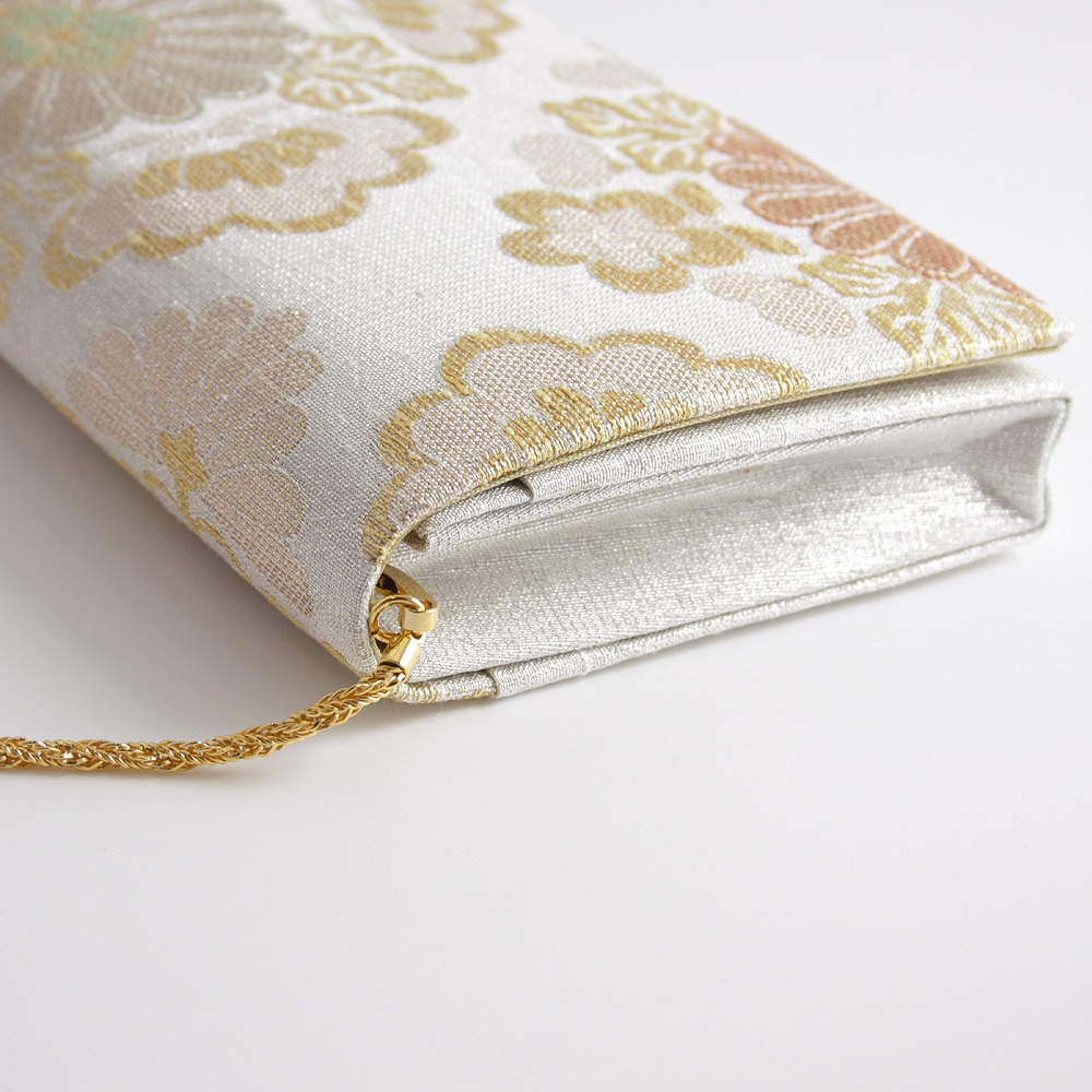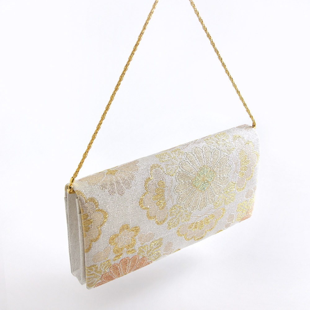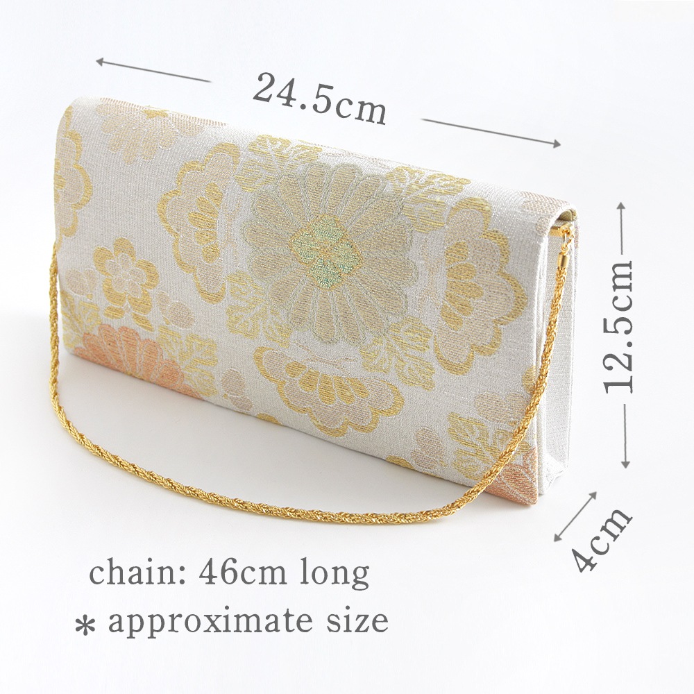 大振りの菊花をメインに松と梅が配された大胆な花菱柄と「ねん金綴織」ならではの品の良いきらめきが美しい、華やかな印象のパーティーバッグです。横長のスマートな形で持ちやすく、ご祝儀袋やスマホなどもゆったりと収納いただけて、和装はもちろんドレスなどの洋装に合わせていただくのも素敵です。