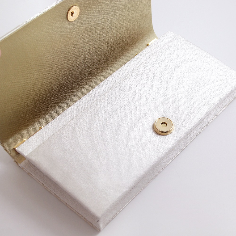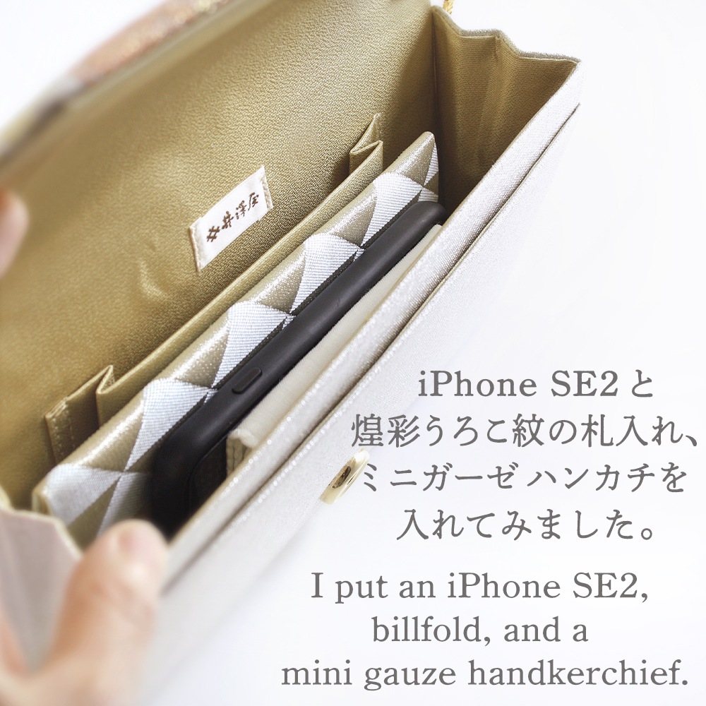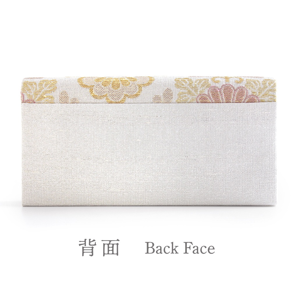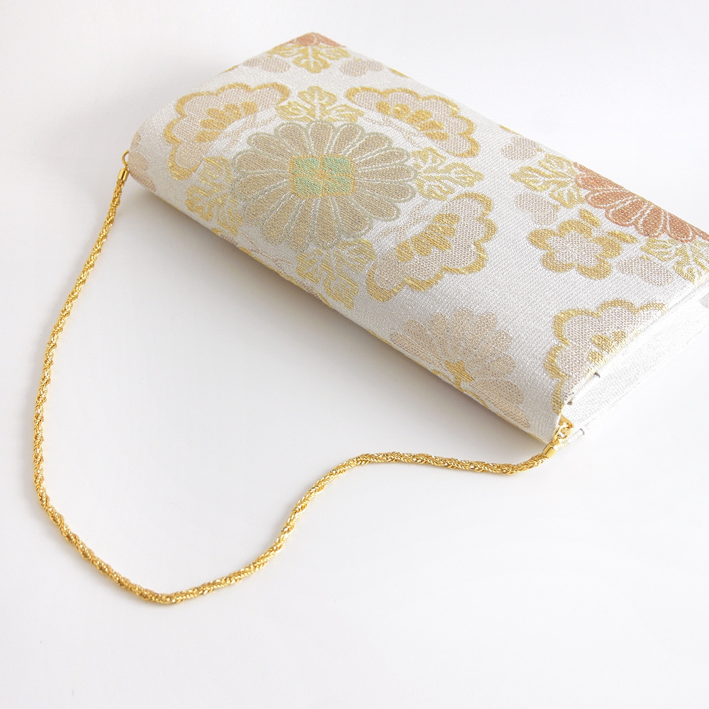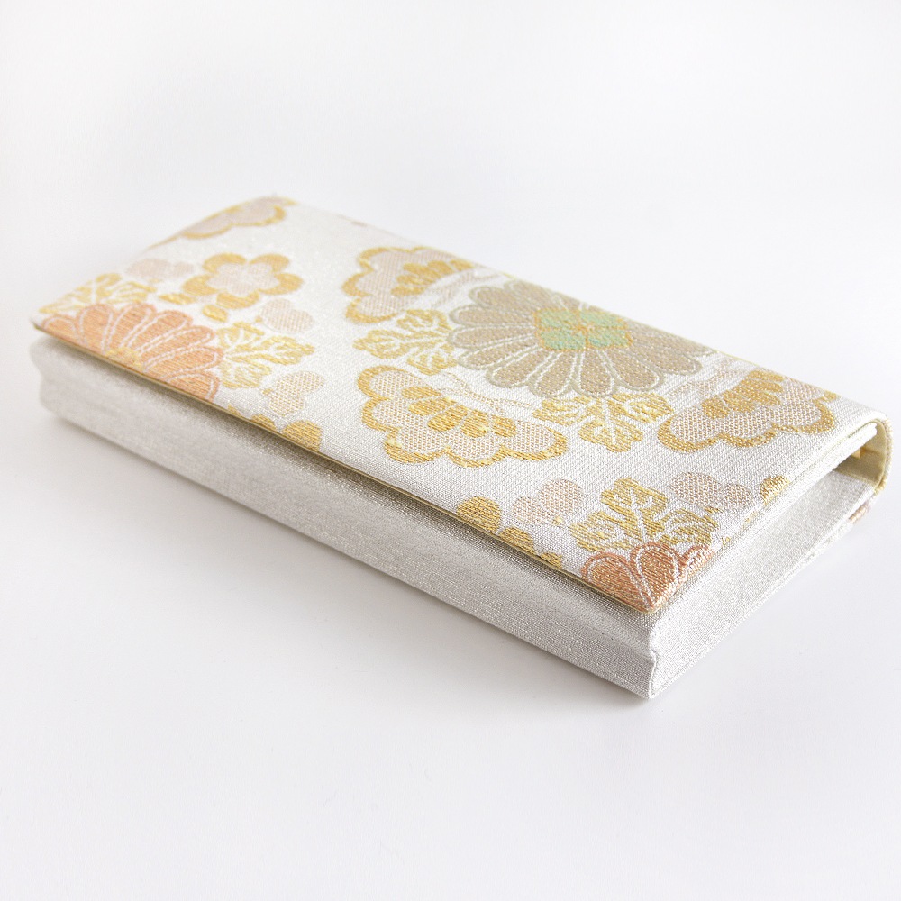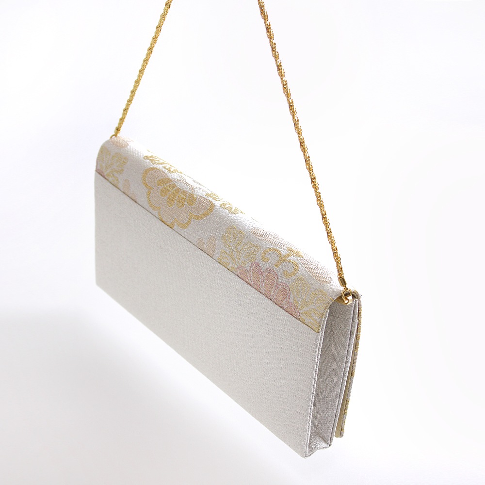 大振りの菊花をメインに松と梅が配された大胆な花菱柄と「ねん金綴織」ならではの品の良いきらめきが美しい、華やかな印象のパーティーバッグです。横長のスマートな形で持ちやすく、ご祝儀袋やスマホなどもゆったりと収納いただけて、和装はもちろんドレスなどの洋装に合わせていただくのも素敵です。