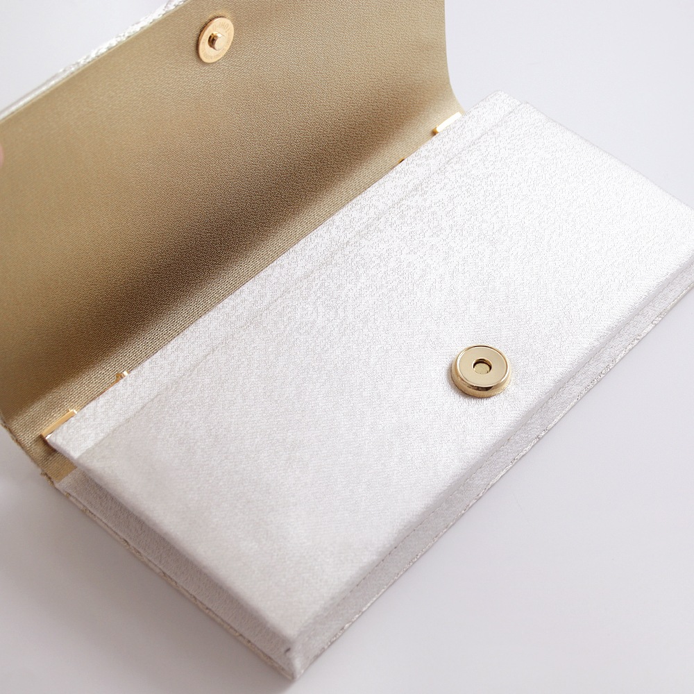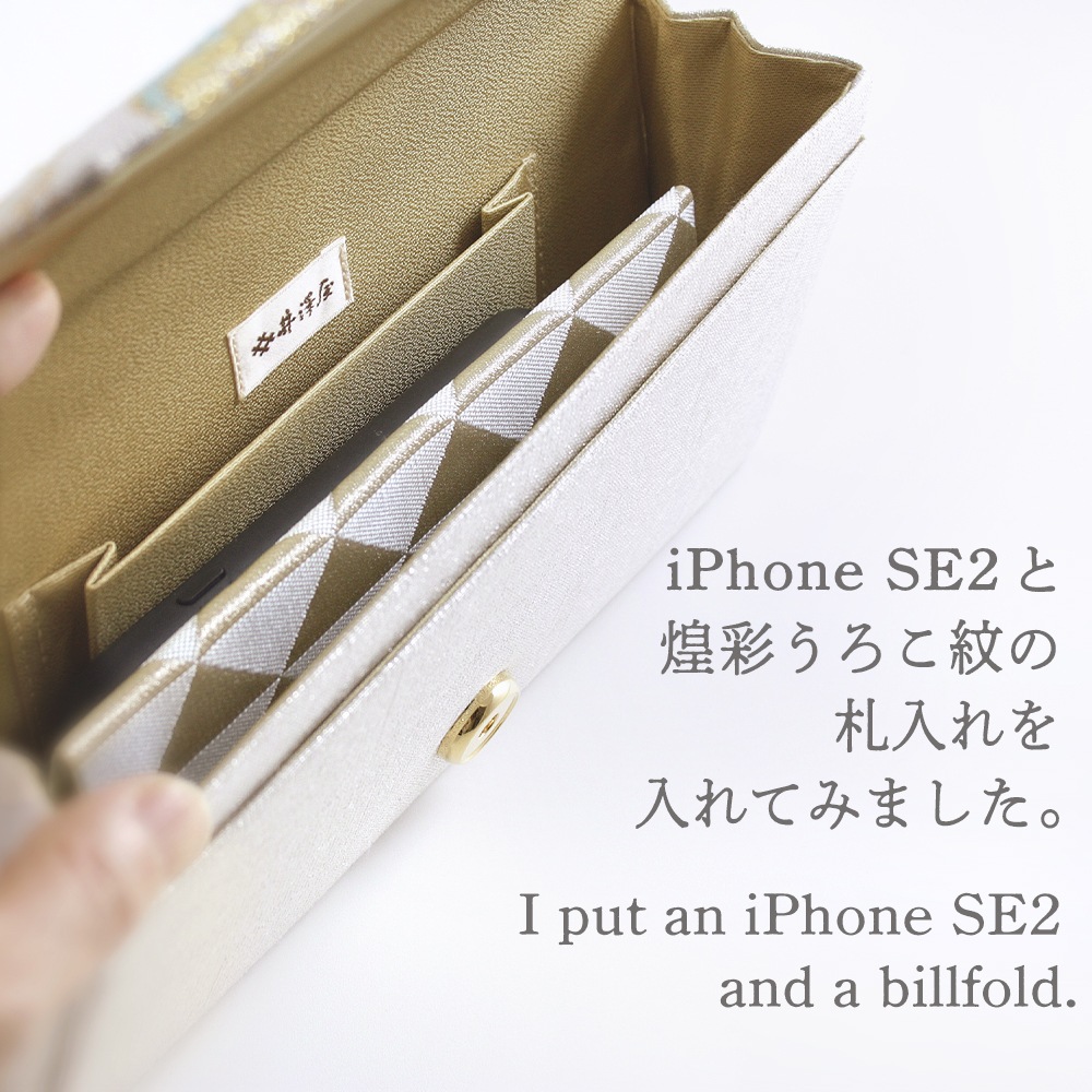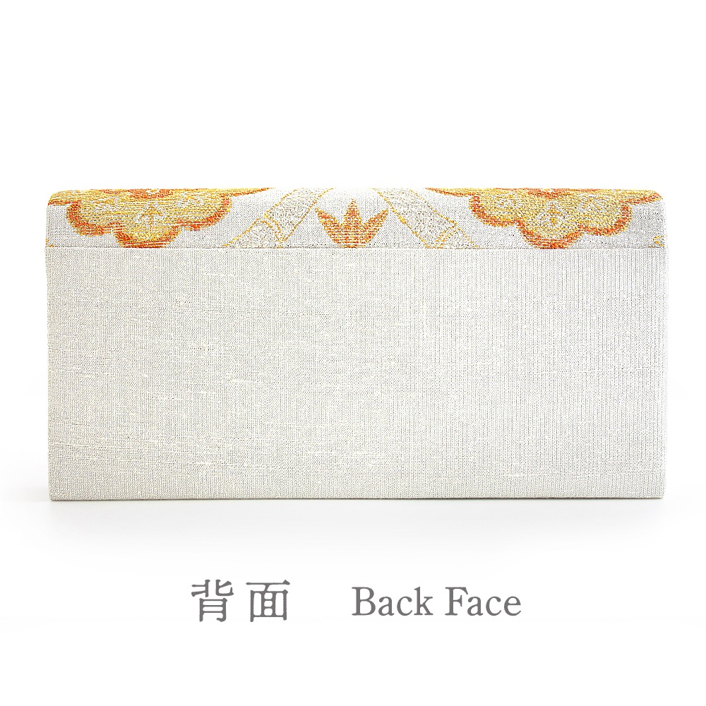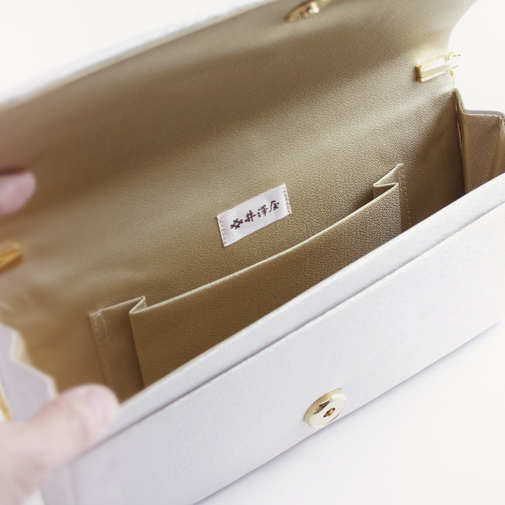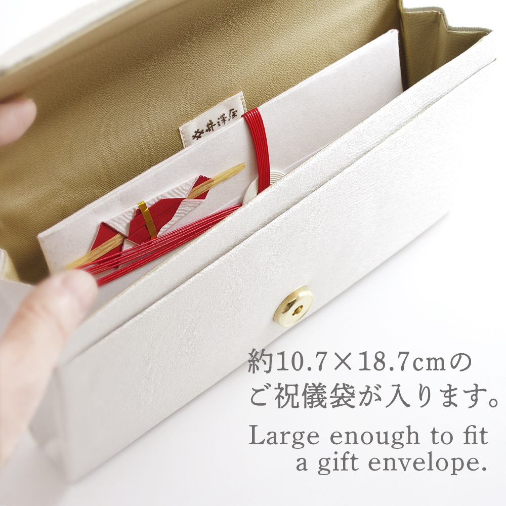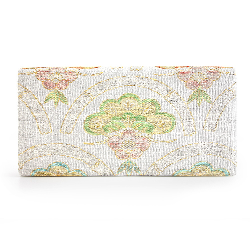 白銀地に大胆な松竹梅で青海波を表わした、煌びやかな吉祥柄の2wayタイプのパーティーバッグです。横長のスマートな形で持ちやすく、ご祝儀袋やスマホなどもゆったりと収納いただけて、和装はもちろんドレスなどの洋装に合わせていただくのも素敵です。