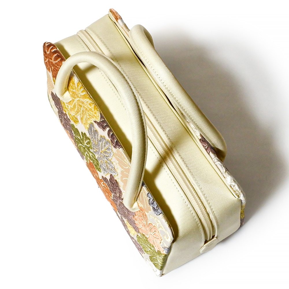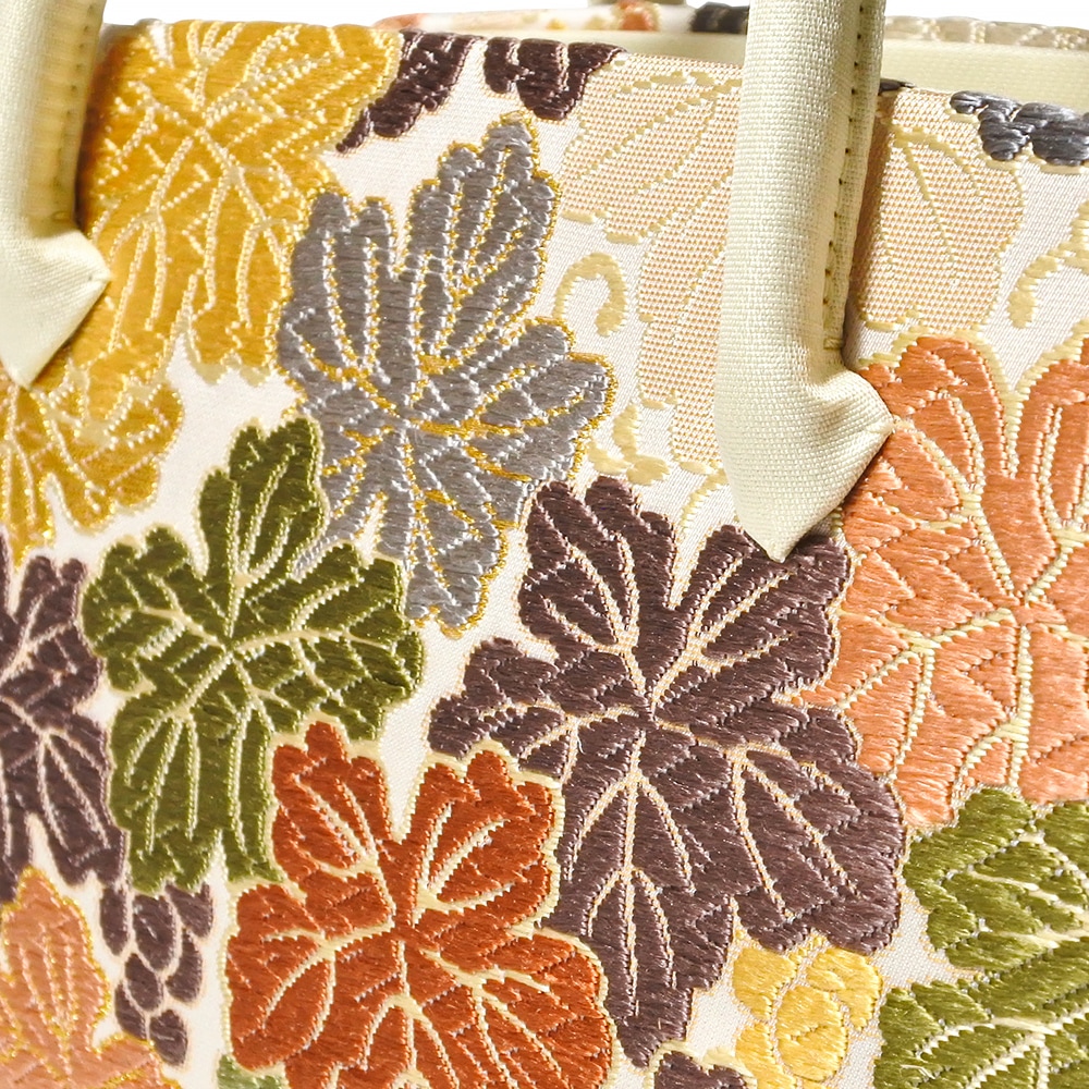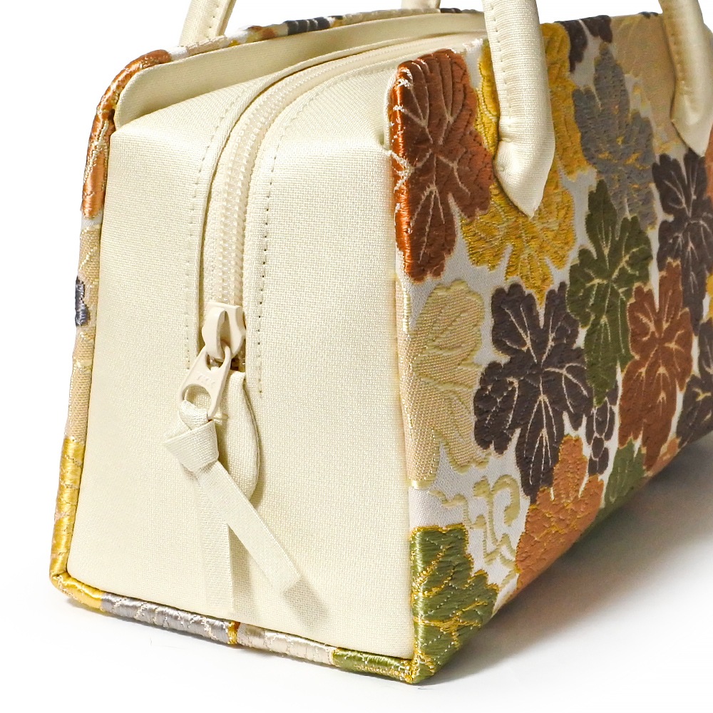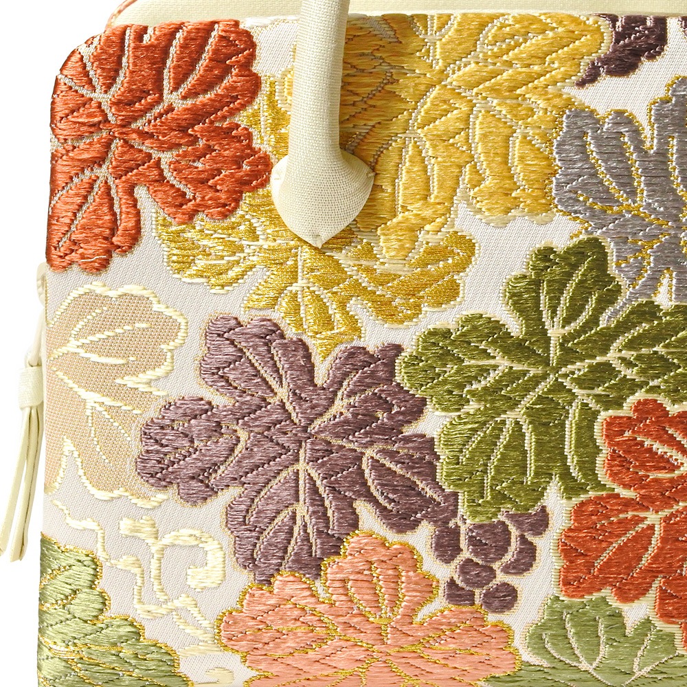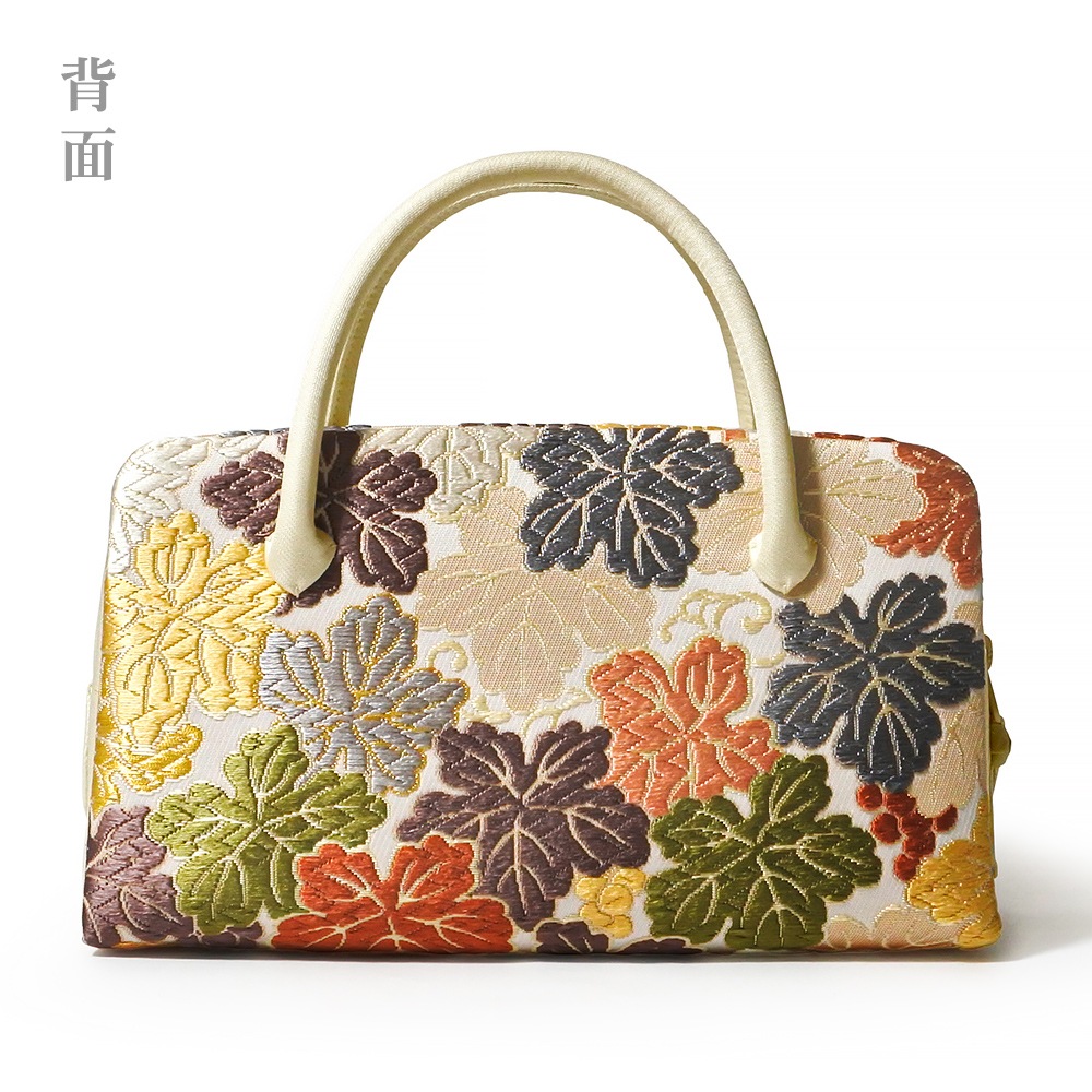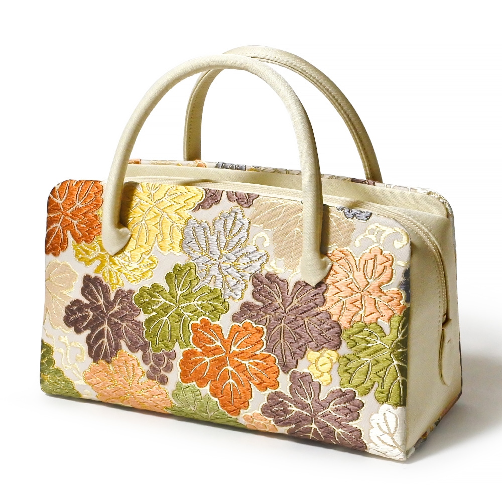 白地にカラフルなディープトーンの葡萄の葉が華やかにデザインされた、華麗な印象の和装バッグです。葉の縁取りなど、要所にさりげなく金糸が織り込まれており、配色の美しさが目を引きます。留袖や振袖などの礼装と合わせてお使いいただけるほか、洋装に合わせても違和感なくお持ちいただけます。