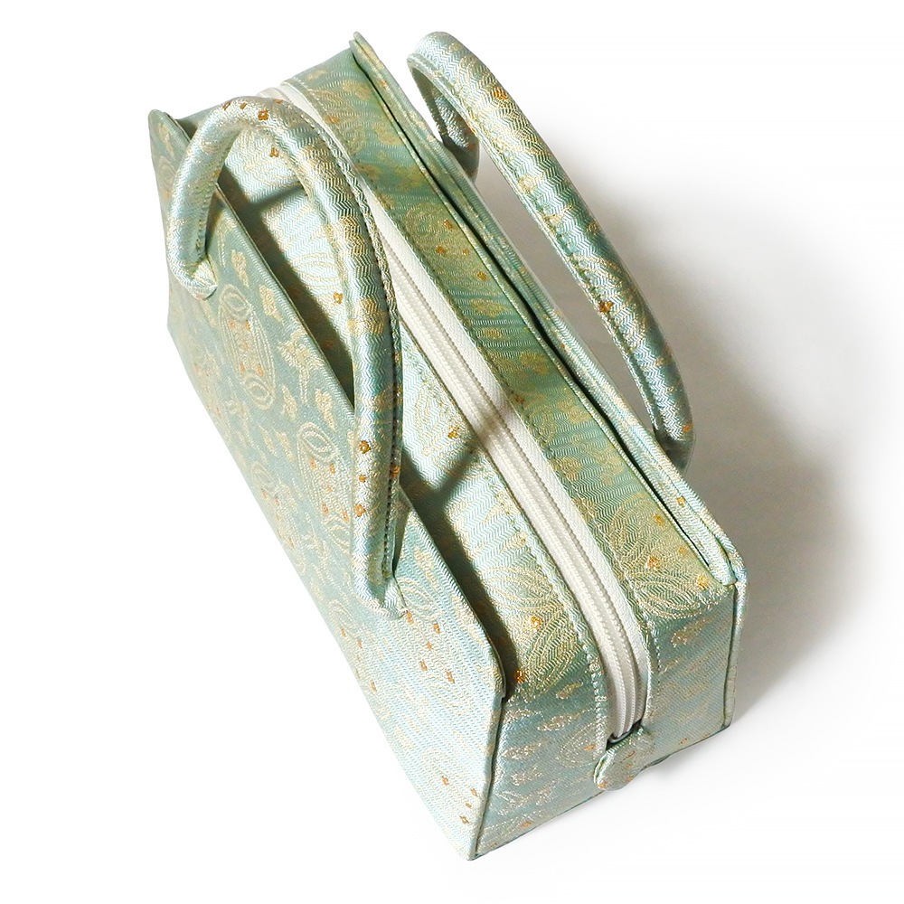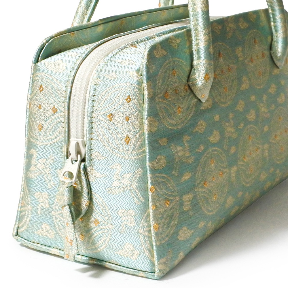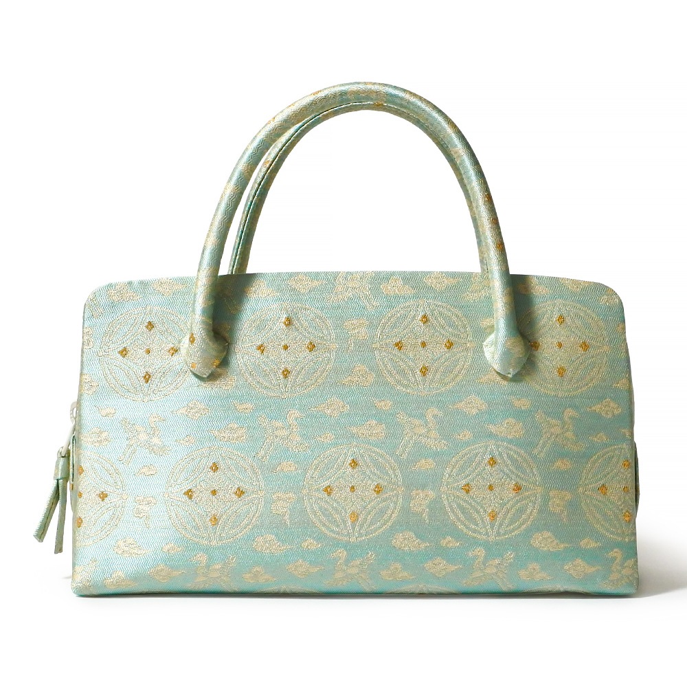 柔らかく手触りの良い紹巴(しょうは)織で織られた、名物裂の和装バッグです。光沢のある水色地に、均等に並ぶ七宝文と、雲の中を飛翔する鶴を表した雲鶴文を交互に白糸で織り込んだシンプルな配色で、落ち着いた金糸をポイントに添えました。おしゃれ着から付け下げまで合わせていただけるほか、お茶席にもお持ちいただけます。