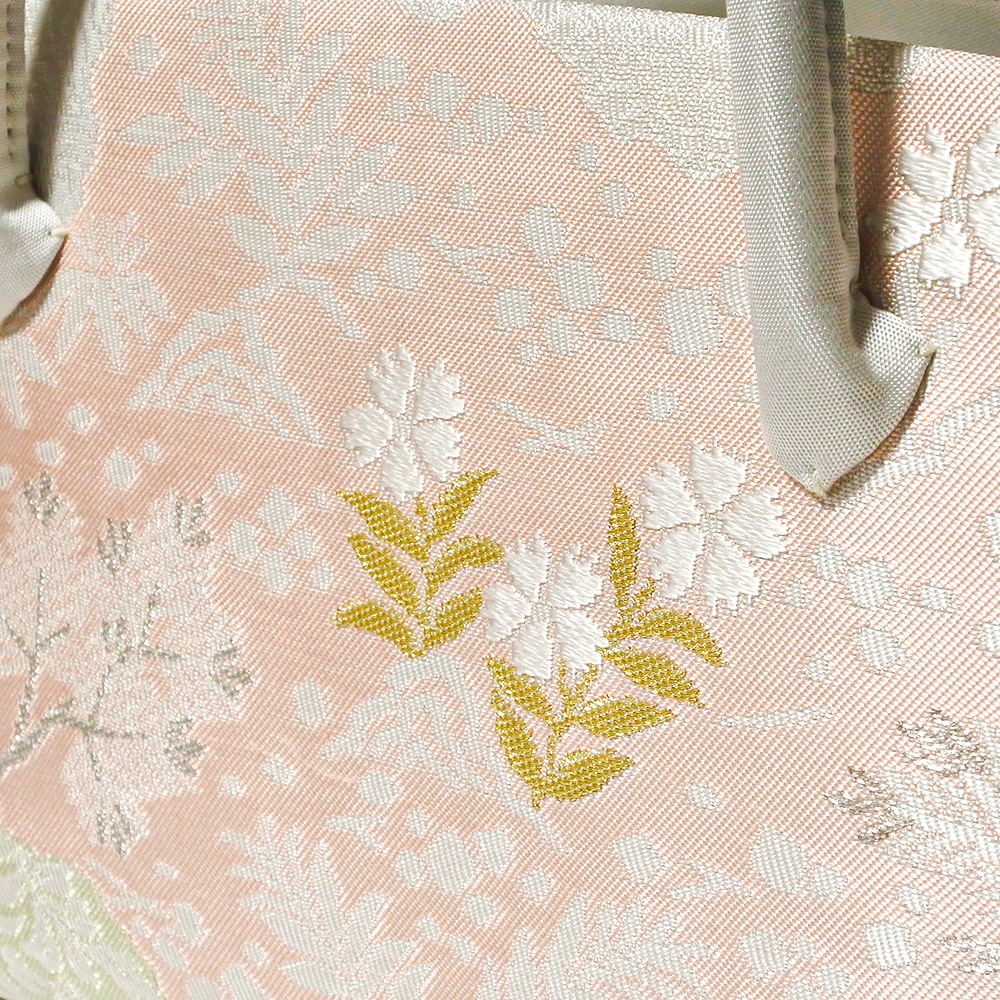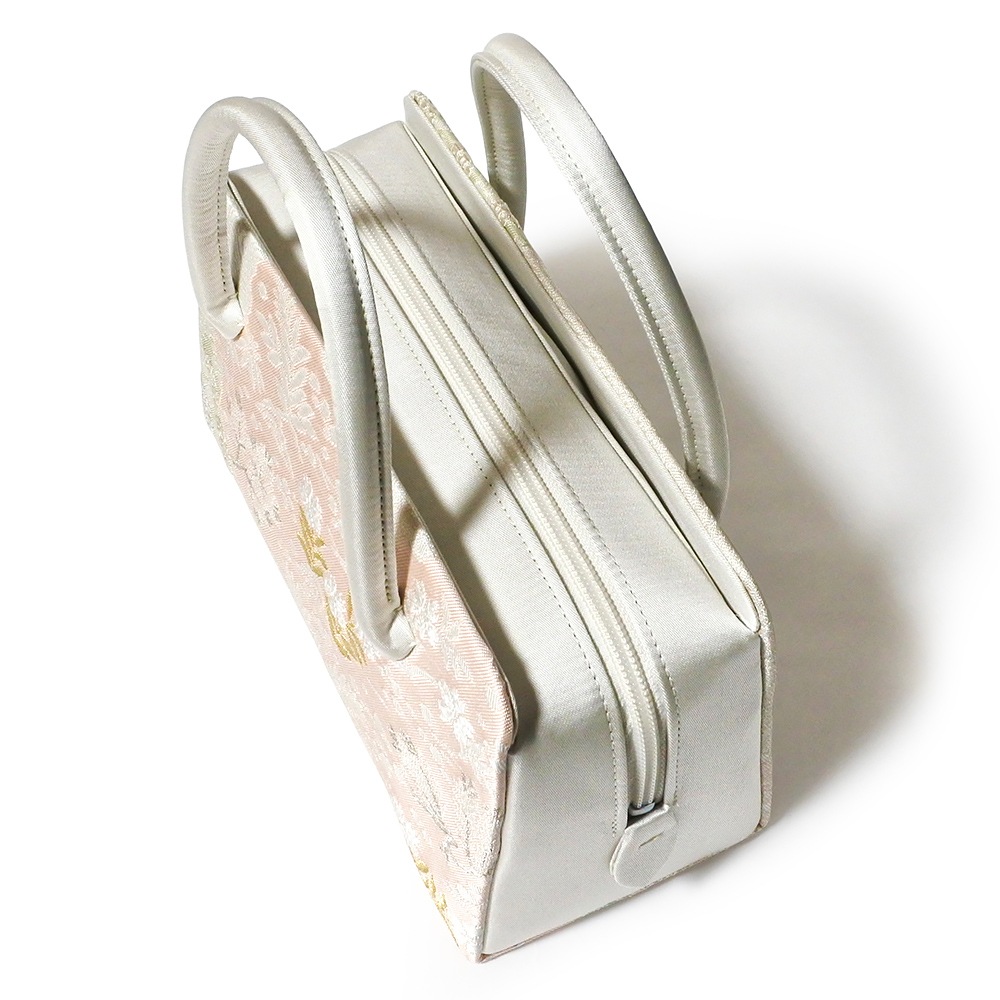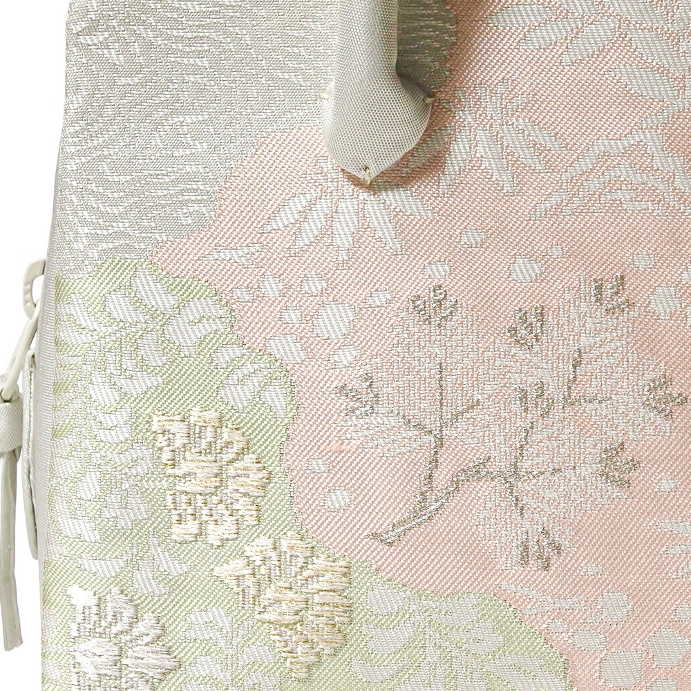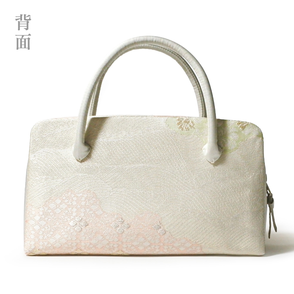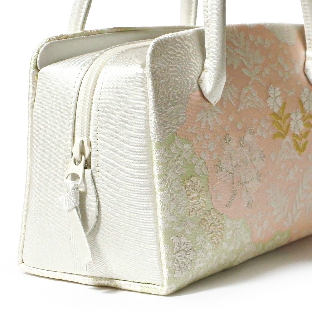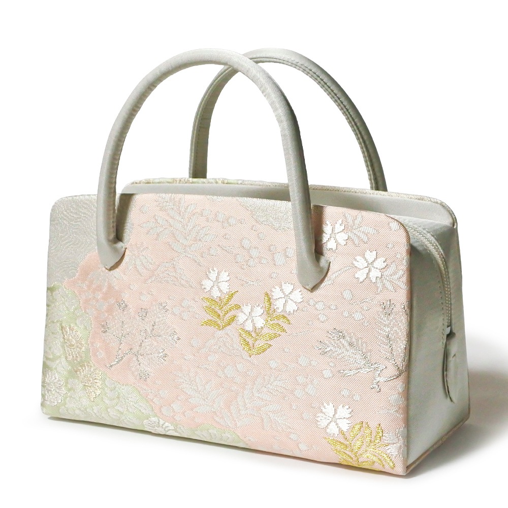 淡いピンクや緑、白などのお色で、流れるような曲線で区切られた道長取りの和装バッグです。区切られたそれぞれのお色地に、白糸や金銀糸で唐草模様やなでしこなどの花柄、波柄が織り込まれたデザイン。パステルカラーを基調とした優しい色合いがフェミニンな印象です。訪問着や留袖などの礼装と合わせてぜひどうぞ。